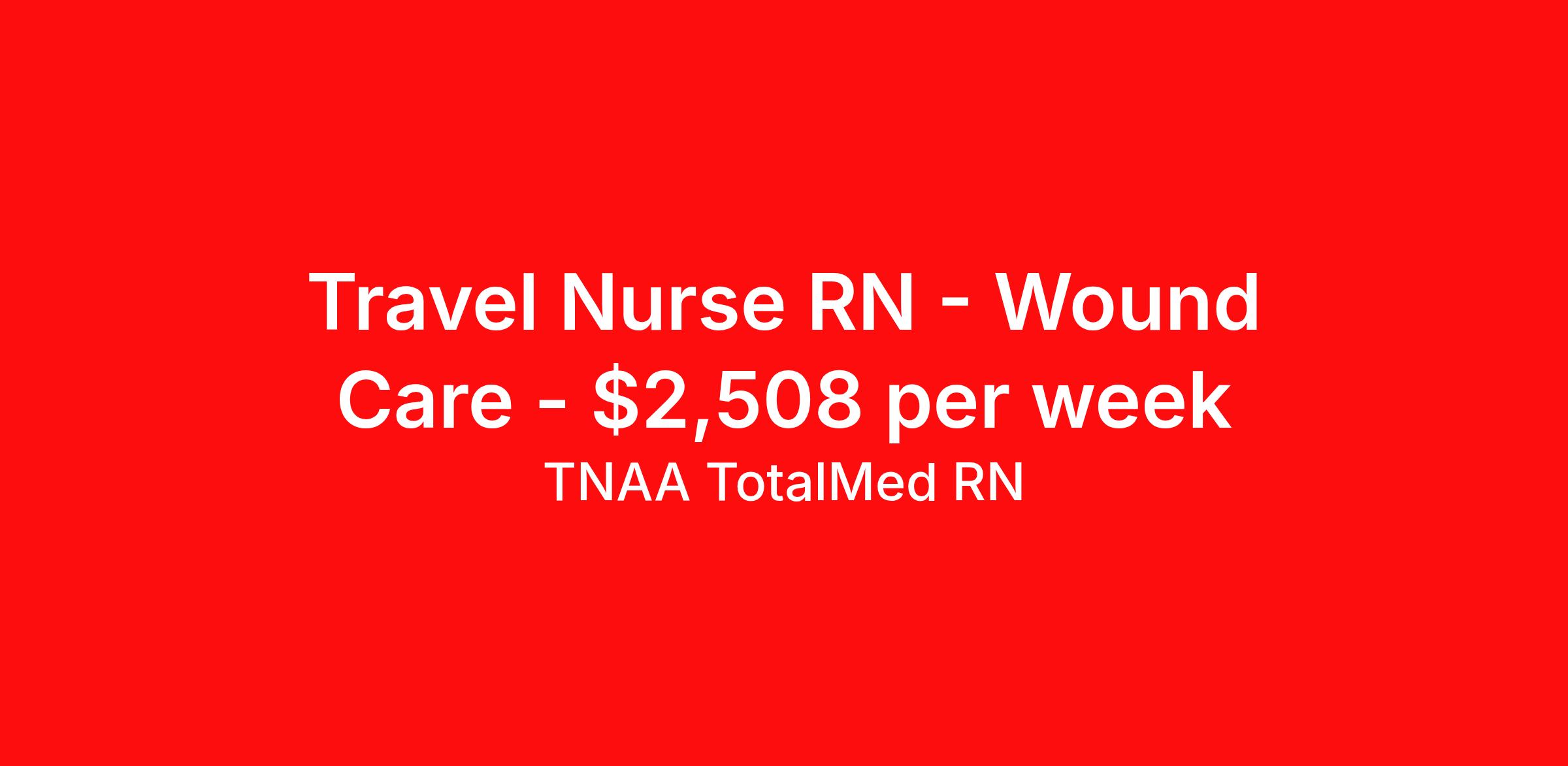 TNAA TotalMed RN is seeking a travel nurse RN Wound Care for a travel nursing job in Tacoma, Washington. Job Description & Requirements Specialty: Wound Care Discipline: RN Start Date: 04/06/2026 Duration: 13 weeks 40 hours per week Shift: 10 hours, days Employment Type: Travel About TNAA TotalMed RN TotalMed is a Top Ten, travel nursing and healthcare staffing agency with the mission of igniting purpose in healthcare. The organization staffs nurses, therapists, pharmacists, and other clinicians of all specialties in all 50 states. They offer local and travel jobs and match caregivers with the right organization to assist both facilities and patients. As an organization, they focus on putting highly-skilled staff into facilities to ensure adequate staffing for a better patient experience. TotalMed specializes in recruiting and placing healthcare professionals in travel, PRN, and permanent positions across the country in Nursing and Allied Health. Throughout 2020, the organization filled roles at even the most short-staffed facilities during the most challenging time in healthcare. By matching the right travel healthcare professional with the right organization, TotalMed continues to offer a lifeline to facilities and their patients. Benefits Weekly pay Guaranteed Hours Continuing Education 401k retirement plan Sick pay Wellness and fitness programs Referral bonus Employee assistance programs Medical benefits Dental benefits Vision benefits Benefits start day 1