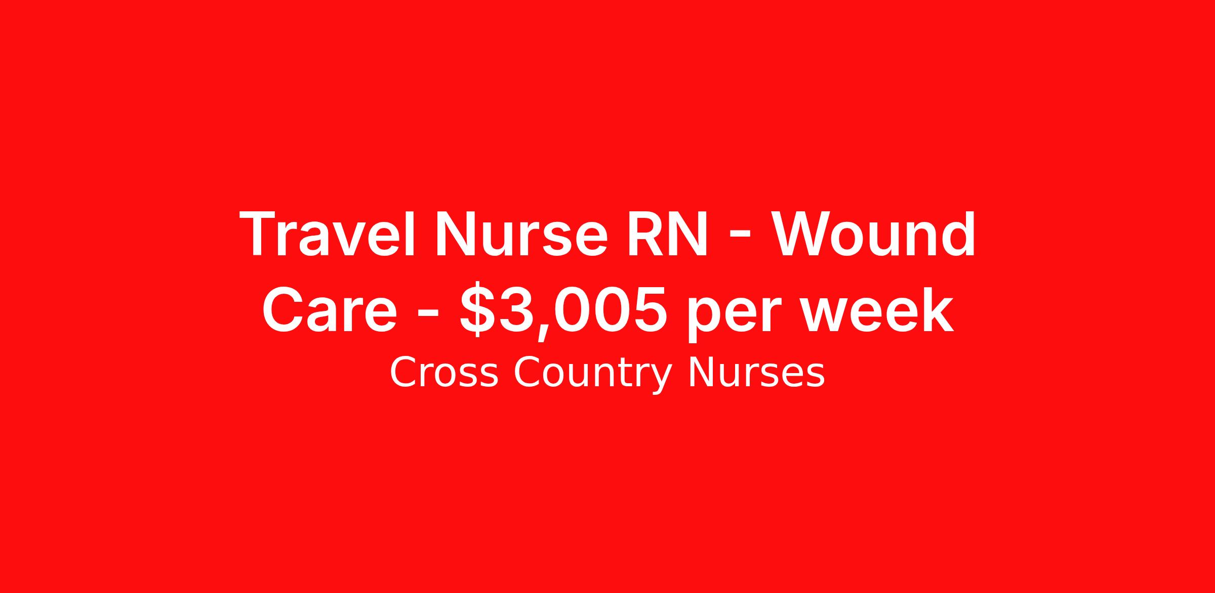 Cross Country Nurses is seeking a travel nurse RN Wound Care for a travel nursing job in Templeton, California. Job Description & Requirements Specialty: Wound Care Discipline: RN Start Date: 04/13/2026 Duration: 13 weeks 40 hours per week Shift: 10 hours, days Employment Type: Travel Job Description As a registered nurse - wound care (RN), you'll treat patients who have acute or chronic wounds, including chemical or thermal burns, ulcers, skin tears and diabetic foot wounds. Working at a hospital, wound care center, assisted living facility, home health setting, clinic, or other healthcare setting, you'll collaborate with physicians and other care team members to help prevent disease and promote healing. Your responsibilities may include evaluating, debriding, disinfecting, treating and bandaging wounds, as well as administering antibiotics and pain medications. You'll play an essential role in providing moral support and education for your patients. Minimum Requirements At least 1 year of recent acute care experience in specialty Active RN license Benefits The benefits of taking a travel nursing job with Cross Country include: Private housing or generous housing allowance Comprehensive health insurance with prescription coverage Dependent health insurance with prescription coverage Competitive salaries Referral bonuses Travel reimbursement 401(k) retirement plan Direct deposit/free checking Unlimited free CE credits Cross Country Job ID 1237132. Pay package is based on 10 hour shifts and 40 hours per week (subject to confirmation) with tax-free stipend amount to be determined. Posted job title: Registered Nurse / Wound Care About Cross Country Nurses You care for others — we’re here to care for you. At Cross Country, we know travel nursing is about more than just the job. It’s about building a career that supports your lifestyle, your values, and your impact. We offer competitive pay, full benefits, and 24/7 support from a team that truly understands what it means to be on the front lines. Wherever your journey takes you, we’re with you every step of the way. Let’s build your best life — one assignment at a time. Benefits 401k retirement plan Referral bonus