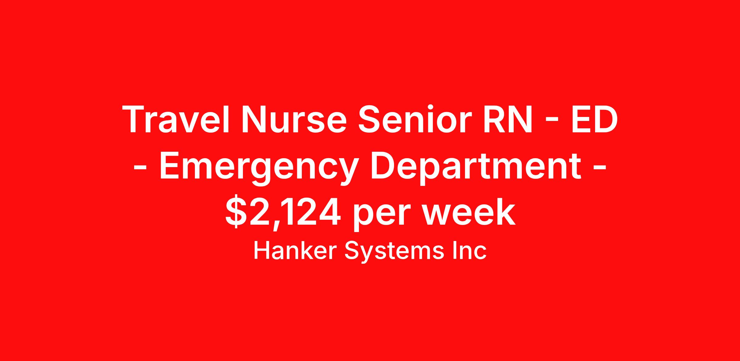 Hanker Systems Inc is seeking a travel nurse RN ED - Emergency Department Senior for a travel nursing job in Amsterdam, New York. Job Description & Requirements Specialty: ED - Emergency Department Discipline: RN Duration: 13 weeks 36 hours per week Shift: 12 hours, nights Employment Type: Travel Job Description A facility in Amsterdam, NY is looking for an Emergency Room Registered Nurse (ER RN) with minimum 2 years ER experience. Requirement Basic Life Support (BLS), Advanced Cardiac Life Support (ACLS) Pediatric Advanced Life Support (PALS) NYS RN license required. Must have minimum 2 years of travel experience required. About Hanker Systems Inc Healthcare staffing at Hanker Systems Inc is focused on delivering the right talent to support quality patient care. We partner with healthcare organizations to provide skilled clinical, health IT, and administrative professionals when and where they are needed most. We follow strict compliance and credentialing standards, ensuring reliability, accuracy, and trust in every placement. Our employees play a vital role in strengthening healthcare teams, supporting clinicians, and helping organizations operate smoothly. At Hanker Systems, healthcare staffing is more than filling roles—it’s about making a real difference in patient outcomes. Benefits License and certification reimbursement Referral bonus