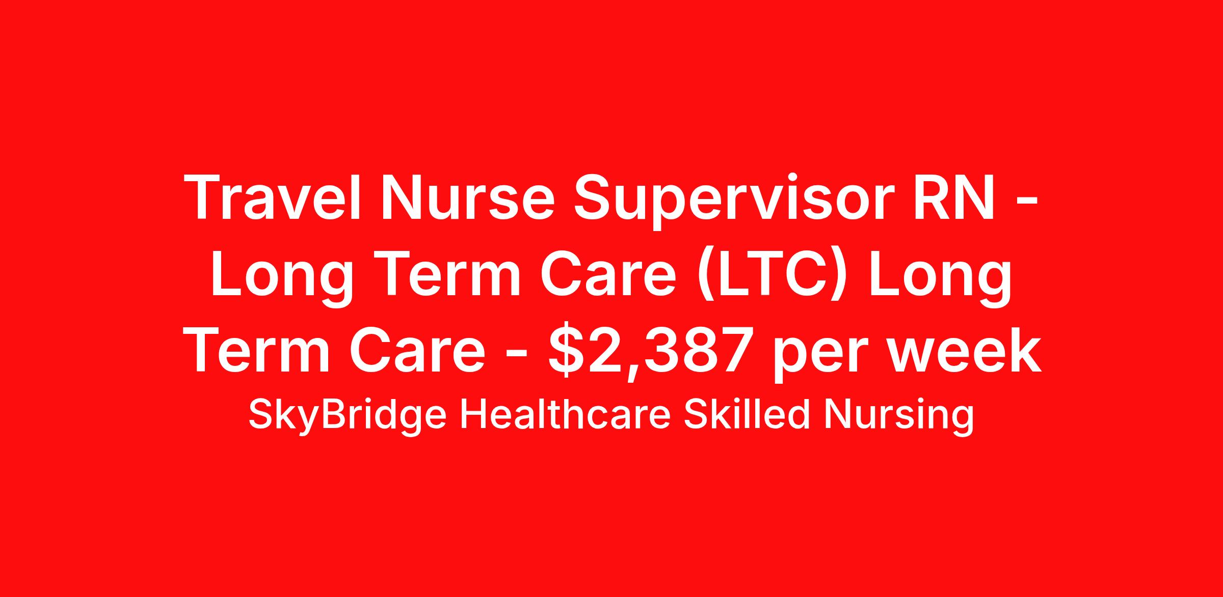 SkyBridge Healthcare Skilled Nursing is seeking a travel nurse RN Long Term Care (LTC) Long Term Care Supervisor for a travel nursing job in Jersey Shore, Pennsylvania. Job Description & Requirements Specialty: Long Term Care Discipline: RN Duration: 5 weeks 40 hours per week Shift: 8 hours, days Employment Type: Travel SkyBridge Healthcare Skilled Nursing Job ID SBHLTC030970. Pay package is based on 8 hour shifts and 40 hours per week (subject to confirmation) with tax-free stipend amount to be determined. About SkyBridge Healthcare Skilled Nursing It is our mission at SkyBridge Healthcare to connect professionals within the healthcare community through both genuine relationships and quality work. We understand the demands of healthcare positions which is why we want to give back to Healthcare Professionals who give so much to their communities. We’re partnered with some of the greatest facilities in the nation, therefore we ensure our Healthcare Professionals will receive top-notch treatment every step of the way. Our specialties include Nursing, Allied Health, Laboratory, Therapy, Healthcare Information Technology, and Revenue Cycle. Follow us on social media to stay in the know of our latest company updates and job postings. Benefits Holiday Pay 401k retirement plan Life insurance Mileage reimbursement Guaranteed Hours Referral bonus License and certification reimbursement Employee assistance programs Dental benefits Weekly pay Medical benefits Vision benefits