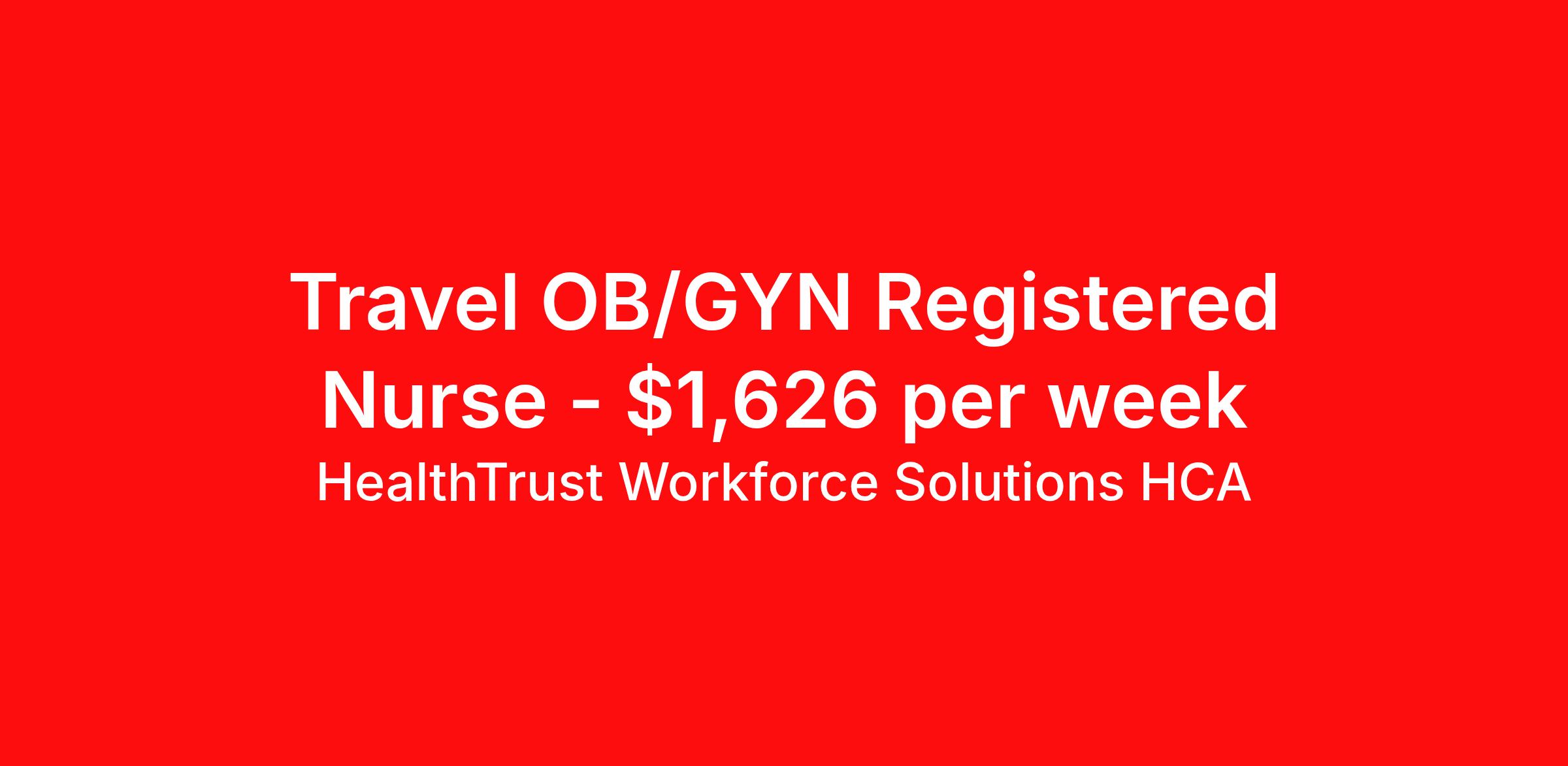 HealthTrust Workforce Solutions HCA is seeking a travel nurse RN OB/GYN for a travel nursing job in Corpus Christi, Texas. Job Description & Requirements Specialty: OB/GYN Discipline: RN Start Date: 04/13/2026 Duration: 13 weeks 36 hours per week Shift: 12 hours, days Employment Type: Travel Entrust Your Career to HealthTrust! At HealthTrust, we believe that healthcare is not defined by the four walls in which it is practiced; it’s defined by its people. We pride ourselves on crafting opportunities that expand skill sets, broaden career horizons, provide economic stability, and cultivate personal growth. HealthTrust Offers: Competitive Pay Packages Guaranteed hours Weekly direct deposit options 401k with Company Match Earn up to $750 for referrals Free Private Furnished Housing or Tax-Free Subsidy To get started, you will need: RN's a minimum of 1 year in specialty Allied 6 months of experience An adventurous spirit and fierce dedication Degree in corresponding specialty as required Appropriate certifications and licensure as needed for the specific position HealthTrust Benefits: Opportunities for a lifetime: When you become a part of the HCA family, you will have exclusive access to more opportunities than any other healthcare system in the nation. At HWS, we help open the door to a lifetime of lasting career opportunities. A culture of care: Our clinicians have made HWS an industry leader for over 25 years. We are passionate about our mission that, above all else, we are committed to the care and improvement of human life. Career Development: As a wholly owned subsidiary of HCA Healthcare, HWS is a preferred partner to thousands of top-performing hospitals. We provide our healthcare professionals with first-priority access to more than 200,000 jobs nationwide. We are uniquely positioned to offer you exclusive and direct access to HCA Healthcare’s vast network of facilities. Let us open the door to nationwide opportunities that fit your lifestyle! We are an equal opportunity employer and value diversity at our company. We do not discriminate on the basis of race, religion, color, national origin, gender, sexual orientation, age, marital status, veteran status, or disability status. Job Requirements Certifications : BLS (Required) HealthTrust Workforce Solutions HCA Job ID 994389. Posted job title: Travel Nurse - Obstetrics & Gynecology About HealthTrust Workforce Solutions HCA At HealthTrust Workforce Solutions, healthcare is not just about the four walls of a facility but about the people who provide and receive care. Our focus is on empowering healthcare professionals to deliver exceptional patient experiences by providing them with the necessary skills, tools, and support. We partner with healthcare facilities nationwide to ensure that the right professionals are in the right roles. We prioritize our clinicians by giving them a voice and access to opportunities to fulfill their mission of improving lives by providing quality patient care. We are committed to our core values of Trust, Innovation, Adaptability, Courage, and Accountability. We are dedicated to positively impacting the healthcare industry by providing first-priority access to more than 200,000 jobs nationwide to our healthcare professionals. Join us and be part of the HealthTrust family, where you can make a difference every day. We embrace our changing environment, and we maintain a culture that has a rich tradition of transforming itself to meet the challenges of the future. MISSION STATEMENT While putting great people in the right roles is essential, our mission is far greater. We want our clinicians to be part of the HealthTrust family, where healthcare professionals have a voice and are empowered with the right tools and opportunities to fulfill their personal mission of improving lives. Plus, as a preferred partner to thousands of top-performing hospitals, we provide our healthcare professionals with first-priority access to more than 200,000 jobs nationwide. Benefits Dental benefits Vision benefits Referral bonus Continuing Education Life insurance
