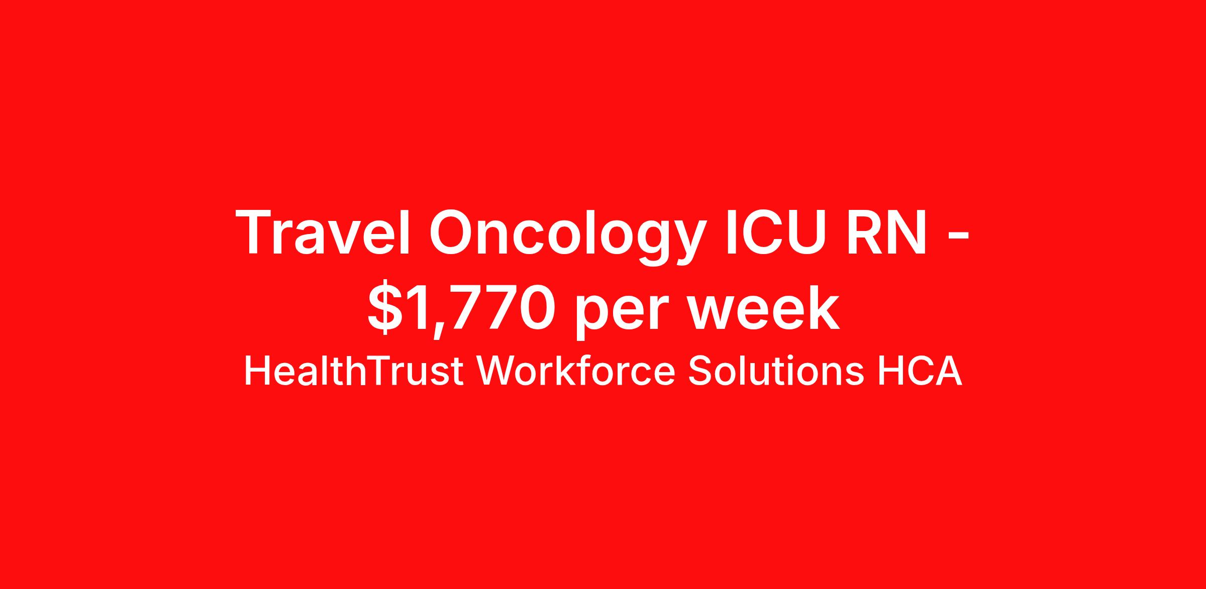 HealthTrust Workforce Solutions HCA is seeking a travel nurse RN ICU - Intensive Care Unit for a travel nursing job in Dallas, Texas. Job Description & Requirements Specialty: ICU - Intensive Care Unit Discipline: RN Duration: 13 weeks 36 hours per week Shift: 12 hours, nights Employment Type: Travel Entrust Your Career to HealthTrust! At HealthTrust, we believe that healthcare is not defined by the four walls in which it is practiced; it’s defined by its people. We pride ourselves on crafting opportunities that expand skill sets, broaden career horizons, provide economic stability, and cultivate personal growth. HealthTrust Offers: Competitive Pay Packages Guaranteed hours Weekly direct deposit options 401k with Company Match Earn up to $750 for referrals Free Private Furnished Housing or Tax-Free Subsidy To get started, you will need: RN's a minimum of 1 year in specialty Allied 6 months of experience An adventurous spirit and fierce dedication Degree in corresponding specialty as required Appropriate certifications and licensure as needed for the specific position HealthTrust Benefits: Opportunities for a lifetime: When you become a part of the HCA family, you will have exclusive access to more opportunities than any other healthcare system in the nation. At HWS, we help open the door to a lifetime of lasting career opportunities. A culture of care: Our clinicians have made HWS an industry leader for over 25 years. We are passionate about our mission that, above all else, we are committed to the care and improvement of human life. Career Development: As a wholly owned subsidiary of HCA Healthcare, HWS is a preferred partner to thousands of top-performing hospitals. We provide our healthcare professionals with first-priority access to more than 200,000 jobs nationwide. We are uniquely positioned to offer you exclusive and direct access to HCA Healthcare’s vast network of facilities. Let us open the door to nationwide opportunities that fit your lifestyle! We are an equal opportunity employer and value diversity at our company. We do not discriminate on the basis of race, religion, color, national origin, gender, sexual orientation, age, marital status, veteran status, or disability status. Job Requirements Certifications ACLS (Required) NIHSS (Required) BLS (Required) HealthTrust Workforce Solutions HCA Job ID 966163. Posted job title: Travel Nurse - Critical Care About HealthTrust Workforce Solutions HCA At HealthTrust Workforce Solutions, healthcare is not just about the four walls of a facility but about the people who provide and receive care. Our focus is on empowering healthcare professionals to deliver exceptional patient experiences by providing them with the necessary skills, tools, and support. We partner with healthcare facilities nationwide to ensure that the right professionals are in the right roles. We prioritize our clinicians by giving them a voice and access to opportunities to fulfill their mission of improving lives by providing quality patient care. We are committed to our core values of Trust, Innovation, Adaptability, Courage, and Accountability. We are dedicated to positively impacting the healthcare industry by providing first-priority access to more than 200,000 jobs nationwide to our healthcare professionals. Join us and be part of the HealthTrust family, where you can make a difference every day. We embrace our changing environment, and we maintain a culture that has a rich tradition of transforming itself to meet the challenges of the future. MISSION STATEMENT While putting great people in the right roles is essential, our mission is far greater. We want our clinicians to be part of the HealthTrust family, where healthcare professionals have a voice and are empowered with the right tools and opportunities to fulfill their personal mission of improving lives. Plus, as a preferred partner to thousands of top-performing hospitals, we provide our healthcare professionals with first-priority access to more than 200,000 jobs nationwide. Benefits Dental benefits Vision benefits Referral bonus Continuing Education Life insurance