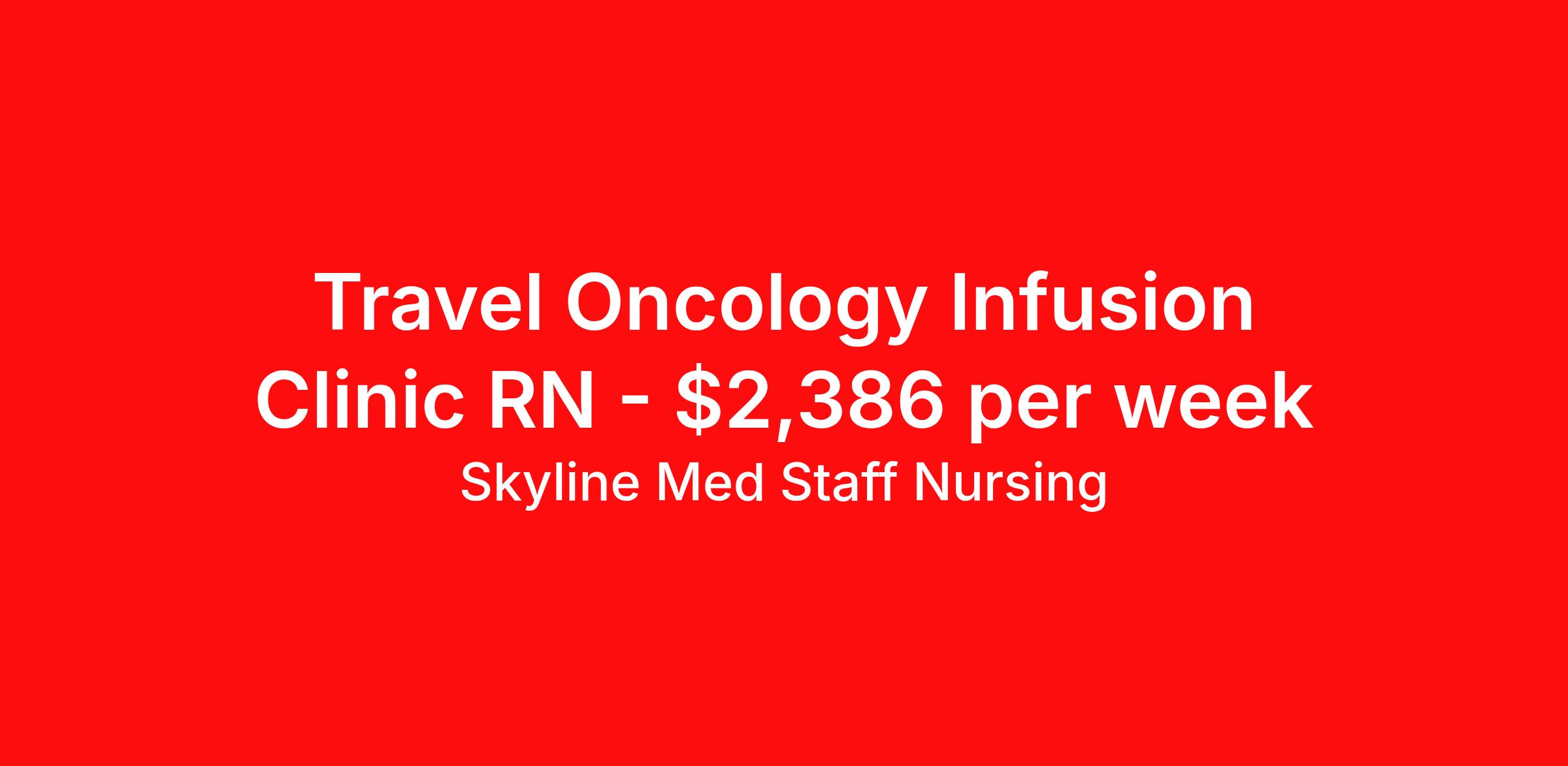 Skyline Med Staff Nursing is seeking a travel nurse RN Oncology for a travel nursing job in Tulsa, Oklahoma. Job Description & Requirements Specialty: Oncology Discipline: RN Start Date: 04/06/2026 Duration: 13 weeks 40 hours per week Shift: 8 hours, days Employment Type: Travel Weekly amount stated in job postings is an estimate based on estimated hourly wage and potential stipends available for the location of the assignment. Pay package is calculated on bill rate at the time job was posted, but can change or vary without notice. Exact pay packages might vary as this is an estimate. Our recruiter would be happy to build an exact pay package for you for each job. Skyline Med Staff Nursing Job ID 36143835. Pay package is based on 8 hour shifts and 40.0 hours per week (subject to confirmation) with tax-free stipend amount to be determined. Posted job title: RN:Oncology,07:00:00-15:00:00 About Skyline Med Staff Nursing Join the Top- Rated Travel Healthcare Team! Skyline Med Staff was named as the 1 Best Travel Healthcare Company in 2025 by BluePipes, a recognition driven by glowing reviews from travel healthcare professionals. Our recruiters are consistently praised on Google for their responsiveness, dedication, accessibility, and industry knowledge. Ready to experience the difference? Apply for a job today and see why healthcare professionals choose Skyline! Certified Women Owned Business We believe that travel is good for the soul. We want to be on your journey with you and find the right job that fits you Skyline Med Staff is committed to one vision treating others the way that THEY want to be treated. The executive team at Skyline Med Staff focuses on a commitment to quality, consistency, and the highest level of service. Our team members continually strive to build long term relationships that center on you and helping you achieve your goals. Some of the Benefits you will receive with Skyline Med Staff: Over 30 years of combined experience in the staffing industry Higher Take-Home Pay Rates Dedicated Personal Recruiter We are available to you 24/7 Health Insurance Plan Options Tax Free Per Diems, Housing Stipends and Travel Reimbursements Joint Commission Certified Contracts in all 50 states Referral and Loyalty Bonuses Benefits Medical benefits Referral bonus