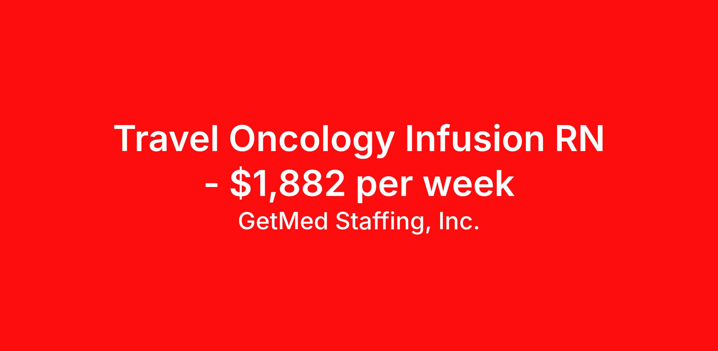 GetMed Staffing, Inc. is seeking a travel nurse RN Oncology for a travel nursing job in Lancaster, South Carolina. Job Description & Requirements Specialty: Oncology Discipline: RN Start Date: 04/06/2026 Duration: 13 weeks 40 hours per week Shift: 8 hours, days Employment Type: Travel GetMed Staffing is searching for a strong Oncology RN to assist our traveler-friendly client. A minimum of 1-2 years of experience is required. Traveling with GetMed Staffing offers the unique opportunity to gain diverse experiences, both personally and professionally. Gain experience that matters. GetMed Staffing, Inc. Job ID 36009276. Pay package is based on 8 hour shifts and 40.0 hours per week (subject to confirmation) with tax-free stipend amount to be determined. Posted job title: RN:Oncology,07:00:00-15:00:00 About GetMed Staffing, Inc. We are a diversity owned company, specializing in healthcare recruiting services. We truly understand how important a healthcare travelers' relationship is with their recruiter, as well as our relationship is with our healthcare facilities. We recognize that the needs of our healthcare travelers can vary, and therefore we provide the personalized touch necessary to ensure a successful travel assignment each and every time. Our healthcare facilities and clients benefit from us putting our healthcare travelers first. GetMed Staffing is excited to be a leader within the industry by focusing on providing healthcare travelers with more choices and possibilities as they plan for their next healthcare travel assignment. Benefits Life insurance Medical benefits Dental benefits Vision benefits 401k retirement plan