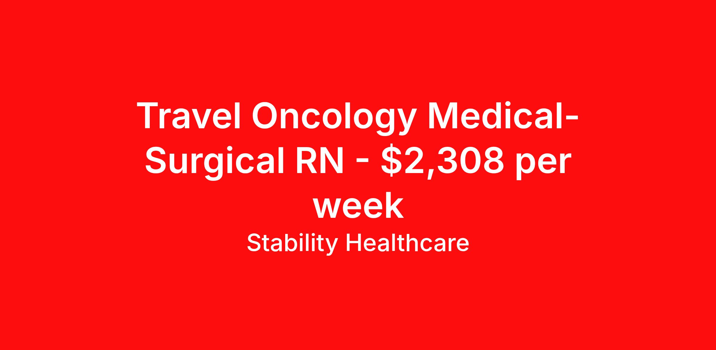 Stability Healthcare is seeking a travel nurse RN Med Surg for a travel nursing job in Springfield, Illinois. Job Description & Requirements Specialty: Med Surg Discipline: RN Start Date: 04/13/2026 Duration: 13 weeks 36 hours per week Shift: 12 hours, days Employment Type: Travel Stability Healthcare is looking for a Med-Surg RN contract position in Springfield, IL. The majority of hospitalized patients are admitted to M/S either directly or after surgery. M/S is also where patients who have been in critical care (ICU) are transferred when they no longer need critical care but still require nursing care. *$600 travel bonus *Day 1 health insurance with United Healthcare *PTO plan start accruing on day 1, use during contract or cash out at the end! *Guaranteed stipend if facility calls you off *Extra hour bonus earn an additional hourly bonus for working over your weekly contracted hours Stability Job ID 816516. Pay package is based on 12 hour shifts and 36 hours per week (subject to confirmation) with tax-free stipend amount to be determined. Posted job title: Med-Surg About Stability Healthcare Stability Healthcare was founded in 2009, with the mission of becoming the best Travel Nursing Agency in California. We have been rated one of the top travel nursing agencies and offer our nurses the highest paying travel nursing jobs available. We have access to the best travel assignments from 1000’s of facilities. You can start the year off in sunny California, spend the Spring in the Colorado Rockies, enjoy the Summer in the Mid-West, experience the change of seasons in Boston and New York, and hit the beaches of Florida in the winter. Our Nurses work in the best hospitals and health systems in the country. Benefits Guaranteed Hours Benefits start day 1