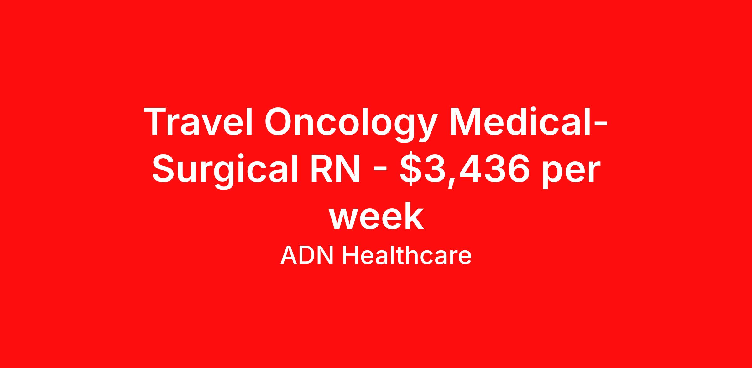ADN Healthcare is seeking a travel nurse RN Hematology / Oncology Med Surg for a travel nursing job in Springfield, Illinois. Job Description & Requirements Specialty: Hematology / Oncology Discipline: RN Start Date: 03/30/2026 Duration: 13 weeks 48 hours per week Shift: 12 hours, days Employment Type: Travel Our Client is currently seeking Med Surg for positions in Springfield, Illinois for a 4x12 Days, 07:00:00-19:00:00, 12.00-4 shift. The ideal candidate will possess a current Illinois license. This is a RN position in the MMC6220-2E ONCOLOGY. You must have a Nursing License and at least 2 years of recent experience as a RN – Med Surg. Requirements • Current Resume • Nursing License per state • Current BLS and/or ACLS and/or Specialty Certifications • 2 current clinical references • Competitive pay rates • Health/Dental Benefit package • License reimbursement • Refer a friend and earn extra cash! ADN Healthcare Job ID 35690121. Pay package is based on 12 hour shifts and 48.0 hours per week (subject to confirmation) with tax-free stipend amount to be determined. Posted job title: RN:Med Surg,07:00:00-19:00:00 About ADN Healthcare ADN Healthcare has thousands of contract and direct hire positions available. We offer medical, dental, and vision coverage. Benefits Guaranteed Hours Continuing Education Company provided housing options Mileage reimbursement Referral bonus Medical benefits Dental benefits Vision benefits License and certification reimbursement Weekly pay Life insurance Health Care FSA