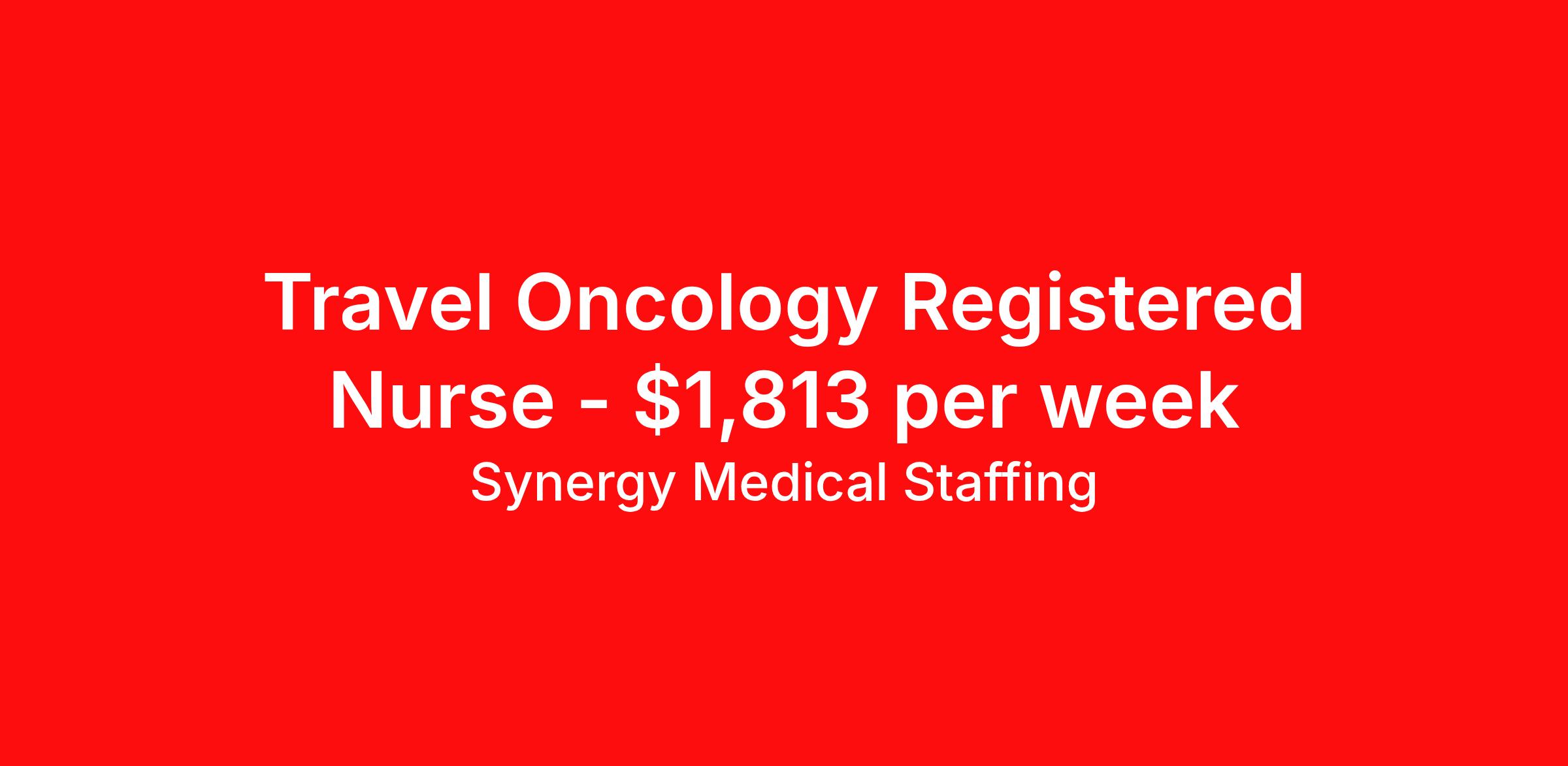 Synergy Medical Staffing is seeking a travel nurse RN Oncology for a travel nursing job in Evansville, Indiana. Job Description & Requirements Specialty: Oncology Discipline: RN Start Date: 04/12/2026 Duration: 13 weeks 36 hours per week Shift: 12 hours, nights Employment Type: Travel Travel, RN - Oncology Location: Evansville, Indiana Shift: 3X12 Nights, 19:00:00-07:00:00, 12.00-3 Duration 13 Weeks When you join Synergy Medical Staffing, you’ll have a dedicated recruiter helping you at all times. Your recruiter is a cross between a career coach and a concierge. They will help you fine-tune your resume, find your next job, and locate an apartment (even one that takes pets!). Make one call and get help with everything from placement to housing to payroll, even travel directions! As a travel, contract and permanent placement medical staffing company with over 20 years of experience in the industry, we understand your needs. Synergy’s Benefits are best in class and include the following: 401K that matches up to 5% of your pay and you are 100% vested from Day 1. Medical, Dental, Vision, Life insurance, Long and short-term disability and others Loyality Program Weekly pay Holiday Pay (varies by Assignment) Guaranteed Hours (varies by Assignment) Referral bonus Continuing Education License and certification reimbursement Synergy Medical Staffing Job ID 36017665. Pay package is based on 12 hour shifts and 36.0 hours per week (subject to confirmation) with tax-free stipend amount to be determined. Posted job title: RN:Oncology,19:00:00-07:00:00 About Synergy Medical Staffing When you join Synergy Medical Staffing, you’ll have a dedicated recruiter helping you at all times. Your recruiter is a cross between a career coach and a concierge. They will help you fine-tune your resume, find your next job, and locate an apartment (even one that takes pets!). Make one call and get help with everything from placement to housing to payroll, even travel directions! As a travel, contract and permanent placement medical staffing company with over 12 years of experience in the industry, we understand your needs. Are you interested in traveling, or just a job around the corner? Whatever your preference, you can be sure there are plenty of Nursing Jobs, Allied Jobs and Physical Therapy Jobs, Occupational Therapy Jobs, Speech Therapy Jobs and Rehab Therapy jobs anywhere you want to go. Synergy Medical Staffing professionals have been in the Medical staffing employment and staffing industry for over 12 years, and have developed solid relationships with numerous healthcare facilities nationwide. Contact us now and expand your medical career with new opportunities from Synergy Medical Staffing. Synergy’s Benefits are best in class and include the following 401K Day 1 Full Medical, Dental, Vision, Life insurance, Long and short term disability and others Student Loan Repayment and CEU reimbursement Loyalty bonus after 600 hours Benefits Discount program Weekly pay Holiday Pay Guaranteed Hours Referral bonus Medical benefits Dental benefits Continuing Education License and certification reimbursement Life insurance 401k retirement plan Cancelation protection Vision benefits