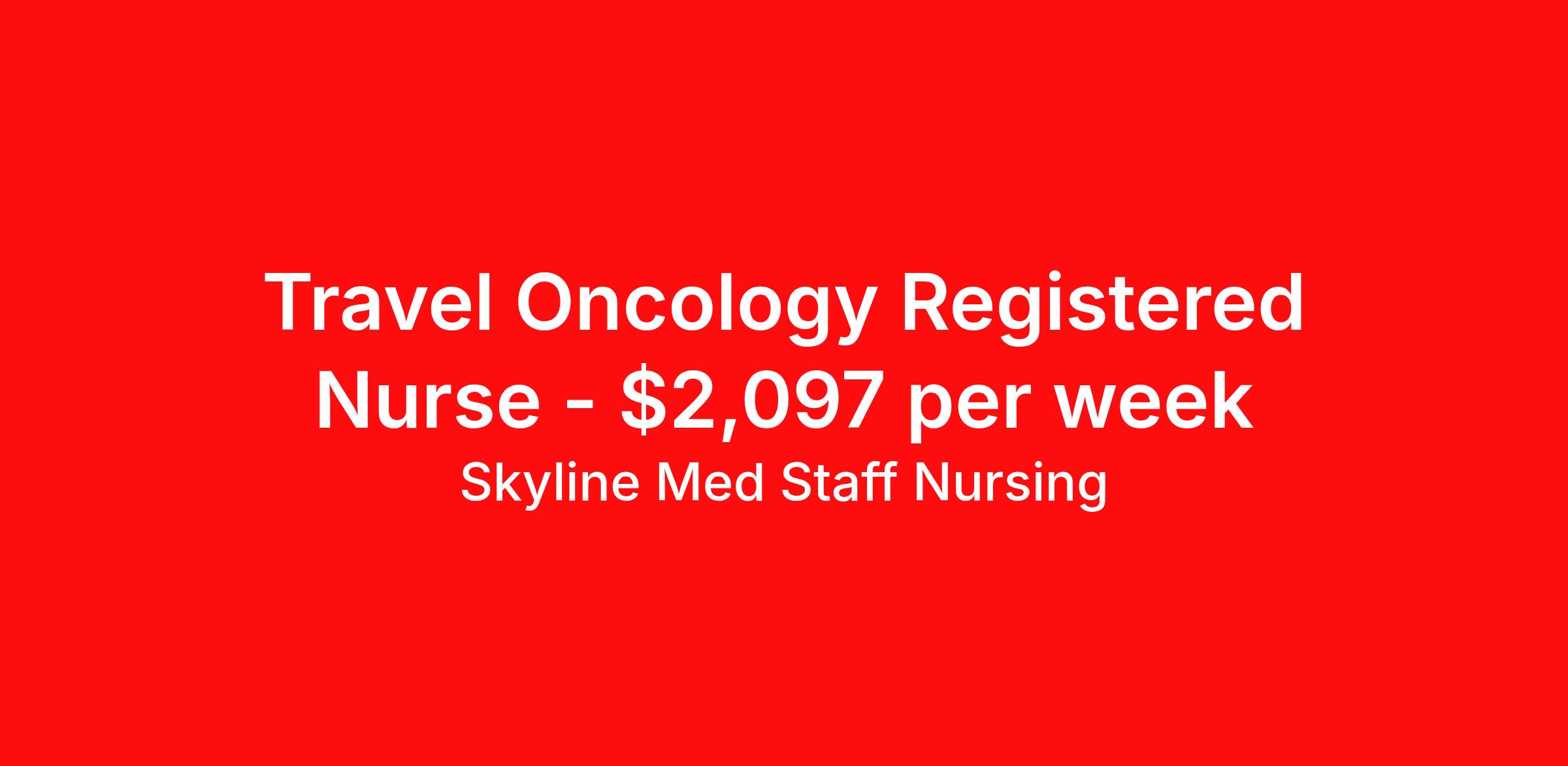 Skyline Med Staff Nursing is seeking a travel nurse RN Oncology for a travel nursing job in Kansas City, Missouri. Job Description & Requirements Specialty: Oncology Discipline: RN Start Date: 06/01/2026 Duration: 13 weeks 36 hours per week Shift: 12 hours, nights Employment Type: Travel Weekly amount stated in job postings is an estimate based on estimated hourly wage and potential stipends available for the location of the assignment. Pay package is calculated on bill rate at the time job was posted, but can change or vary without notice. Exact pay packages might vary as this is an estimate. Our recruiter would be happy to build an exact pay package for you for each job. Skyline Med Staff Nursing Job ID 36352524. Pay package is based on 12 hour shifts and 36.0 hours per week (subject to confirmation) with tax-free stipend amount to be determined. Posted job title: RN:Oncology,19:00:00-07:00:00 About Skyline Med Staff Nursing Join the Top- Rated Travel Healthcare Team! Skyline Med Staff was named as the 1 Best Travel Healthcare Company in 2025 by BluePipes, a recognition driven by glowing reviews from travel healthcare professionals. Our recruiters are consistently praised on Google for their responsiveness, dedication, accessibility, and industry knowledge. Ready to experience the difference? Apply for a job today and see why healthcare professionals choose Skyline! Certified Women Owned Business We believe that travel is good for the soul. We want to be on your journey with you and find the right job that fits you Skyline Med Staff is committed to one vision treating others the way that THEY want to be treated. The executive team at Skyline Med Staff focuses on a commitment to quality, consistency, and the highest level of service. Our team members continually strive to build long term relationships that center on you and helping you achieve your goals. Some of the Benefits you will receive with Skyline Med Staff: Over 30 years of combined experience in the staffing industry Higher Take-Home Pay Rates Dedicated Personal Recruiter We are available to you 24/7 Health Insurance Plan Options Tax Free Per Diems, Housing Stipends and Travel Reimbursements Joint Commission Certified Contracts in all 50 states Referral and Loyalty Bonuses Benefits Medical benefits Referral bonus