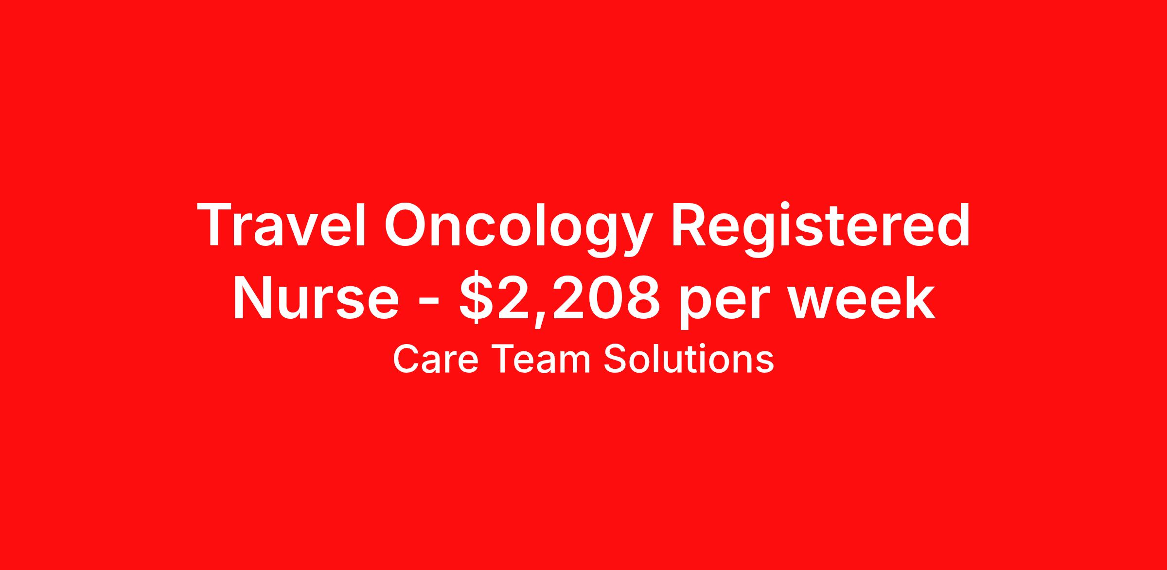 Care Team Solutions is seeking a travel nurse RN Oncology for a travel nursing job in Washington DC, District of Columbia. Job Description & Requirements Specialty: Oncology Discipline: RN Start Date: 05/11/2026 Duration: 13 weeks 40 hours per week Shift: 8 hours Employment Type: Travel Registered Nurse must have 2 years of recent experience in particular specialty Details: Must Have 2 Years of recent Oncology experience. Specialty: Oncology Discipline: Registered Nurse Start Date: 2026-05-11 Duration: 19 Weeks Shift: 40.00 Hours Day shift Hours Per Week: 40 Hours Employment Type: Contract Gross Weekly Pay: $2208.00 Six things that won’t happen if you apply to this job: You won’t have to guess what the downsides are. We’ll tell you up front. You won’t show up on day 1 and find out this is not what you signed up for. We won't leave your phone call ringing when it's inconvenient. Business hours for you are business hours for us. You won’t get shuffled to some customer service rep when a problem pops up. If we screw up something in securing your placement, we'll own it. That means it's on us to make it right. You won’t figure out your credentials alone. Our credentialing experts will walk you through it step by step. We've talked to thousands of travel nurses like you. We know you want good pay. You want to choose when you work. But the one thing nurse after nurse has said they want and don't have is someone in their corner. There's a lot in this business that’s messed up. We’re trying to be the people that fix it. You and every nurse with the guts to travel deserve it. We've worked hard for you to enjoy some one-of-a-kind benefits you'll not likely find anywhere else, because they benefit you more than they benefit us: Our early pay program Student loan reimbursement Free well-being tele-visits with a psychologist Care Team Solutions Job ID 586191. Pay package is based on 8 hour shifts and 40 hours per week (subject to confirmation) with tax-free stipend amount to be determined. Posted job title: Registered Nurse (RN)-Oncology | Other Area(s) About Care Team Solutions Two brothers who give an enormous damn. We're Justin and Kyle. Neither of us are nurses. It doesn’t take a nurse to see that the way travel nurses are treated sucks. Nursing is already hard enough. Travel nursing takes serious guts. You get the toughest assignments in places you’ve never been. Which can be fun, but it’s also stressful. You’re in your element but outside of your hometown. You can be a stranger on the team. If anyone deserves someone in their corner, it’s you. But that’s not how most agencies operate. Which is why travel nurses hate working with them. We got into this business because we saw bucket-loads of nurses moving through the "churn and burn" travel machinery. We absolutely hate that. You'll do your best work when you have the placements you want and feel fully supported in your work. We pay our people well because we want them to treat you well. Our recruiters are amazing (we picked each of them ourselves), but if you've got a problem too big for them, they can come straight to us. We work like ten feet away. The "Churners and Burners" promise you the same benefits. They might as well copy/paste them from each other. We have them too: 401k, holiday pay, healthcare, dental, travel reimbursement, etc But we've worked hard for you to enjoy some one-of-a-kind benefits you'll not likely find anywhere else, because they benefit you more than they benefit us: Our early pay program Student loan reimbursement Free well-being tele-visits with a psychologist Benefits Weekly pay Holiday Pay Guaranteed Hours 401k retirement plan Wellness and fitness programs Referral bonus Medical benefits Dental benefits Vision benefits School loan reimbursement