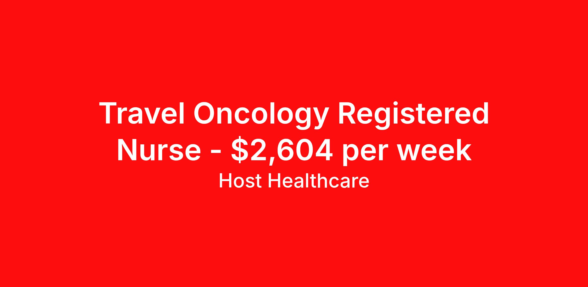 Host Healthcare is seeking a travel nurse RN Oncology for a travel nursing job in Wichita, Kansas. Job Description & Requirements Specialty: Oncology Discipline: RN Start Date: 04/26/2026 Duration: 13 weeks 48 hours per week Shift: 12 hours, nights Employment Type: Travel Host Healthcare Job ID a1fVX000002uwcrYAA. Pay package is based on 12 hour shifts and 48 hours per week (subject to confirmation) with tax-free stipend amount to be determined. Posted job title: RN - Oncology About Host Healthcare At Host Healthcare, we provide a truly comfortable experience as you explore your travel nursing, therapy, or allied career. We make your travel healthcare journey easy by taking care of all the details, so you don’t have to. We are on a mission to help others live better and we do this by helping the healers of the world be as comfortable as possible. With access to tens of thousands of travel nursing, therapy, and allied jobs in all 50 states, our responsive and friendly recruiters find your dream position based on what’s important to you. During your assignment, get access to premium benefits, including Day 1 medical that continues up to 30 days between assignments, 401K matching, travel reimbursements, dedicated housing support, and more. We also offer 24/7 support from our team and access to our on-staff clinicians so you can feel comfortable and confident throughout your entire assignment. Travel comfortably with Host Healthcare. Benefits Referral bonus School loan reimbursement Vision benefits Wellness and fitness programs Company provided housing options License and certification reimbursement Life insurance Medical benefits Mileage reimbursement Pet insurance Discount program Employee assistance programs Guaranteed Hours Health savings account Holiday Pay 401k retirement plan Continuing Education Dental benefits