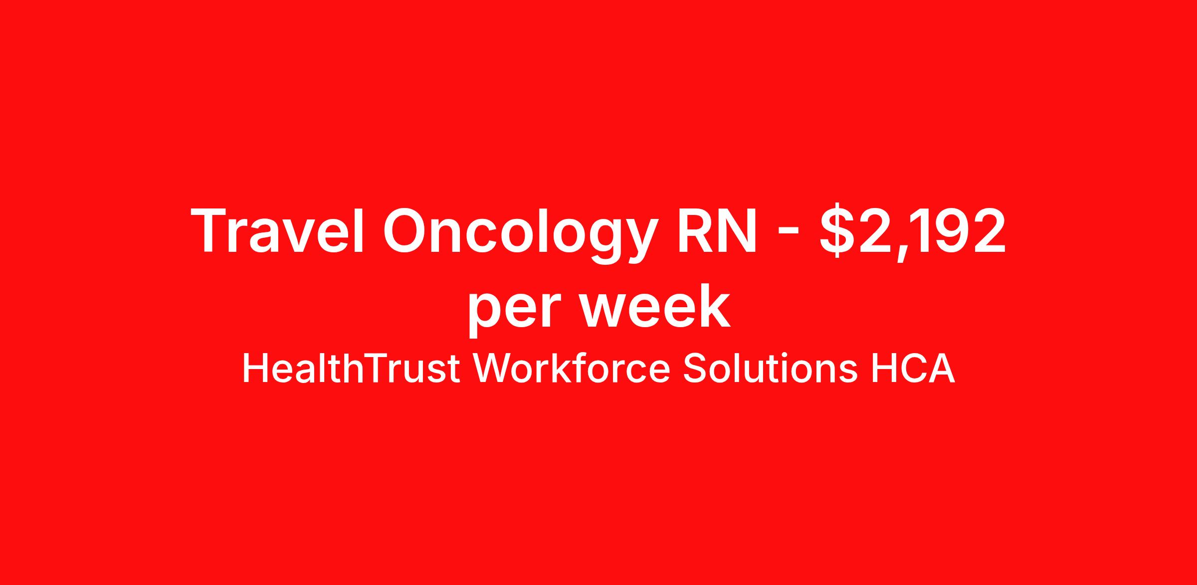 HealthTrust Workforce Solutions HCA is seeking a travel nurse RN Oncology for a travel nursing job in Asheville, North Carolina. Job Description & Requirements Specialty: Oncology Discipline: RN Duration: 13 weeks 36 hours per week Shift: 12 hours, days Employment Type: Travel Entrust Your Career to HealthTrust! At HealthTrust, we believe that healthcare is not defined by the four walls in which it is practiced; it’s defined by its people. We pride ourselves on crafting opportunities that expand skill sets, broaden career horizons, provide economic stability, and cultivate personal growth. HealthTrust Offers: Competitive Pay Packages Guaranteed hours Weekly direct deposit options 401k with Company Match Earn up to $750 for referrals Free Private Furnished Housing or Tax-Free Subsidy To get started, you will need: RN's a minimum of 1 year in specialty Allied 6 months of experience An adventurous spirit and fierce dedication Degree in corresponding specialty as required Appropriate certifications and licensure as needed for the specific position HealthTrust Benefits: Opportunities for a lifetime: When you become a part of the HCA family, you will have exclusive access to more opportunities than any other healthcare system in the nation. At HWS, we help open the door to a lifetime of lasting career opportunities. A culture of care: Our clinicians have made HWS an industry leader for over 25 years. We are passionate about our mission that, above all else, we are committed to the care and improvement of human life. Career Development: As a wholly owned subsidiary of HCA Healthcare, HWS is a preferred partner to thousands of top-performing hospitals. We provide our healthcare professionals with first-priority access to more than 200,000 jobs nationwide. We are uniquely positioned to offer you exclusive and direct access to HCA Healthcare’s vast network of facilities. Let us open the door to nationwide opportunities that fit your lifestyle! We are an equal opportunity employer and value diversity at our company. We do not discriminate on the basis of race, religion, color, national origin, gender, sexual orientation, age, marital status, veteran status, or disability status. Job Requirements Certifications : BLS (Required) HealthTrust Workforce Solutions HCA Job ID 982797. Posted job title: Travel Nurse - Oncology About HealthTrust Workforce Solutions HCA At HealthTrust Workforce Solutions, healthcare is not just about the four walls of a facility but about the people who provide and receive care. Our focus is on empowering healthcare professionals to deliver exceptional patient experiences by providing them with the necessary skills, tools, and support. We partner with healthcare facilities nationwide to ensure that the right professionals are in the right roles. We prioritize our clinicians by giving them a voice and access to opportunities to fulfill their mission of improving lives by providing quality patient care. We are committed to our core values of Trust, Innovation, Adaptability, Courage, and Accountability. We are dedicated to positively impacting the healthcare industry by providing first-priority access to more than 200,000 jobs nationwide to our healthcare professionals. Join us and be part of the HealthTrust family, where you can make a difference every day. We embrace our changing environment, and we maintain a culture that has a rich tradition of transforming itself to meet the challenges of the future. MISSION STATEMENT While putting great people in the right roles is essential, our mission is far greater. We want our clinicians to be part of the HealthTrust family, where healthcare professionals have a voice and are empowered with the right tools and opportunities to fulfill their personal mission of improving lives. Plus, as a preferred partner to thousands of top-performing hospitals, we provide our healthcare professionals with first-priority access to more than 200,000 jobs nationwide. Benefits Dental benefits Vision benefits Referral bonus Continuing Education Life insurance