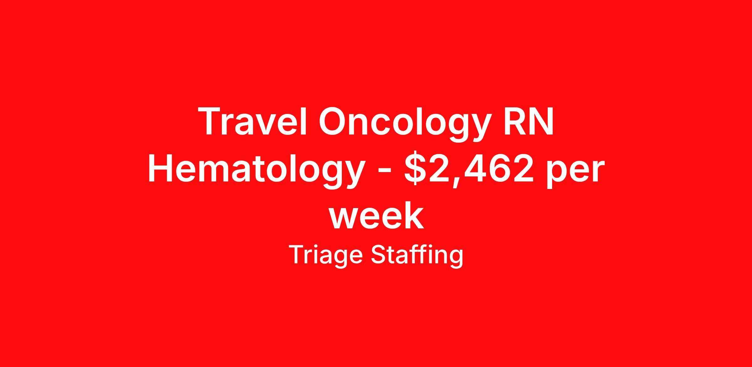 Triage Staffing is seeking a travel nurse RN Hematology / Oncology for a travel nursing job in Oklahoma City, Oklahoma. Job Description & Requirements Specialty: Hematology / Oncology Discipline: RN Start Date: ASAP Duration: 13 weeks 36 hours per week Shift: 12 hours, days Employment Type: Travel Travel Nursing: Oncology Oklahoma City Location: Oklahoma City Start Date: 3/9/2026 Shift Details: 12H Days 36 hours per week Length: 13 WEEKS Apply for specific facility details.Oncology RN Triage Staffing Job ID VP6AQJNH. Posted job title: Nursing: Oncology About Triage Staffing At Triage, we prefer to be real . Real about expectations—both ours and yours. Real about how a decision you make today could affect your tomorrows. Real about how compensation actually works. Real about how great—or grating—your next supervisor may be. Being real allows everyone at Triage to be ready . Ready to serve you with real honesty. So if that gig near the ocean is really no day at the beach, or that third shift comes with a second-class rate, we tell you. So you can be ready, too. We staff all five major divisions of acute care—nursing, lab, radiology, cardiopulmonary and rehab therapy, offering: - Competitive, custom pay packages - One point of contact for both travelers and facilities (per division) - A reliable recruiter who's got your back throughout your entire assignment - In-house compliance and accounting specialists - A clinical liaison team available 24/7 to offer medical and professional support and career development - A mentoring program that is run and managed by actual clinicians—yeah, you read that right - And more (because of course there’s more) Are we the biggest? No. Are we the best? That’s rather subjective, but we’re trying to be. Will we work like hell to get you as close to your idea of heaven as possible? Yes. Yes, we will. Benefits: Day One comprehensive, nationwide insurance plans for health, vision and dental and life—including a HSA option Day One 401(k) program with employer-matching contributions once eligible Facility cancelling protection—your time is money on and off-the-clock Guaranteed hours Weekly paychecks via direct deposit Earned vacation bonuses for time worked Paid holidays Employee assistance program (EAP)—your mental health is important, too Continuing education, certification and licensing reimbursement Workers comp—because accidents happen Top-rated professional liability insurance Company provided housing options Referral bonus—$750 in your pocket after they’ve completed a 13-week assignment