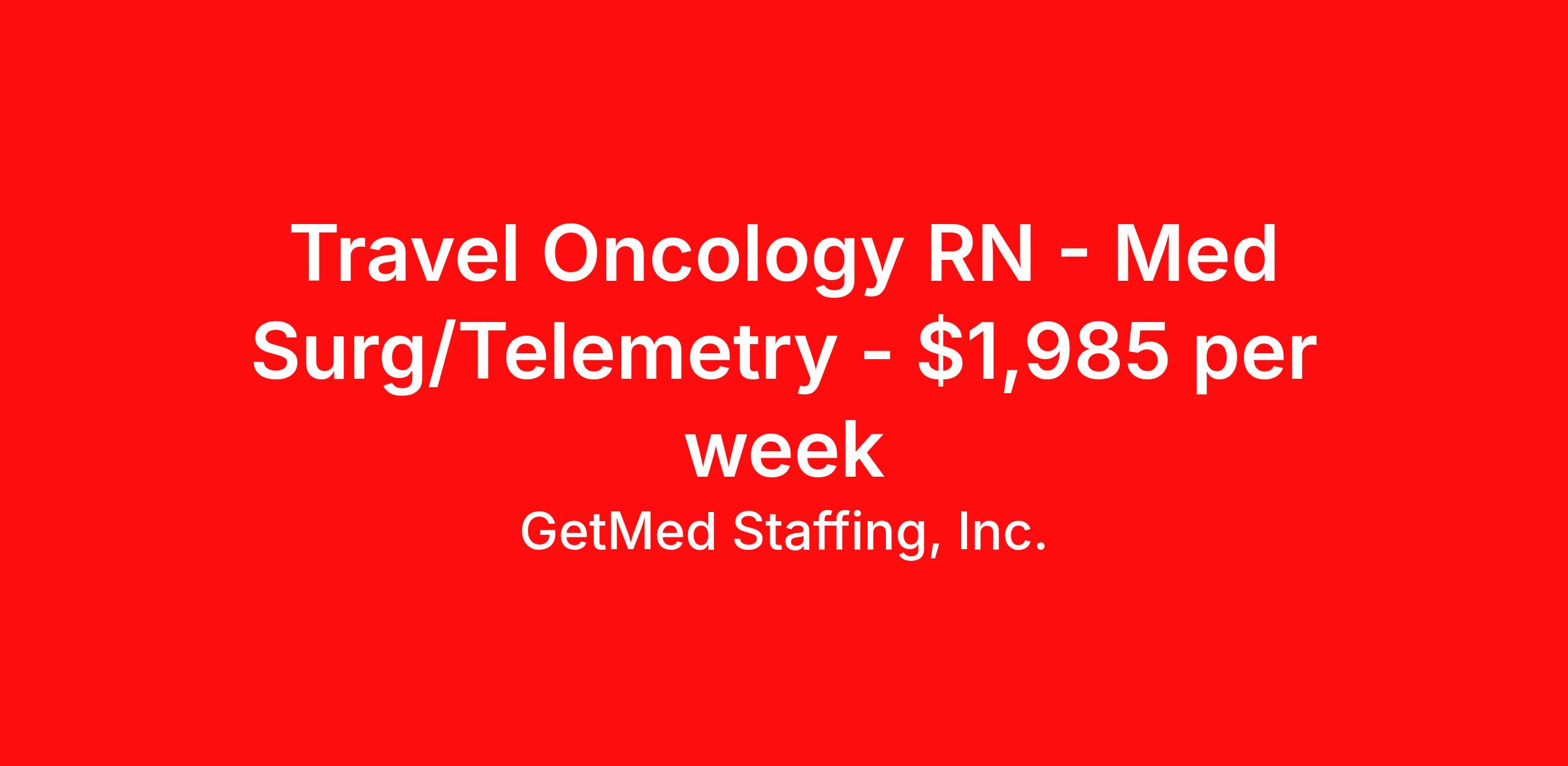 GetMed Staffing, Inc. is seeking a travel nurse RN Telemetry for a travel nursing job in Columbus, Ohio. Job Description & Requirements Specialty: Telemetry Discipline: RN Start Date: 04/20/2026 Duration: 16 weeks 36 hours per week Shift: 12 hours, days Employment Type: Travel GetMed Staffing is searching for a strong Telemetry RN to assist our traveler-friendly client. A minimum of 1-2 years of experience is required. Traveling with GetMed Staffing offers the unique opportunity to gain diverse experiences, both personally and professionally. Gain experience that matters. GetMed Staffing, Inc. Job ID 36051425. Pay package is based on 12 hour shifts and 36.0 hours per week (subject to confirmation) with tax-free stipend amount to be determined. Posted job title: RN:Telemetry,07:00:00-07:00:00 About GetMed Staffing, Inc. We are a diversity owned company, specializing in healthcare recruiting services. We truly understand how important a healthcare travelers' relationship is with their recruiter, as well as our relationship is with our healthcare facilities. We recognize that the needs of our healthcare travelers can vary, and therefore we provide the personalized touch necessary to ensure a successful travel assignment each and every time. Our healthcare facilities and clients benefit from us putting our healthcare travelers first. GetMed Staffing is excited to be a leader within the industry by focusing on providing healthcare travelers with more choices and possibilities as they plan for their next healthcare travel assignment. Benefits Life insurance Medical benefits Dental benefits Vision benefits 401k retirement plan