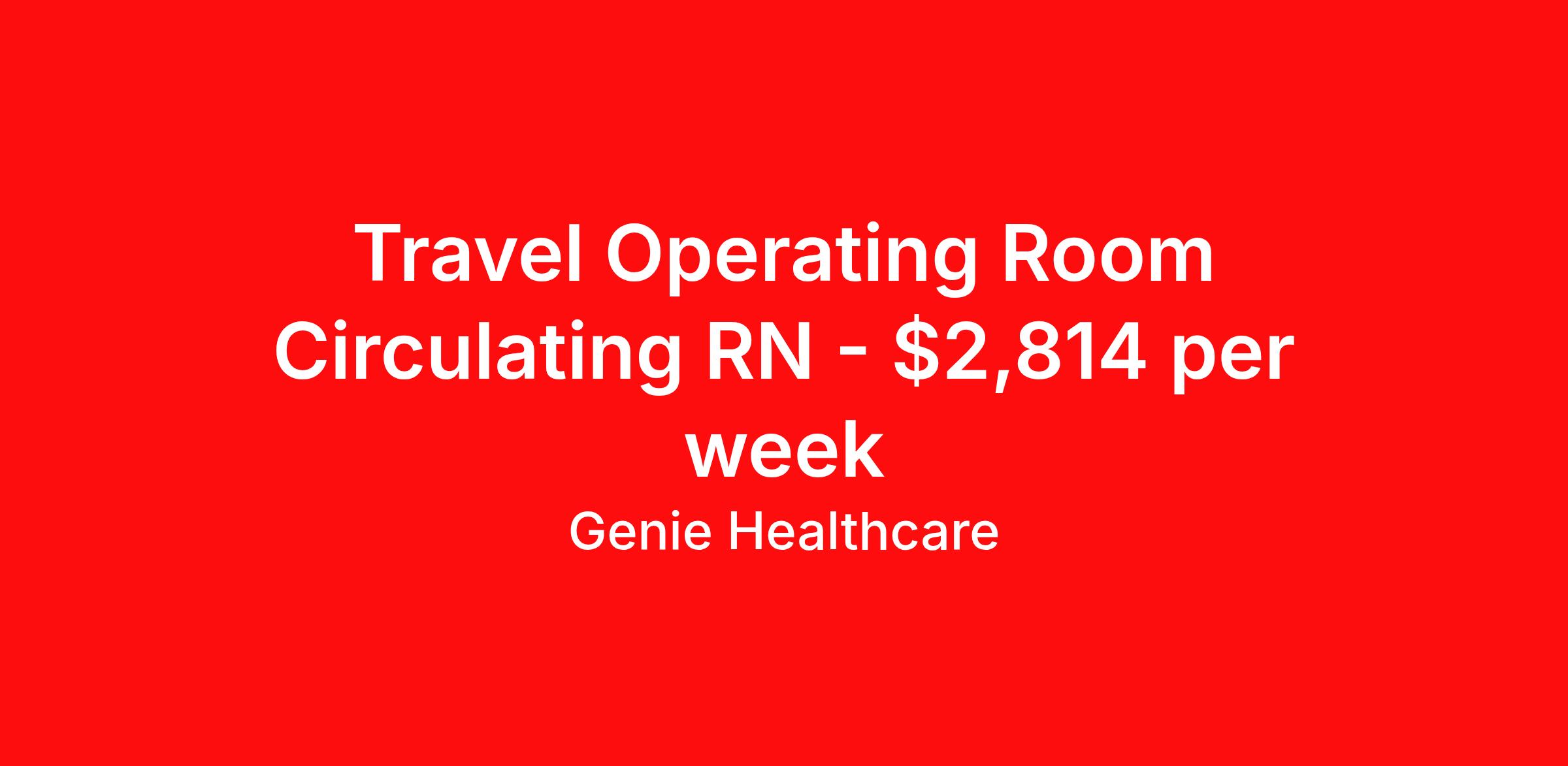 Genie Healthcare is seeking a travel nurse RN OR Circulate for a travel nursing job in Hermiston, Oregon. Job Description & Requirements Specialty: OR Circulate Discipline: RN Start Date: 04/13/2026 Duration: 13 weeks 40 hours per week Shift: 8 hours, days Employment Type: Travel Genie Healthcare is looking for a RN to work in Operating Room – Circulating for a 13 weeks travel assignment located in Hermiston, OR for the Shift (5x8 Days - Please verify shift details with recruiter, 07:00:00-15:00:00, 8.00-5). Pay and benefits packages are estimated based on client bill rate at time the job was posted. These rates are subject to change. Exact pay and benefits vary based on several things, including, but not limited to, guaranteed hours, client changes in bill rate, experience, etc. Benefits: Medical Insurance, Dental Insurance, Vision Insurance, 401(k) with company matching (50% up to 6% of what you contribute) Genie Healthcare Job ID 17631231. Pay package is based on 8 hour shifts and 40.0 hours per week (subject to confirmation) with tax-free stipend amount to be determined. Posted job title: RN:Operating Room – Circulating,07:00:00-15:00:00 About Genie Healthcare Genie Healthcare is one of the fastest growing Nurse Travel Agencies in the USA. Genie serves hundreds of facilities and has over 4000 current travel RN contracts open at any given time. Genie provides travel RN’s flexibility, support, top pay scale, housing and the 1 rated, multi-state health insurance coverage. Genie Healthcare carries with it a commitment to providing a comprehensive level of service and quality care. Growing from a small team of eager recruiters to a company with satisfied clients in nearly every corner of the nation, delivering excellence in patient and customer care is the key to Genie’s success. The management team has 20 years of experience in workforce solutions and staffing in medical and non-medical fields, roles ranging from Clerical job to Cardiologist to software developer to CEO.