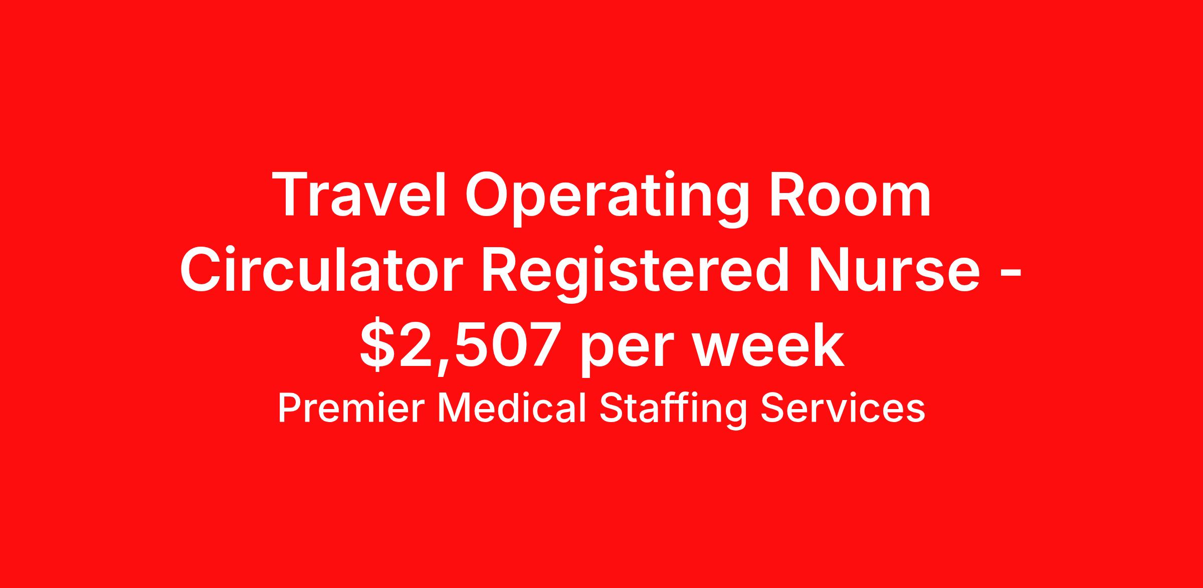 Premier Medical Staffing Services is seeking a travel nurse RN OR - Operating Room for a travel nursing job in Pratt, Kansas. Job Description & Requirements Specialty: OR - Operating Room Discipline: RN Start Date: 04/13/2026 Duration: 13 weeks 40 hours per week Shift: 8 hours Employment Type: Travel Premier Medical Staffing Job ID 626084. Pay package is based on 8 hour shifts and 40 hours per week (subject to confirmation) with tax-free stipend amount to be determined. Posted job title: RN OR About Premier Medical Staffing Services Premier Medical Staffing Services, LLC is a nationally expanding healthcare staffing firm for healthcare professionals and companies. We understand our clients’ need for highly qualified, expertly trained medical professionals and are passionate about helping clinicians find employment opportunities that fit their personality and needs. Able to accommodate the ever-changing needs of the healthcare landscape, we offer per-diem, contract and direct hire placements to support the unique needs of each industry sector. Premier Medical Staffing Services is Joint Commission Certified, a Military Spouse Employment Partner and is certified as a Women’s Business Enterprise. We are proudly nurse owned.