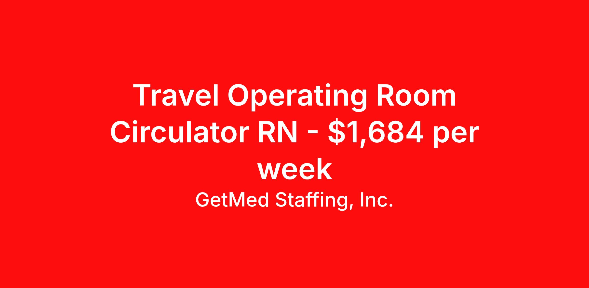 GetMed Staffing, Inc. is seeking a travel nurse RN Outpatient OR Circulate for a travel nursing job in Augusta, Georgia. Job Description & Requirements Specialty: OR Circulate Discipline: RN Start Date: 04/13/2026 Duration: 8 weeks 40 hours per week Shift: 8 hours, days Employment Type: Travel GetMed Staffing is searching for a strong Ambulatory/Outpatient Care RN to assist our traveler-friendly client. A minimum of 1-2 years of experience is required. Traveling with GetMed Staffing offers the unique opportunity to gain diverse experiences, both personally and professionally. Gain experience that matters. GetMed Staffing, Inc. Job ID 35930056. Pay package is based on 8 hour shifts and 40.0 hours per week (subject to confirmation) with tax-free stipend amount to be determined. Posted job title: RN:Ambulatory/Outpatient Care,07:00:00-15:00:00 About GetMed Staffing, Inc. We are a diversity owned company, specializing in healthcare recruiting services. We truly understand how important a healthcare travelers' relationship is with their recruiter, as well as our relationship is with our healthcare facilities. We recognize that the needs of our healthcare travelers can vary, and therefore we provide the personalized touch necessary to ensure a successful travel assignment each and every time. Our healthcare facilities and clients benefit from us putting our healthcare travelers first. GetMed Staffing is excited to be a leader within the industry by focusing on providing healthcare travelers with more choices and possibilities as they plan for their next healthcare travel assignment. Benefits Life insurance Medical benefits Dental benefits Vision benefits 401k retirement plan