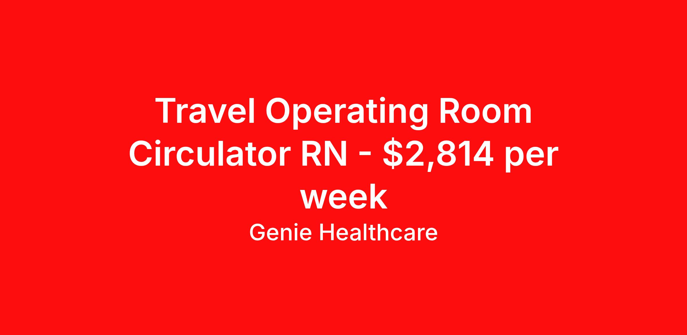 Genie Healthcare is seeking a travel nurse RN OR Circulate for a travel nursing job in Hermiston, Oregon. Job Description & Requirements Specialty: OR Circulate Discipline: RN Start Date: 04/13/2026 Duration: 13 weeks 40 hours per week Shift: 8 hours, days Employment Type: Travel Genie Healthcare is looking for a RN to work in Operating Room – Circulating for a 13 weeks travel assignment located in Hermiston, OR for the Shift (5x8 Days - Please verify shift details with recruiter, 07:00:00-15:00:00, 8.00-5). Pay and benefits packages are estimated based on client bill rate at time the job was posted. These rates are subject to change. Exact pay and benefits vary based on several things, including, but not limited to, guaranteed hours, client changes in bill rate, experience, etc. Benefits: Medical Insurance, Dental Insurance, Vision Insurance, 401(k) with company matching (50% up to 6% of what you contribute) Genie Healthcare Job ID 17655372. Pay package is based on 8 hour shifts and 40.0 hours per week (subject to confirmation) with tax-free stipend amount to be determined. Posted job title: RN:Operating Room – Circulating,07:00:00-15:00:00 About Genie Healthcare Genie Healthcare is one of the fastest growing Nurse Travel Agencies in the USA. Genie serves hundreds of facilities and has over 4000 current travel RN contracts open at any given time. Genie provides travel RN’s flexibility, support, top pay scale, housing and the 1 rated, multi-state health insurance coverage. Genie Healthcare carries with it a commitment to providing a comprehensive level of service and quality care. Growing from a small team of eager recruiters to a company with satisfied clients in nearly every corner of the nation, delivering excellence in patient and customer care is the key to Genie’s success. The management team has 20 years of experience in workforce solutions and staffing in medical and non-medical fields, roles ranging from Clerical job to Cardiologist to software developer to CEO.