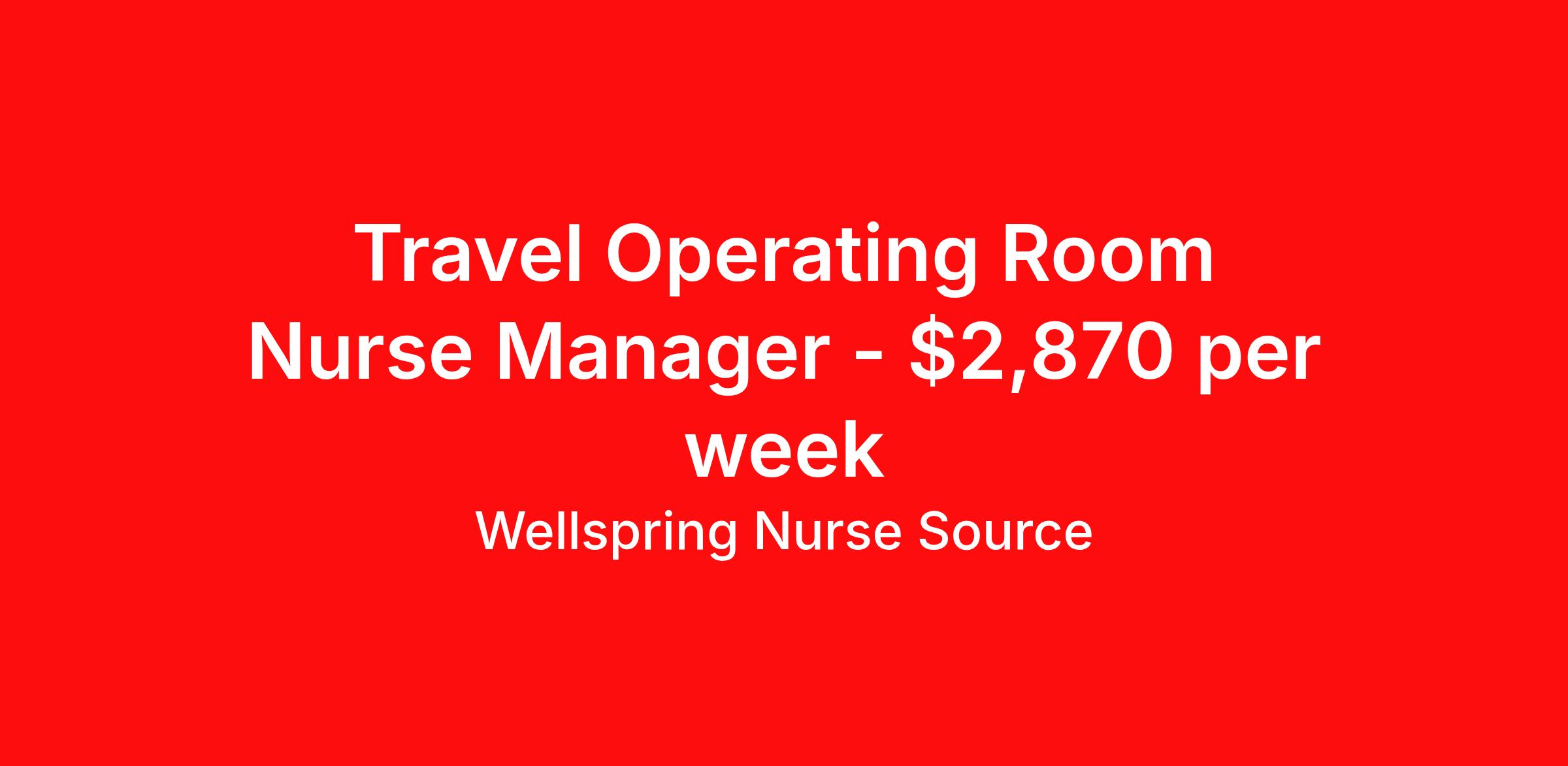 Wellspring Nurse Source is seeking a travel nurse RN Manager, OR - Operating Room for a travel nursing job in Calais, Maine. Job Description & Requirements Specialty: OR - Operating Room Discipline: RN Start Date: 03/30/2026 Duration: 13 weeks 40 hours per week Shift: 8 hours, flexible Employment Type: Travel Wellspring Nurse Source Job ID 36076939. Pay package is based on 8 hour shifts and 40.0 hours per week (subject to confirmation) with tax-free stipend amount to be determined. Posted job title: RN Manager - OR About Wellspring Nurse Source Wellspring is nurse owned and operated which means that we get you, we stand behind you, and we advocate for you. We are 100% committed to helping you find your best job at the best rate. We are unwavering in our commitment to supporting our clinicians on every step of their travel adventure, assisting with everything from onboarding and payroll to on-the-job clinical support with a dedicated Clinician Success Team. You’re not just a number at Wellspring, you’re a valued member of our family. Join us and experience the Wellspring difference.