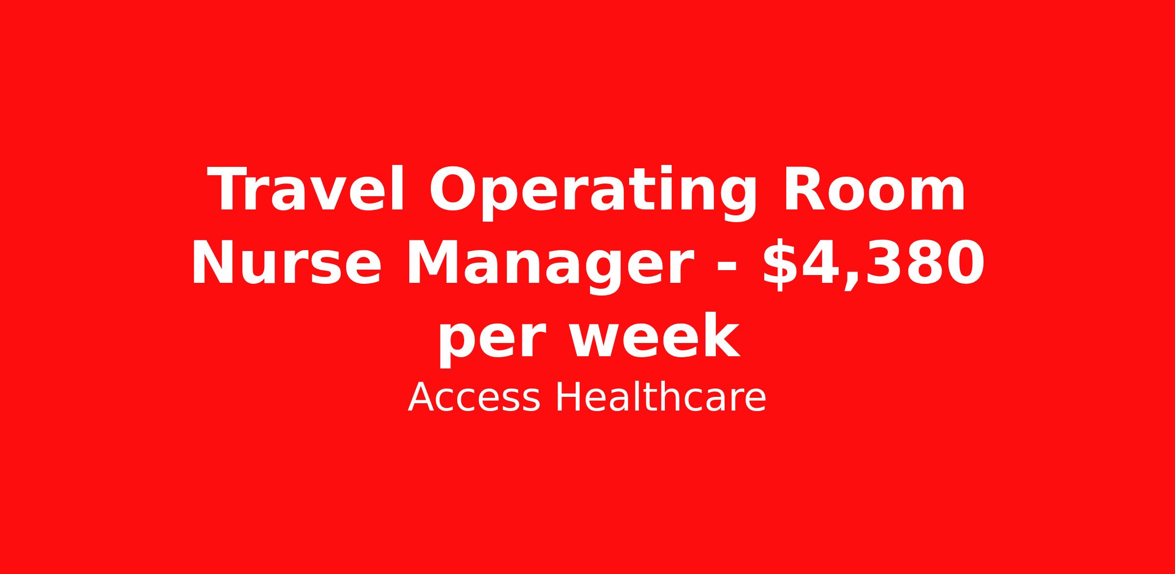 Access Healthcare is seeking a travel nurse RN OR - Operating Room Manager for a travel nursing job in Hermiston, Oregon. Job Description & Requirements Specialty: OR - Operating Room Discipline: RN Start Date: ASAP Duration: 13 weeks 36 hours per week Shift: 8 hours, days Employment Type: Travel Access Healthcare Job ID 75811333. Pay package is based on 8 hour shifts and 36 hours per week (subject to confirmation) with tax-free stipend amount to be determined. About Access Healthcare Access Healthcare aims to provide superior service to our nursing family by providing around the clock support, competitive pay packages and an unmatched benefits package! Unlike other agencies, we offer a true family feel and work with you to find the placement that is right for you. We offer one of the top leading pay packages in the industry and we are ready to get you the money you deserve! Access Healthcare was founded by two travel nurses, Danielle and Diego, who had a dream and a shared vision of creating an agency which all nurses would want to work with. Our passion has led us to where we are today as one of the top 10 agencies in our home state of New Jersey, with access to contracts in all 50 states! We encourage you to join our team and we cannot wait to get to know you!