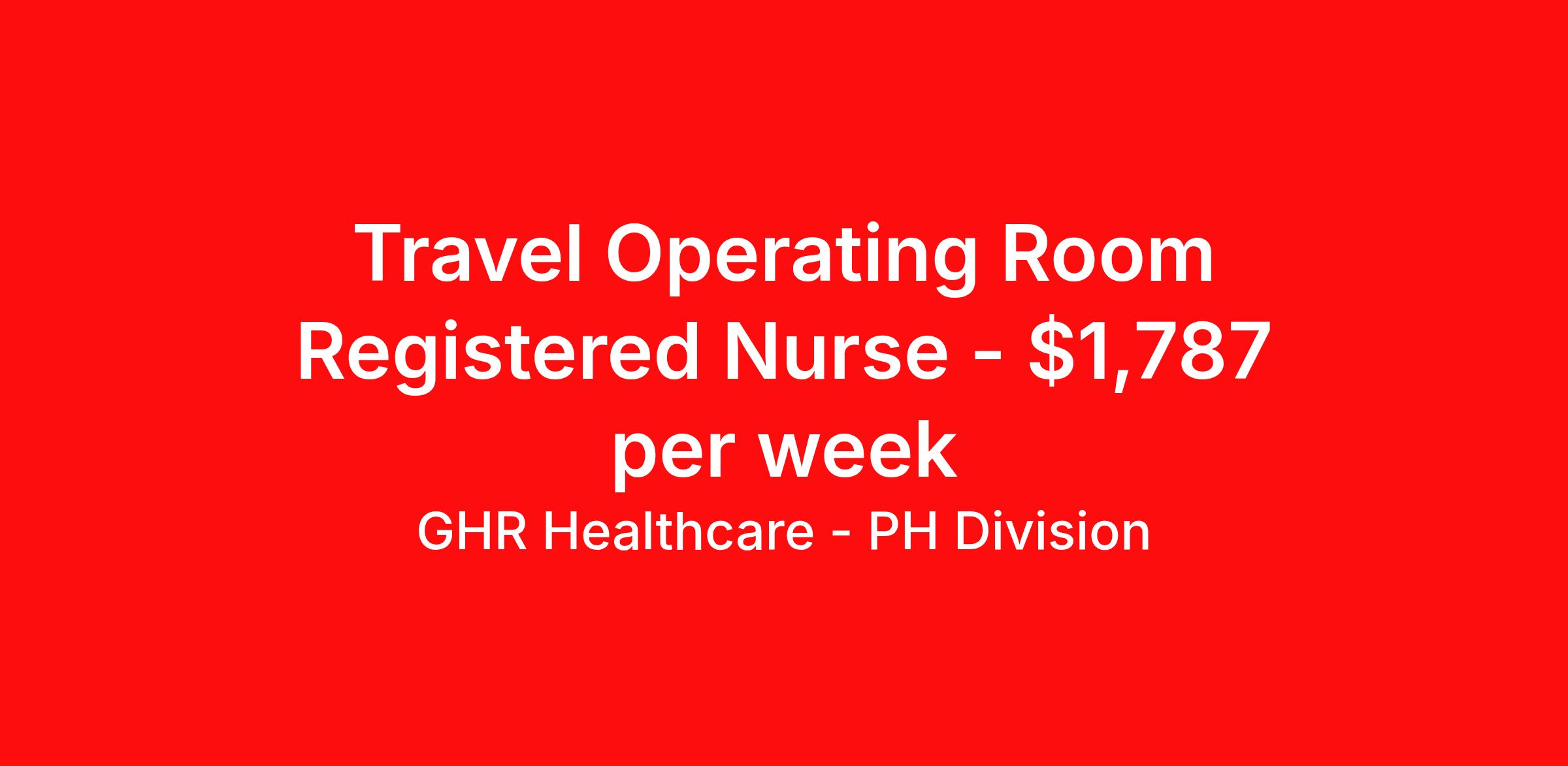 GHR Healthcare - PH Division is seeking a travel nurse RN OR - Operating Room for a travel nursing job in Charleston, South Carolina. Job Description & Requirements Specialty: OR - Operating Room Discipline: RN Start Date: 04/13/2026 Duration: 13 weeks 36 hours per week Shift: 12 hours Employment Type: Travel Planet Healthcare Job ID 76314897. Pay package is based on 12 hour shifts and 36 hours per week (subject to confirmation) with tax-free stipend amount to be determined. About GHR Healthcare - PH Division For over 30 years, GHR Healthcare has been the bridge between healthcare professionals and the facilities that need them nationwide. We're committed to uncovering your ideal fit, supported by GHR's dedication to competitive compensation, transparent communication, and a devoted team that genuinely cares about your career journey. You can trust us to stand by your side as your advocate, confidante, and partner in advancing your career. At GHR, care and consideration are at the heart of everything we do. Visit ghrhealthcare.com to learn more.