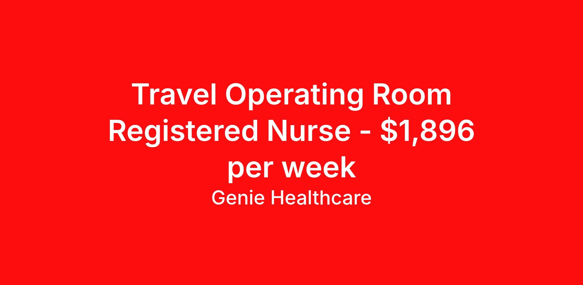 Genie Healthcare is seeking a travel nurse RN OR - Operating Room for a travel nursing job in Charleston, South Carolina. Job Description & Requirements Specialty: OR - Operating Room Discipline: RN Start Date: 04/13/2026 Duration: 13 weeks 36 hours per week Shift: 12 hours, days Employment Type: Travel Genie Healthcare is looking for a RN to work in Operating Room for a 13 weeks travel assignment located in Charleston, SC for the Shift (3x12hr days, 07:00:00-19:00:00, 12.00-3). Pay and benefits packages are estimated based on client bill rate at time the job was posted. These rates are subject to change. Exact pay and benefits vary based on several things, including, but not limited to, guaranteed hours, client changes in bill rate, experience, etc. Benefits: Medical Insurance, Dental Insurance, Vision Insurance, 401(k) with company matching (50% up to 6% of what you contribute) Genie Healthcare Job ID 17965088. Pay package is based on 12 hour shifts and 36.0 hours per week (subject to confirmation) with tax-free stipend amount to be determined. Posted job title: RN:Operating Room,07:00:00-19:00:00 About Genie Healthcare Genie Healthcare is one of the fastest growing Nurse Travel Agencies in the USA. Genie serves hundreds of facilities and has over 4000 current travel RN contracts open at any given time. Genie provides travel RN’s flexibility, support, top pay scale, housing and the 1 rated, multi-state health insurance coverage. Genie Healthcare carries with it a commitment to providing a comprehensive level of service and quality care. Growing from a small team of eager recruiters to a company with satisfied clients in nearly every corner of the nation, delivering excellence in patient and customer care is the key to Genie’s success. The management team has 20 years of experience in workforce solutions and staffing in medical and non-medical fields, roles ranging from Clerical job to Cardiologist to software developer to CEO.