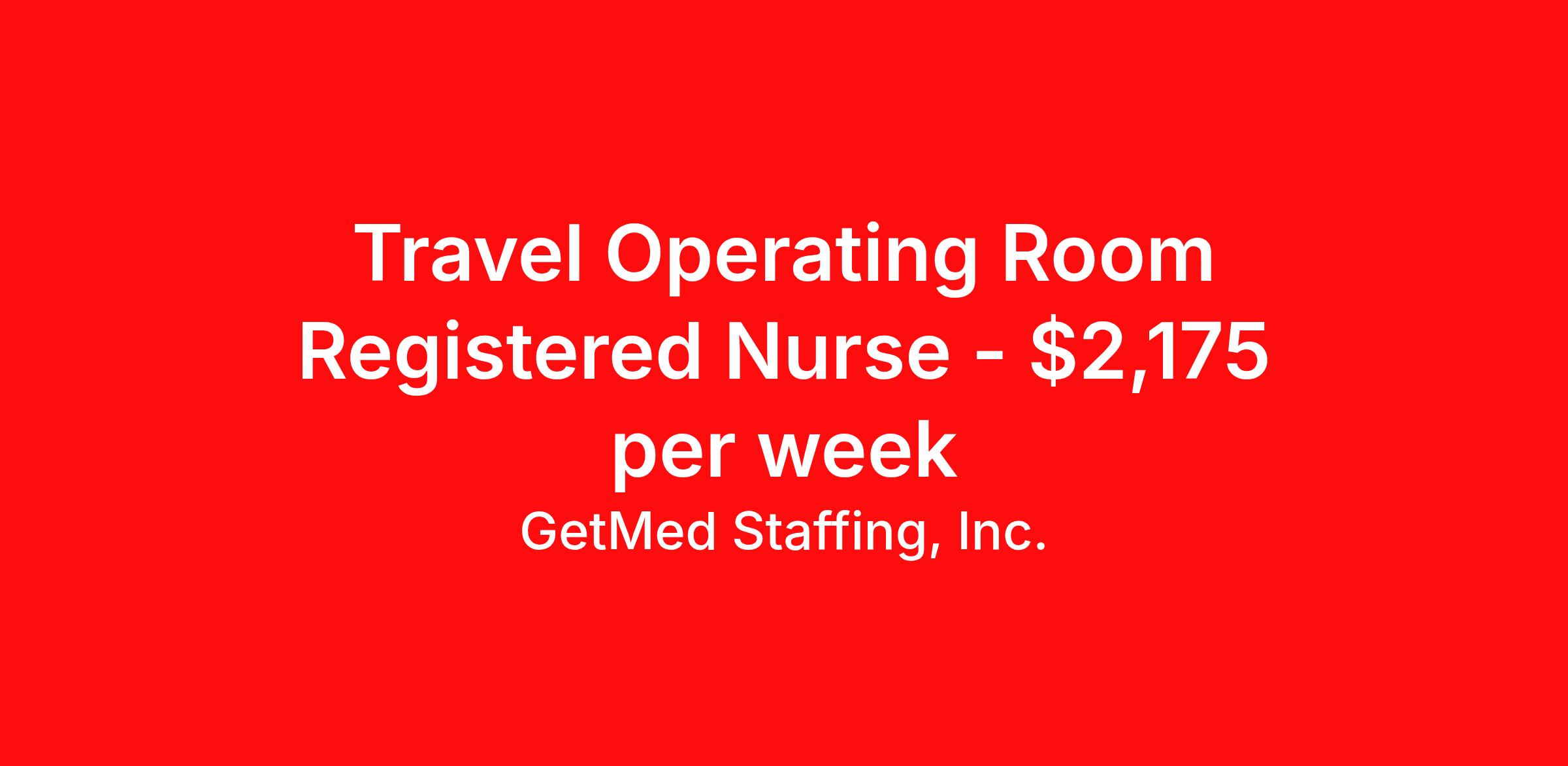 GetMed Staffing, Inc. is seeking a travel nurse RN OR - Operating Room for a travel nursing job in Indianapolis, Indiana. Job Description & Requirements Specialty: OR - Operating Room Discipline: RN Start Date: 04/20/2026 Duration: 13 weeks 36 hours per week Shift: 12 hours, nights Employment Type: Travel GetMed Staffing is searching for a strong OR RN to assist our traveler-friendly client. A minimum of 1-2 years of experience is required. Traveling with GetMed Staffing offers the unique opportunity to gain diverse experiences, both personally and professionally. Gain experience that matters. GetMed Staffing, Inc. Job ID 36143719. Pay package is based on 12 hour shifts and 36.0 hours per week (subject to confirmation) with tax-free stipend amount to be determined. Posted job title: RN:OR,19:00:00-07:00:00 About GetMed Staffing, Inc. We are a diversity owned company, specializing in healthcare recruiting services. We truly understand how important a healthcare travelers' relationship is with their recruiter, as well as our relationship is with our healthcare facilities. We recognize that the needs of our healthcare travelers can vary, and therefore we provide the personalized touch necessary to ensure a successful travel assignment each and every time. Our healthcare facilities and clients benefit from us putting our healthcare travelers first. GetMed Staffing is excited to be a leader within the industry by focusing on providing healthcare travelers with more choices and possibilities as they plan for their next healthcare travel assignment. Benefits Life insurance Medical benefits Dental benefits Vision benefits 401k retirement plan