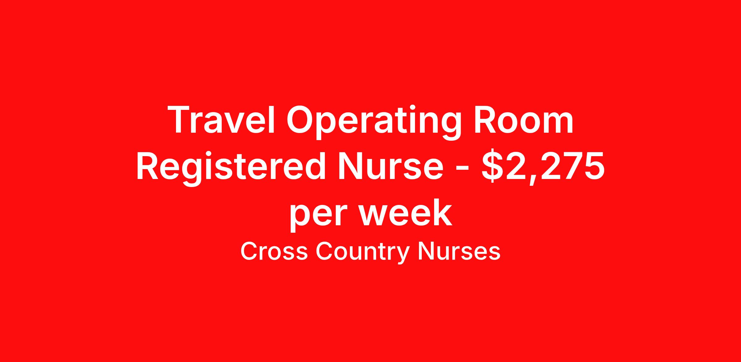 Cross Country Nurses is seeking a travel nurse RN OR - Operating Room for a travel nursing job in Hartford, Connecticut. Job Description & Requirements Specialty: OR - Operating Room Discipline: RN Start Date: 04/06/2026 Duration: 13 weeks 36 hours per week Shift: 12 hours, days Employment Type: Travel Job Description As an operating room nurse (RN OR), you will manage the care of patients before, during, and after surgery. Working primarily within the operating suite, you will frequently be responsible for preparing the patient, handling and preparing operating instruments and equipment, monitoring patient status, and assisting surgeries as necessary. As a part of your duties, you will provide pre- and post-op education to patients and their families. Minimum Requirements At least 1 year of recent acute care experience in specialty Active RN license Benefits The benefits of taking a travel nursing job with Cross Country include: Private housing or generous housing allowance Comprehensive health insurance with prescription coverage Dependent health insurance with prescription coverage Competitive salaries Referral bonuses Travel reimbursement 401(k) retirement plan Direct deposit/free checking Unlimited free CE credits Cross Country Job ID 1236301. Pay package is based on 12 hour shifts and 36 hours per week (subject to confirmation) with tax-free stipend amount to be determined. Posted job title: Registered Nurse / Operating Room About Cross Country Nurses You care for others — we’re here to care for you. At Cross Country, we know travel nursing is about more than just the job. It’s about building a career that supports your lifestyle, your values, and your impact. We offer competitive pay, full benefits, and 24/7 support from a team that truly understands what it means to be on the front lines. Wherever your journey takes you, we’re with you every step of the way. Let’s build your best life — one assignment at a time. Benefits 401k retirement plan Referral bonus