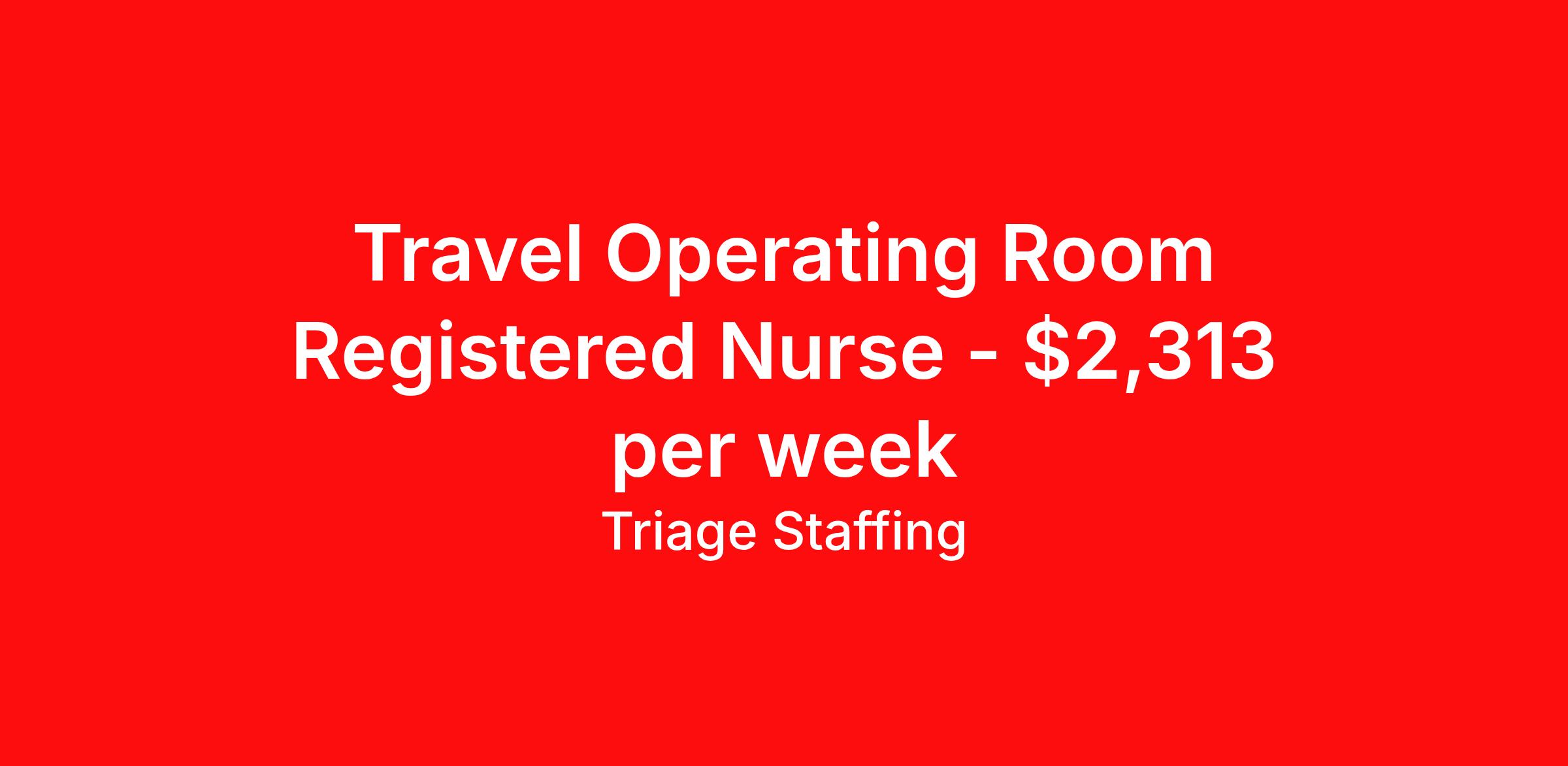 Triage Staffing is seeking a travel nurse RN OR - Operating Room for a travel nursing job in Indianapolis, Indiana. Job Description & Requirements Specialty: OR - Operating Room Discipline: RN Start Date: 04/20/2026 Duration: 13 weeks 36 hours per week Shift: 12 hours, nights Employment Type: Travel Travel Nursing: OR Indianapolis, IN Location: Indianapolis, IN Start Date: 4/20/2026 Shift Details: 12H Nights 36 hours per week Length: 13 WEEKS Apply for specific facility details.OR RN Triage Staffing Job ID DRNKEM7U. Posted job title: Registered Nurse Operating Room About Triage Staffing At Triage, we prefer to be real . Real about expectations—both ours and yours. Real about how a decision you make today could affect your tomorrows. Real about how compensation actually works. Real about how great—or grating—your next supervisor may be. Being real allows everyone at Triage to be ready . Ready to serve you with real honesty. So if that gig near the ocean is really no day at the beach, or that third shift comes with a second-class rate, we tell you. So you can be ready, too. We staff all five major divisions of acute care—nursing, lab, radiology, cardiopulmonary and rehab therapy, offering: - Competitive, custom pay packages - One point of contact for both travelers and facilities (per division) - A reliable recruiter who's got your back throughout your entire assignment - In-house compliance and accounting specialists - A clinical liaison team available 24/7 to offer medical and professional support and career development - A mentoring program that is run and managed by actual clinicians—yeah, you read that right - And more (because of course there’s more) Are we the biggest? No. Are we the best? That’s rather subjective, but we’re trying to be. Will we work like hell to get you as close to your idea of heaven as possible? Yes. Yes, we will. Benefits: Day One comprehensive, nationwide insurance plans for health, vision and dental and life—including a HSA option Day One 401(k) program with employer-matching contributions once eligible Facility cancelling protection—your time is money on and off-the-clock Guaranteed hours Weekly paychecks via direct deposit Earned vacation bonuses for time worked Paid holidays Employee assistance program (EAP)—your mental health is important, too Continuing education, certification and licensing reimbursement Workers comp—because accidents happen Top-rated professional liability insurance Company provided housing options Referral bonus—$750 in your pocket after they’ve completed a 13-week assignment