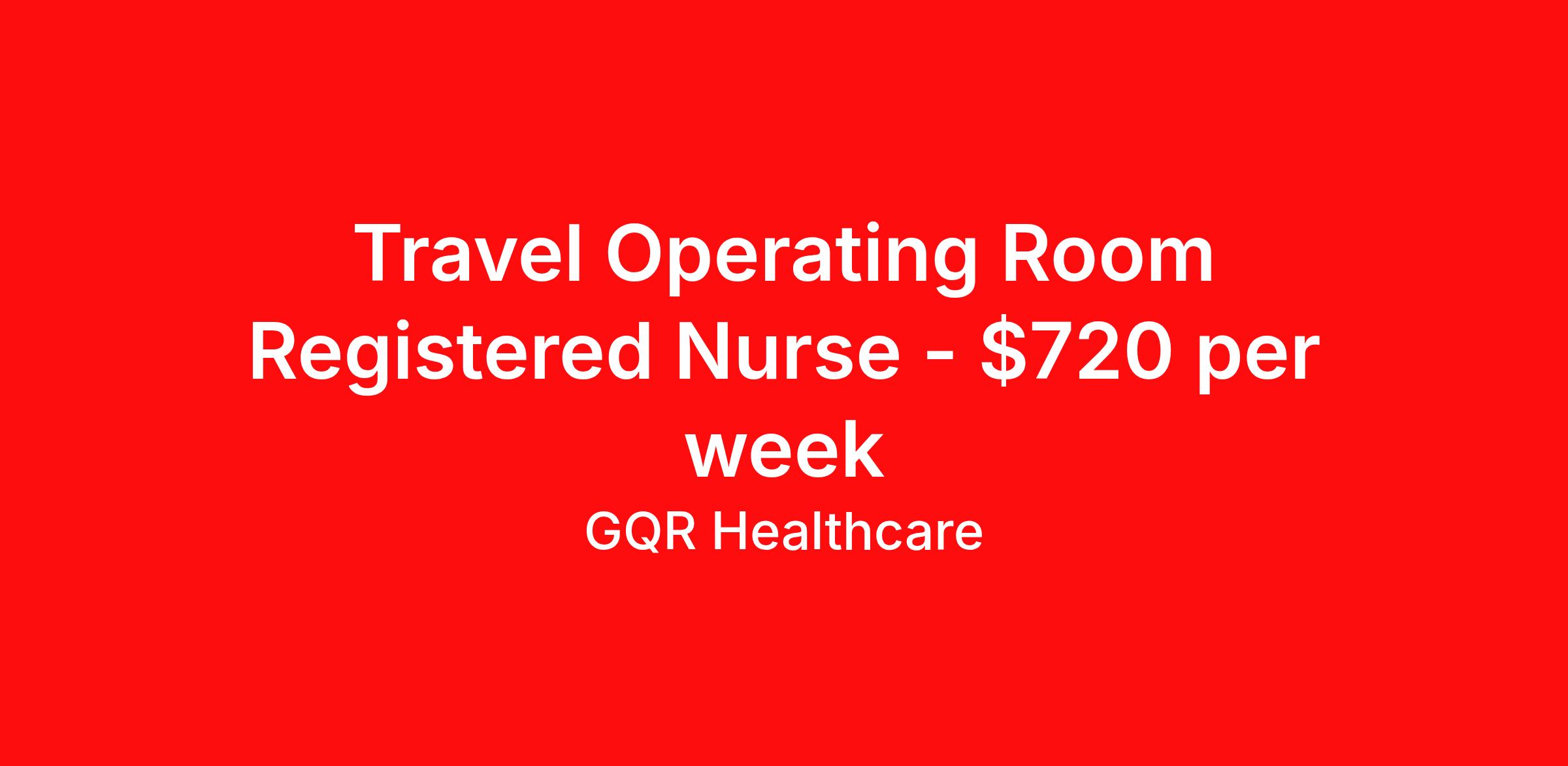 GQR Healthcare is seeking a travel nurse RN OR - Operating Room for a travel nursing job in Marietta, Georgia. Job Description & Requirements Specialty: OR - Operating Room Discipline: RN Start Date: ASAP Duration: 2 weeks 36 hours per week Shift: 12 hours, days Employment Type: Travel Contract - W2 Operating Room (OR) Registered Nurse (RN) Job Location: Marietta, Georgia Start Date: March 9, 2026 Profession: Registered Nurse (RN) Facility: Short Term Acute Care Estimated Pay: $720 - $815 Duration:2 weeks Specialty:Operating Room (OR) Shift: Day Shift Details: null Day Job Type: Travel *Estimated weekly pay includes projected hourly wages and weekly meal and lodging per diems for eligible clinicians based on nationally published GSA rates. Actual weekly pay and per diems may differ from the amount shown and are subject to change during an assignment. Benefits: Day 1 Insurance Cigna medical, MetLife dental and vision insurance License reimbursement for new licenses needed for each assignment Discounts with hotels and rental cars A dedicated recruiter and support team that will help you every step of the way to sure you start on time and have an exceptional experience Referral bonus up to $700 About the Company: Finding the right role is about more than just matching skills to a job—it’s about aligning with your goals, values, and the way you want to work. As an award-winning talent partner, we support healthcare professionals through every step of that process, offering meaningful opportunities, clear guidance, and long-term partnership. From our first conversation to your first day on the job (and beyond!), we’re here to help you move forward with confidence. GQR Job ID 777507. Pay package is based on 12 hour shifts and 36 hours per week (subject to confirmation) with tax-free stipend amount to be determined. Posted job title: Registered Nurse (RN) About GQR Healthcare GQR’s Healthcare team specializes in connecting experts within the industry to highly skilled healthcare professionals across the US market. In the competitive healthcare market, we recognize that the industry’s common goals of improved quality of care and patient outcomes are wholly reliant upon the professionals directly supporting these initiatives. Leveraging our extensive candidate network, we deliver continuity of care for the communities our partners serve to ensure the patient experience is of the highest quality. Through deep market specialization and a unique approach to talent acquisition, GQR Healthcare provides an unparalleled and personalized experience across all medical specialties in nursing and within diverse healthcare platforms across the industry.