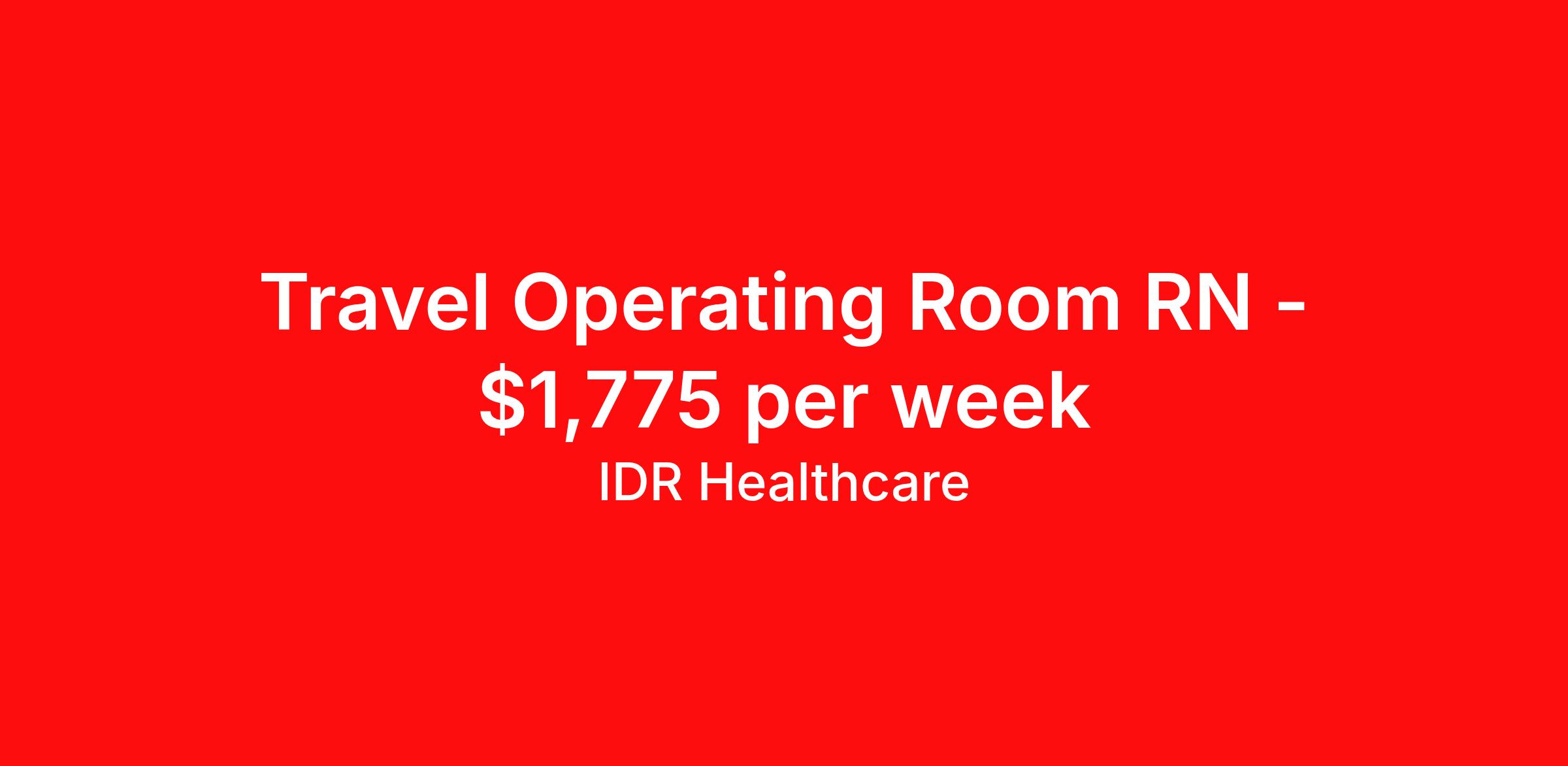 IDR Healthcare is seeking a travel nurse RN OR - Operating Room for a travel nursing job in Florence, South Carolina. Job Description & Requirements Specialty: OR - Operating Room Discipline: RN Start Date: 04/06/2026 Duration: 13 weeks 36 hours per week Shift: 12 hours, days Employment Type: Travel IDR Healthcare is an awarding winning staffing firm that believes it is a privilege and awesome responsibility to serve those who selflessly care for others. Our mission is to empower healthcare professionals to achieve their fullest potential both personally and professionally while they create positive change within the healthcare community. We exercise true grit, tenacity, and authenticity while embracing and ownership mindset to go above and beyond providing healthcare professionals a world class experience. We are employee owned and our travelers and clinicians earn shares/equity by just completing multiple assignments! We have been named SIA’s Fastest Growing Staffing Firms and have won ClearlyRated® Best of Staffing for 11 consecutive years! This cements our commitment to clinician satisfaction earning top net promoter scores putting us in the top 2% of agencies in North America! TravelFarWithIDR and see what an extraordinary experience is all about! Benefits 2024 World Staffing Best Staffing Firms to Work For! ESOP (Equity) Healthcare Benefits for up to 30 days Between Assignments Comprehensive Health Insurance Dental and Vision Insurance Sign-On, Completion, & Referral Bonus Programs License and Certification Reimbursement Weekly Pay and Competitive Compensation Large Network of Clients and Job Opportunities 401k retirement plan Exclusive Assignments IDR Job ID 497321. Pay package is based on 12 hour shifts and 36 hours per week (subject to confirmation) with tax-free stipend amount to be determined. About IDR Healthcare IDR Healthcare is an awarding winning staffing firm that believes it is a privilege and awesome responsibility to serve those who selflessly care for others. Our mission is to empower healthcare professionals to achieve their fullest potential both personally and professionally while they create positive change within the healthcare community. We exercise true grit, tenacity, and authenticity while embracing and ownership mindset to go above and beyond providing healthcare professionals a world class experience. We are employee owned and our travelers and clinicians earn shares/equity by just completing multiple assignments! We have been named SIA’s Fastest Growing Staffing Firms and have won ClearlyRated® Best of Staffing for 11 consecutive years! This cements our commitment to clinician satisfaction earning top net promoter scores putting us in the top 2% of agencies in North America! Help us give back! For every booked assignment, proceeds are donated to St. Jude and Feeding America! Last year we raised over $18,000 for St. Jude and provided over 49,000 meals for children in need. TravelFarWithIDR and see what it is all about! Benefits Weekly pay 401k retirement plan Referral bonus Medical benefits Dental benefits License and certification reimbursement Vision benefits