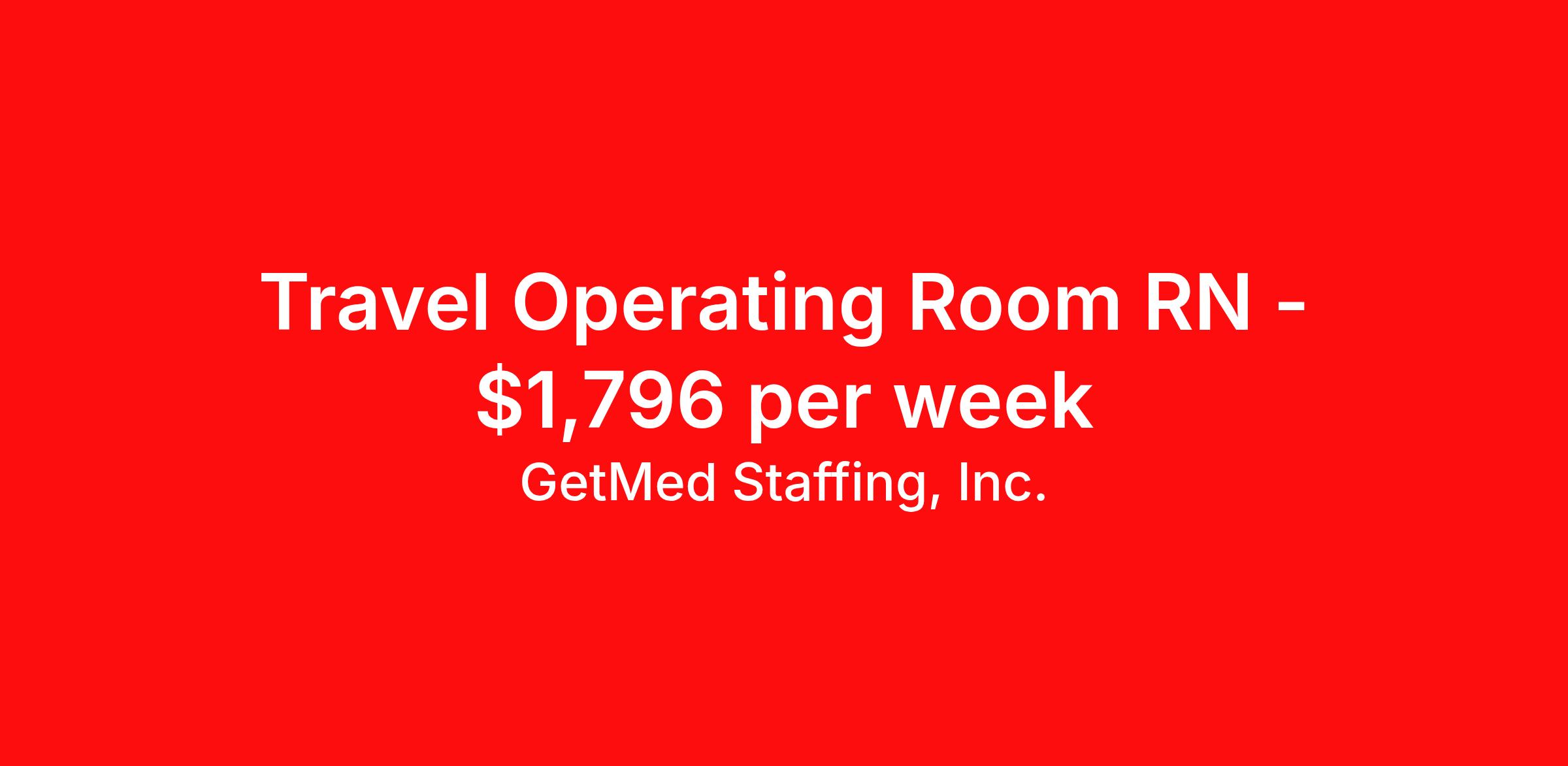 GetMed Staffing, Inc. is seeking a travel nurse RN OR - Operating Room for a travel nursing job in Lawrenceville, Georgia. Job Description & Requirements Specialty: OR - Operating Room Discipline: RN Start Date: 04/13/2026 Duration: 13 weeks 36 hours per week Shift: 12 hours, days Employment Type: Travel GetMed Staffing is searching for a strong OR RN to assist our traveler-friendly client. A minimum of 1-2 years of experience is required. Traveling with GetMed Staffing offers the unique opportunity to gain diverse experiences, both personally and professionally. Gain experience that matters. GetMed Staffing, Inc. Job ID 36115577. Pay package is based on 12 hour shifts and 36.0 hours per week (subject to confirmation) with tax-free stipend amount to be determined. Posted job title: RN:OR,07:00:00-19:00:00 About GetMed Staffing, Inc. We are a diversity owned company, specializing in healthcare recruiting services. We truly understand how important a healthcare travelers' relationship is with their recruiter, as well as our relationship is with our healthcare facilities. We recognize that the needs of our healthcare travelers can vary, and therefore we provide the personalized touch necessary to ensure a successful travel assignment each and every time. Our healthcare facilities and clients benefit from us putting our healthcare travelers first. GetMed Staffing is excited to be a leader within the industry by focusing on providing healthcare travelers with more choices and possibilities as they plan for their next healthcare travel assignment. Benefits Life insurance Medical benefits Dental benefits Vision benefits 401k retirement plan