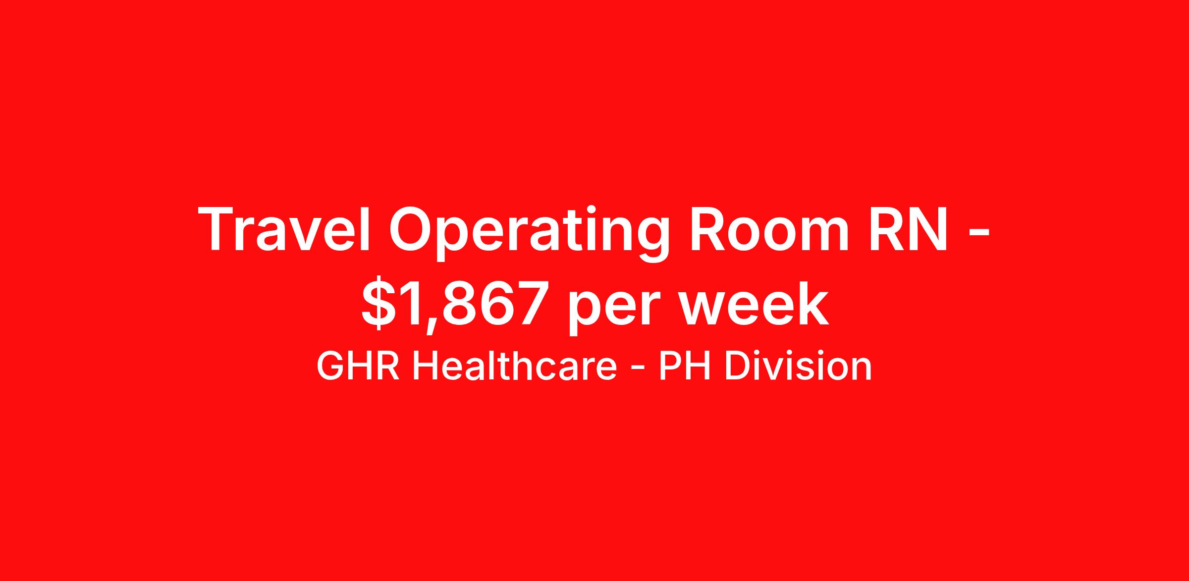GHR Healthcare - PH Division is seeking a travel nurse RN OR - Operating Room for a travel nursing job in Atlanta, Georgia. Job Description & Requirements Specialty: OR - Operating Room Discipline: RN Start Date: 04/13/2026 Duration: 12 weeks 36 hours per week Shift: 12 hours Employment Type: Travel Planet Healthcare Job ID 75978458. Pay package is based on 12 hour shifts and 36 hours per week (subject to confirmation) with tax-free stipend amount to be determined. About GHR Healthcare - PH Division For over 30 years, GHR Healthcare has been the bridge between healthcare professionals and the facilities that need them nationwide. We're committed to uncovering your ideal fit, supported by GHR's dedication to competitive compensation, transparent communication, and a devoted team that genuinely cares about your career journey. You can trust us to stand by your side as your advocate, confidante, and partner in advancing your career. At GHR, care and consideration are at the heart of everything we do. Visit ghrhealthcare.com to learn more.