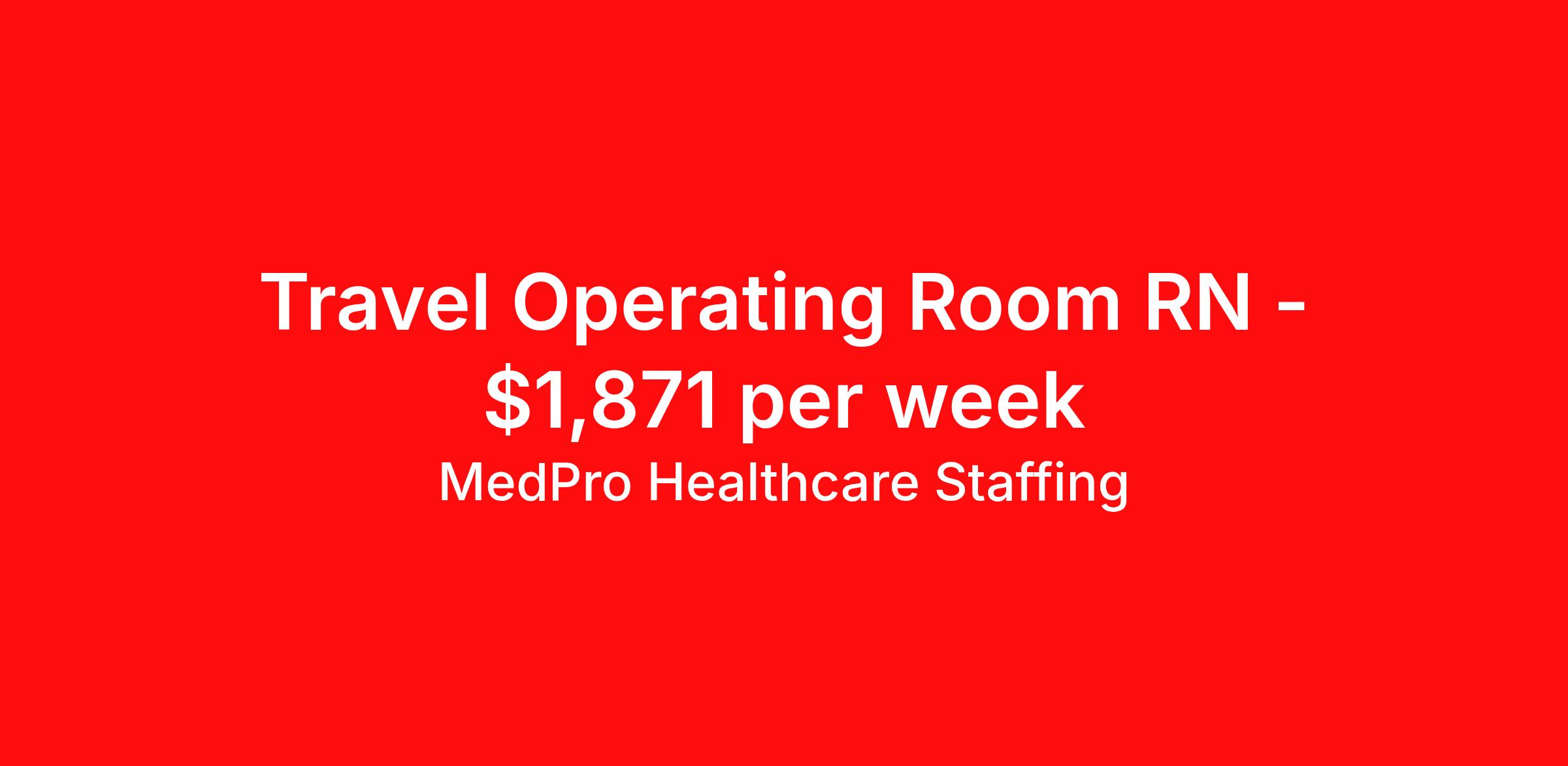MedPro Healthcare Staffing is seeking a travel nurse RN OR - Operating Room for a travel nursing job in Duluth, Georgia. Job Description & Requirements Specialty: OR - Operating Room Discipline: RN Start Date: 04/13/2026 Duration: 13 weeks 36 hours per week Shift: 12 hours, days Employment Type: Travel MedPro Healthcare Staffing , a Joint Commission-certified staffing agency, is seeking a quality Operating Room Registered Nurse (RN) for a travel assignment with one of our top healthcare clients. Requirements Eighteen months of recent experience in an Acute Care Surgery setting Active RN License Degree from an accredited nursing program BLS & ACLS Certifications Other requirements to be determined by our client facility Benefits Weekly pay and direct deposit Full coverage of all credentialing fees Private housing or housing allowance Group Health insurance for you and your family Company-paid life and disability insurance Travel reimbursement 401(k) matching Unlimited Referral Bonuses up to $1,000 Duties Responsibilities Operating Room / Perioperative Nurses offer the skills needed to provide surgical patient care by assessing, planning, and implementing the nursing care patients receive before, during and after surgery Provide surgical patient care by assessing, planning, and implementing the nursing care patients receive before, during and after surgery. The OR nurse / OR RN also serves as patient educator, circulating nurse and/or scrub nurse. Circulating OR nurses work within the operating suite but outside of the sterile field. Scrub OR nurses handle and prepare operating instruments and equipment within the sterile field. About Agency MedPro Healthcare Staffing is a Joint Commission certified provider of contract staffing services. Since 1983, we have placed nursing and allied travelers in top healthcare facilities nationwide. Join us today for your very own MedPro Experience®. If qualified and interested, please call for immediate consideration. MedPro Staffing is an Equal Opportunity Employer. All applicants will be considered for employment without attention to race, color, religion, national origin, age, sex, disability, marital status or veteran status. Key Words: Registered Nurse, RN, Operating Room, Scrub, Circulate, OR, Contract Nurse, Travel Nurse, Agency RN, Travel RN, Nursing, Contract, Perioperative nurse *Weekly payment estimates are intended for informational purposes only and include a gross estimate of hourly wages and reimbursements for meal, incidental, and housing expenses. Your recruiter will confirm your eligibility and provide additional details. MedPro Job ID a0Fcx00000H5pGDEAZ. Pay package is based on 12 hour shifts and 36 hours per week (subject to confirmation) with tax-free stipend amount to be determined. Posted job title: Operating Room Registered Nurse Nursing: Operating Room. About MedPro Healthcare Staffing At MedPro Healthcare Staffing , we believe no one cares more for caregivers than we do. Our mission is simple: you focus on your patients, and we’ll take care of the rest. As a Joint Commission-certified leader in temporary and contract healthcare staffing since 1983, MedPro has proudly connected nursing and allied travelers with top healthcare facilities across the nation. With thousands of job opportunities available nationwide, we make it easy to find assignments that align with your goals and lifestyle. Our on-staff clinical support team—alongside a compassionate group of experienced recruiters—provides hands-on guidance every step of the way. From Day 1 medical benefits and a 401(k) plan to personalized career support, we’re committed to ensuring every professional we serve feels valued, cared for, and empowered to succeed. Guided by a CEO who is a Registered Nurse, MedPro is built on a foundation of clinical insight and genuine compassion for the caregiving community. Through The MedPro Experience® , we deliver travel assignments that are rewarding, memorable, and designed to help you DREAM big, EXPLORE often, and ACHIEVE greatness. Benefits Day 1 medical, dental, and vision benefits for you and your family Weekly pay and direct deposit Unlimited Referral Bonuses starting at $500 On Staff Clinical Support Team Access to nationwide travel assignments MPX Mobile app -24/7 real-time access to jobs, credentials, assignment details, and more Full coverage of all credentialing fees Private housing or housing allowance Tax Free Per Diems, Housing Stipends and Travel Reimbursements Company-paid life and disability insurance Travel reimbursement 401(k) matching Benefits Weekly pay Referral bonus Employee assistance programs