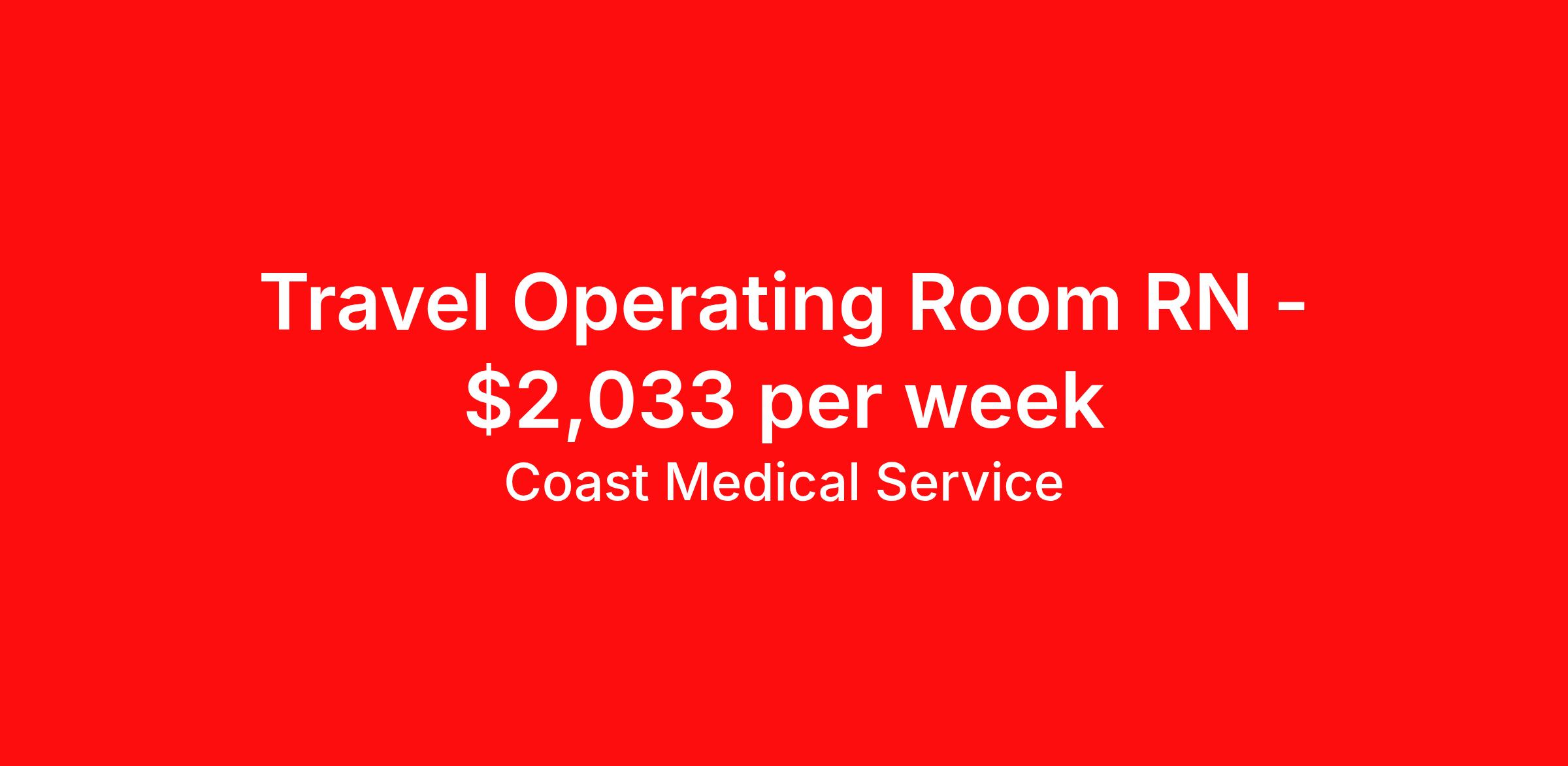 Coast Medical Service is seeking a travel nurse RN OR - Operating Room for a travel nursing job in Atlanta, Georgia. Job Description & Requirements Specialty: OR - Operating Room Discipline: RN Start Date: 04/13/2026 Duration: 13 weeks 36 hours per week Shift: 12 hours, nights Employment Type: Travel Coast Medical Service is a nationwide travel nursing & allied healthcare staffing agency dedicated to providing an elite traveler experience for the experienced or first-time traveler. Coast is featured on Blue Pipes' 2023 Best Travel Agencies and named a 2022 Top Rated Healthcare Staffing Firm & 2023 First Half Top Rated Healthcare Staffing Firm by Great Recruiters. Please note that pay rate may differ for locally based candidates. Please apply here or contact a recruiter directly to learn more about this position & the facility, and/or explore others that may be of interest to you. We look forward to speaking with you! Coast Medical Services Job ID 36189713. Pay package is based on 12 hour shifts and 36.0 hours per week (subject to confirmation) with tax-free stipend amount to be determined. Posted job title: RN:Operating Room,19:00:00-07:30:00