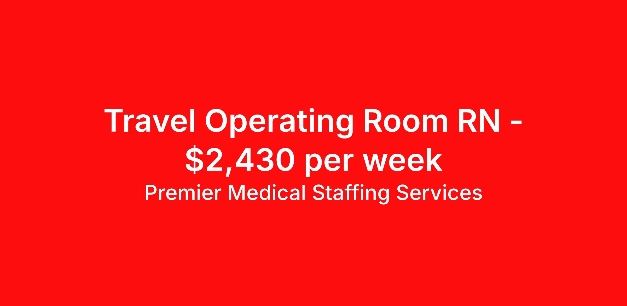 Premier Medical Staffing Services is seeking a travel nurse RN OR - Operating Room for a travel nursing job in Santa Fe, New Mexico. Job Description & Requirements Specialty: OR - Operating Room Discipline: RN Start Date: 05/04/2026 Duration: 12 weeks 40 hours per week Shift: 8 hours Employment Type: Travel Premier Medical Staffing Job ID 625624. Pay package is based on 8 hour shifts and 40 hours per week (subject to confirmation) with tax-free stipend amount to be determined. Posted job title: RN OR About Premier Medical Staffing Services Premier Medical Staffing Services, LLC is a nationally expanding healthcare staffing firm for healthcare professionals and companies. We understand our clients’ need for highly qualified, expertly trained medical professionals and are passionate about helping clinicians find employment opportunities that fit their personality and needs. Able to accommodate the ever-changing needs of the healthcare landscape, we offer per-diem, contract and direct hire placements to support the unique needs of each industry sector. Premier Medical Staffing Services is Joint Commission Certified, a Military Spouse Employment Partner and is certified as a Women’s Business Enterprise. We are proudly nurse owned.