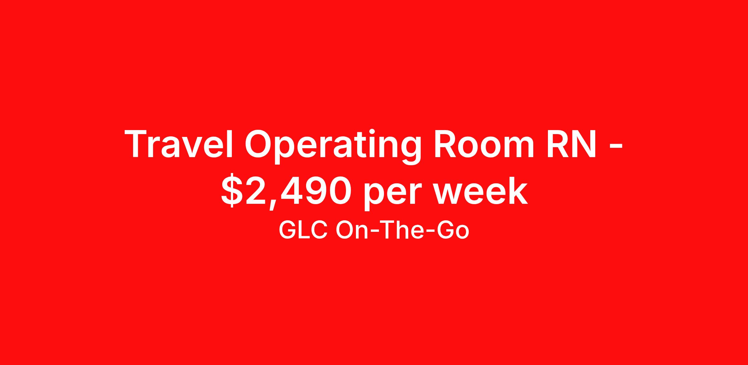 GLC On-The-Go is seeking a travel nurse RN OR - Operating Room for a travel nursing job in Rockport, Maine. Job Description & Requirements Specialty: OR - Operating Room Discipline: RN Start Date: ASAP Duration: 13 weeks 36 hours per week Shift: 12 hours Employment Type: Travel GLC is hiring: RN Operating Room (OR) - Rockport, ME - 13-week contract GLC – Named Best Nurse Agency 2024–2025 We connect nurses, nursing professionals, and allied health professionals like you to contracts that align with your skills, schedule, and career goals. About this Assignment Join the care team in Operating Room (OR) where you’ll provide patient-centered care in a collaborative environment. Typical responsibilities include direct patient care, timely documentation, and coordination with the care team. Specific duties will be confirmed during your interview with a recruiter. Assignment Details Location: Rockport, ME Assignment Length: 13 weeks Start Date: 03/08/2026 End Date: 06/06/2026 Pay Range: $2,241 - $2,490 Minimum Requirements Active license in Operating Room (OR) 1 year full-time RN, Operating Room (OR) experience within the last 2 years What you can expect from GLC Weekly on-time pay with direct deposit Transparent communication, clear assignment details, and recruiter support from start to finish - or extension Referral bonus up to $500 Health, dental, and vision insurance 401(k) plan Completion and signing bonuses may also be available Ready to move forward? Apply now and start your rewarding journey with GLC - a recruiter will connect quickly to review pay , start date , and assignment details so you can make the best decision for your next contract. GLC On-The-Go Job ID 504507. Pay package is based on 12 hour shifts and 36 hours per week (subject to confirmation) with tax-free stipend amount to be determined. Posted job title: PBMC - TRAVEL: RN - OPERATING ROOM - DAYS About GLC On-The-Go GLC is more than just a staffing agency – we’re your trusted partner in finding travel, local, and PRN contracts that align with your career aspirations and lifestyle. We specialize in connecting travel nurses and allied healthcare professionals like you with opportunities in acute care, long-term care, behavioral health, and allied fields across the U.S. Our attentive and friendly recruiters are always just a call or text away, ready to guide you at every step, ensuring you feel valued and heard. We understand the unique needs of travel healthcare professionals, which is why we offer comprehensive benefits and 24/7 support. Join GLC, where our 20 years of experience mean we know how to help you find the assignments that turn your career goals into reality. With us, it's not just a placement – it's your dream career made possible