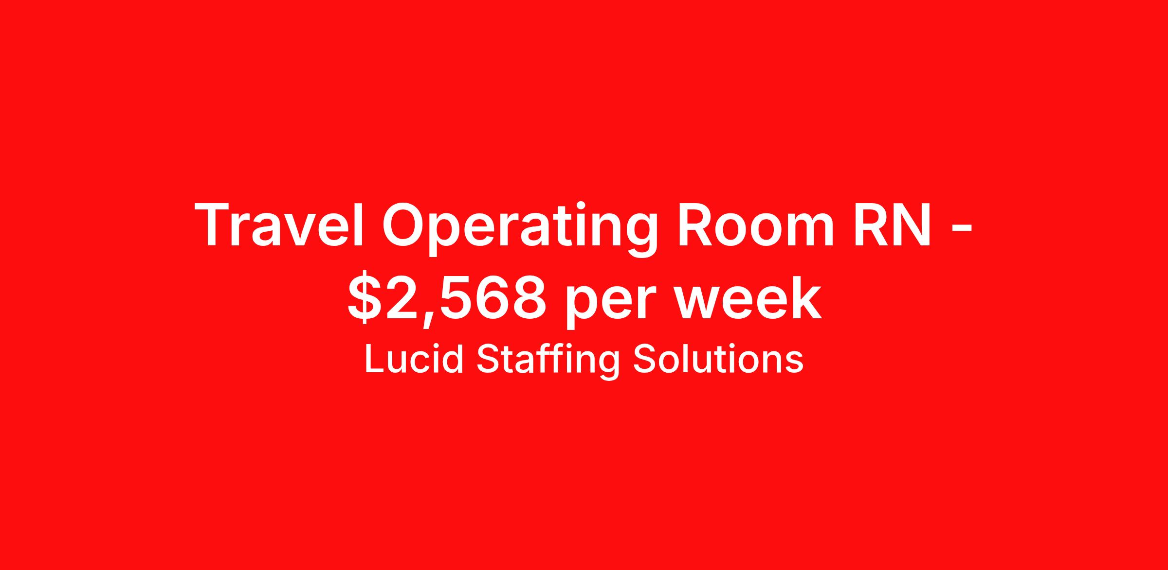 Lucid Staffing Solutions is seeking a travel nurse RN OR - Operating Room for a travel nursing job in Mattoon, Illinois. Job Description & Requirements Specialty: OR - Operating Room Discipline: RN Duration: 13 weeks 40 hours per week Shift: 8 hours, days Employment Type: Travel Job Description Position: Travel Registered Nurse (RN) with experience in OR Location: Mattoon, Illinois Shift: 10hr Day Weekly Gross: $2568.00 Lucid Staffing Solutions was created by former healthcare workers who lived the short staffing, the chaotic workflows, and the nonstop pressure that comes with patient care. We built an agency powered by real clinical experience, kept simple and supportive, so you never have to guess whether the people guiding you actually know what they’re talking about. Minimum Requirements: Active license as a Registered Nurse (RN) Licensed in Illinois (If applicable) or compact eligible Two years of recent OR experience Active BLS Why Lucid Works for Travelers Paid Weekly: Stipends pushed to GSA limits whenever possible $500 Travel Reimbursement: Paid at the start of each assignment Clinician-Led Team: Recruiters and Account Managers with real clinical experience In-House Compliance: fast updates, real communication, and none of the delays that come with outsourced vendors. Health Coverage Options: Multiple medical plans plus dental, vision, and workers compensation 401(k) Match: 4 percent match after 6 months License & Certification Reimbursement: We help cover the cost of staying compliant Liability Insurance: Included automatically Referral Bonuses: $500 per referral, $750 after five referrals Ready to start your journey? Apply today to connect with a Clinician-Recruiter! Lucid Staffing Solutions Job ID 36938. Pay package is based on 8 hour shifts and 40 hours per week (subject to confirmation) with tax-free stipend amount to be determined. Posted job title: OR About Lucid Staffing Solutions Clinician Owned & Operated At Lucid Staffing Solutions, we do things differently—because we’ve been in your shoes. Founded by actual healthcare professionals, Lucid was built to fix the issues we experienced as travelers. We know what makes a great assignment: competitive pay, seamless onboarding, honest recruiters, and most importantly—working with a team that truly sees and supports you. Our entire team is made up of former clinicians who understand the demands of the job and what travelers truly need to succeed. We offer some of the highest paying allied health and nursing contracts across the country, along with some amazing benefits & perks. Whether you're chasing freedom, flexible schedules, bigger paychecks, or your next adventure, Lucid helps you get there—with real support, real respect , and real healthcare experts. Benefits Dental benefits Medical benefits Vision benefits