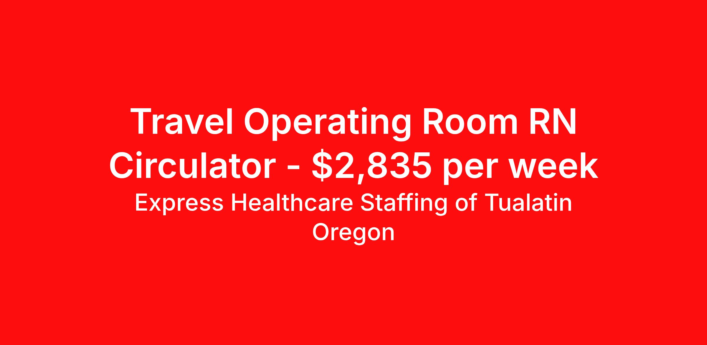 Express Healthcare Staffing of Tualatin Oregon is seeking a travel nurse RN OR - Operating Room for a travel nursing job in Hermiston, Oregon. Job Description & Requirements Specialty: OR - Operating Room Discipline: RN Duration: 13 weeks 36 hours per week Shift: 12 hours, days Employment Type: Travel The Registered Nurse specializing in perioperative nursing practice during intraoperative surgical experience. Responsible for the delivery of safe, effective, and quality patient-family centered care in the operating room and other areas of perioperative services for all patient populations. The perioperative nurse acts as the patient advocate and is responsible for the direction and supervision of any personnel assigned to him/her. He/she will be on call for the Surgery Unit on a regular scheduled rotation. Pay Breakdown: • Hourly: $44.14/hr Taxed ($1,589.04/wk Taxed) • Per Diem Eligibility: $1,246.00/wk = • $2,835.04/wk Gross Eligibility Express Healthcare Staffing of Tualatin Oregon Job ID 294388. Pay package is based on 12 hour shifts and 36 hours per week (subject to confirmation) with tax-free stipend amount to be determined. About Express Healthcare Staffing of Tualatin Oregon Express Healthcare Staffing has been locally owned and operated since 2013 and managed by healthcare staffing experts who have supported local facilities with staff for over 30 years. We work with a variety of clients including Acute Care, LTAC, Long Term Care, Clinics, Behavioral Health and Treatment Centers. We work with hundreds of local facilities and would love to help you find your next opportunity. Because we are locally owned, we have the ability to offer high pay rates, great local support and service, as well as quickly recruit and place staff on assignments; receiving submission preference from many of our clients. Call/Text our recruitment team at 503-612-2081 or email us now at Travel@ExpressHealthcareNW.com Benefits Medical benefits Dental benefits Vision benefits Sick pay Referral bonus Life insurance Weekly pay 401k retirement plan