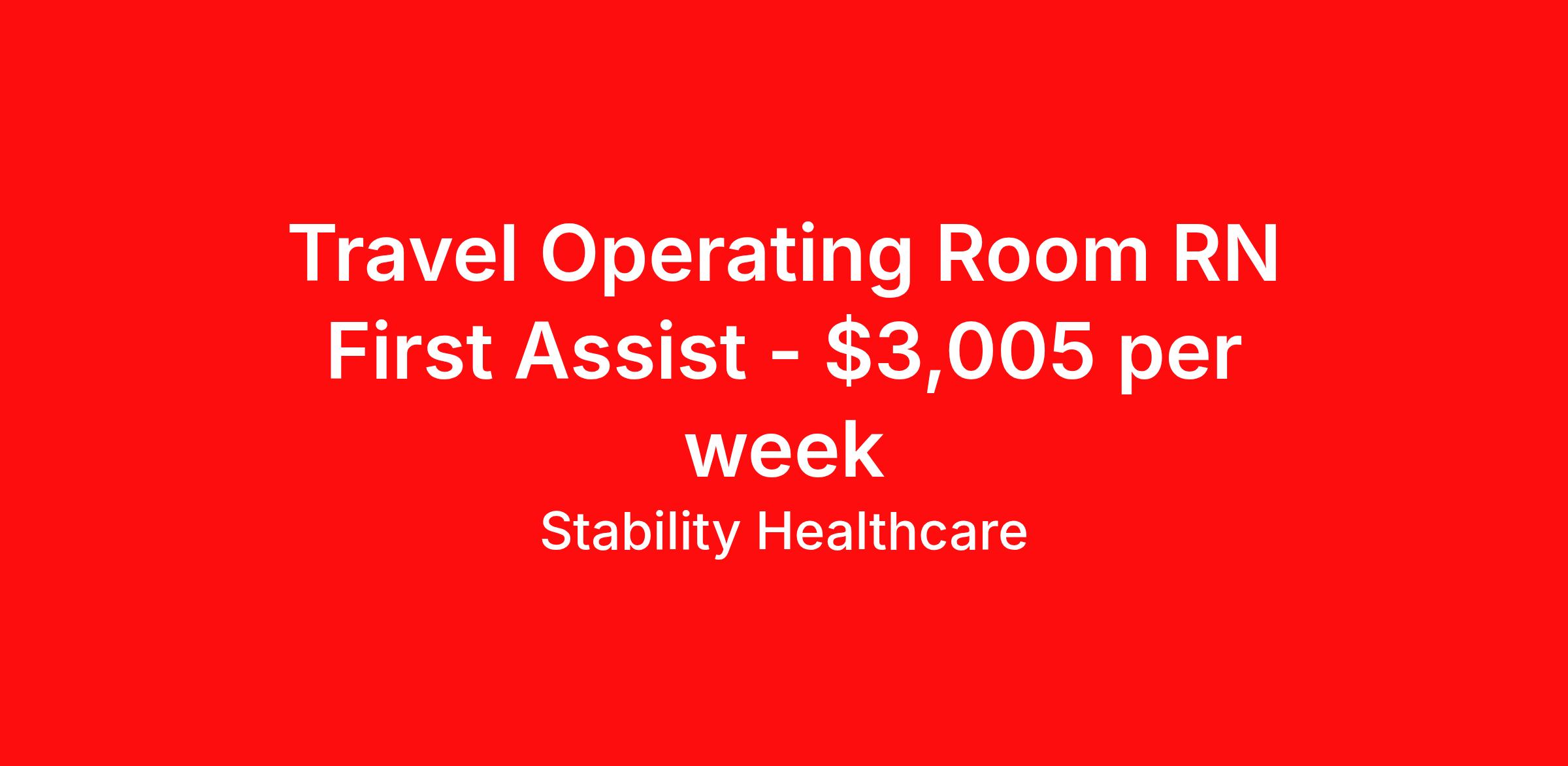 Stability Healthcare is seeking a travel nurse RN First Assist for a travel nursing job in Charleston, West Virginia. Job Description & Requirements Specialty: First Assist Discipline: RN Start Date: 04/16/2026 Duration: 13 weeks 40 hours per week Shift: 8 hours, days Employment Type: Travel Stability Healthcare is looking for a RNFA RN contract position in Charleston, WV. RNFA's are highly trained and skilled in surgical procedures, and they have completed additional education and certification to qualify for this role. They work under the supervision of a surgeon, and their responsibilities can include positioning the patient, preparing the surgical site, handling instruments, providing tissue retraction, and suturing incisions. RNFA's play a critical role in ensuring patient safety during surgical procedures, and their expertise helps to improve surgical outcomes. *$600 travel bonus *Day 1 health insurance with United Healthcare *PTO plan start accruing on day 1, use during contract or cash out at the end! *Guaranteed stipend if facility calls you off *Extra hour bonus earn an additional hourly bonus for working over your weekly contracted hours Stability Job ID 826322. Pay package is based on 8 hour shifts and 40 hours per week (subject to confirmation) with tax-free stipend amount to be determined. Posted job title: RNFA About Stability Healthcare Stability Healthcare was founded in 2009, with the mission of becoming the best Travel Nursing Agency in California. We have been rated one of the top travel nursing agencies and offer our nurses the highest paying travel nursing jobs available. We have access to the best travel assignments from 1000’s of facilities. You can start the year off in sunny California, spend the Spring in the Colorado Rockies, enjoy the Summer in the Mid-West, experience the change of seasons in Boston and New York, and hit the beaches of Florida in the winter. Our Nurses work in the best hospitals and health systems in the country. Benefits Guaranteed Hours Benefits start day 1