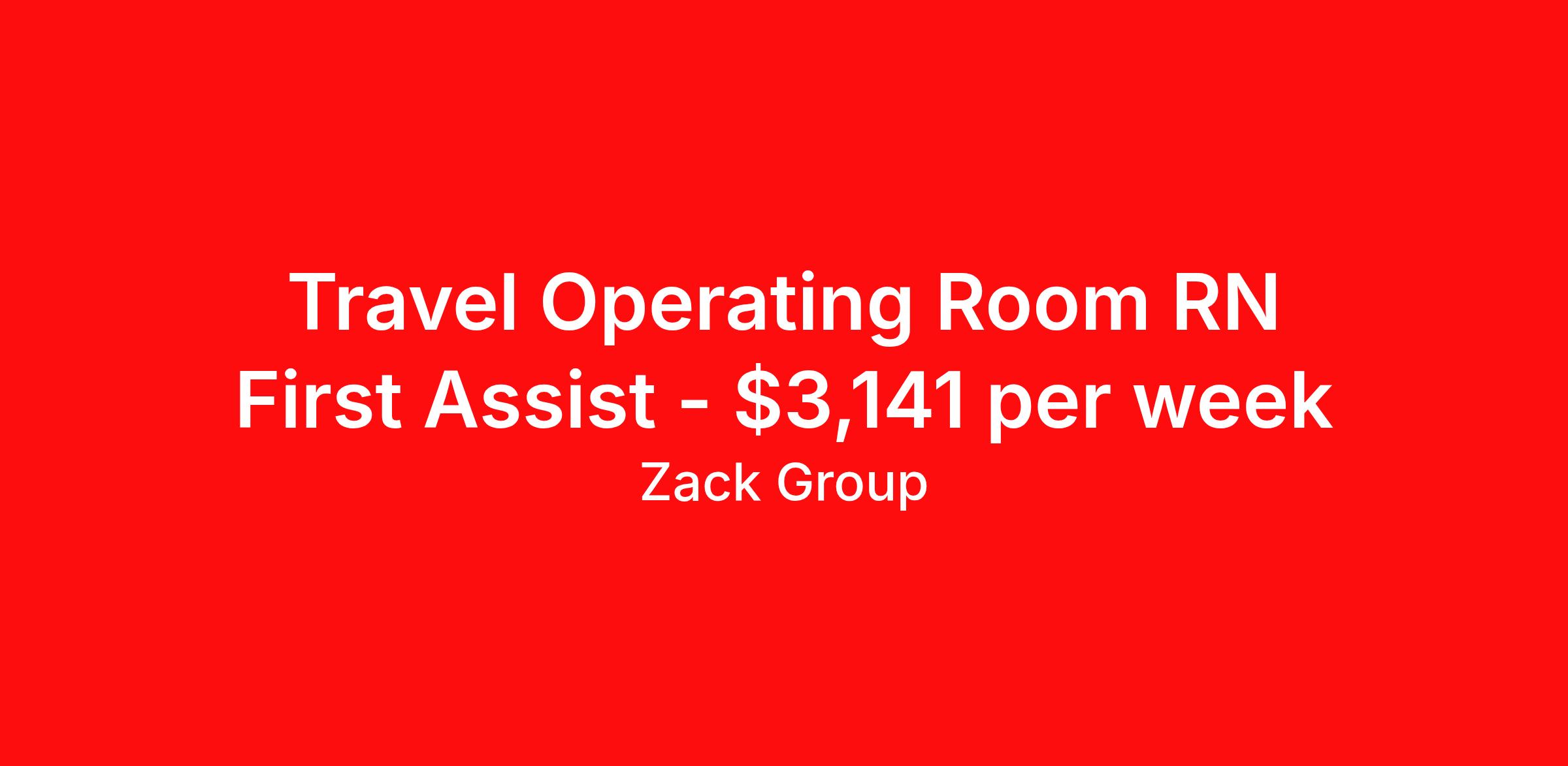 Zack Group is seeking a travel nurse RN First Assist for a travel nursing job in Charleston, West Virginia. Job Description & Requirements Specialty: First Assist Discipline: RN Start Date: 04/16/2026 Duration: 13 weeks 40 hours per week Shift: 8 hours, days Employment Type: Travel Zack Group is currently seeking OR First Assist RN’s for positions in Charleston, West Virginia. The ideal candidate will possess a current state or equivalent compact license. This is a 5x8 days, 06:00:00-14:00:00, 8.00-5 position in the OR First Assist. Must have an active License in hand and have at least 2 years of recent OR First Assist experience as a RN . Requirements • Current Resume • Active License as an OR First Assist • Current BLS and/or ACLS and/or Specialty Certifications for OR First Assist • 2 current leadership references • Must be able to pass background/urine drug screening Compensation and Benefits We offer: • Highly competitive pay rates • Meals & Housing – Highest non-taxed available • Day 1 Health Benefits package • Weekly Pay • Teladoc, 401k and HRA/HSA • Refer a friend and earn extra cash! At Zack Group, we have your future in mind. It’s our priority! Please call or text us Today! Our Healthcare recruiters are standing by! Opt In: By providing your phone number and engaging with Lynn Care, LLC (also known as Zack Group), its affiliates, and contracted partners—including via text message, phone call, AI-generated call, AI-generated text, or email—you consent to receive communications regarding job opportunities. Message frequency may vary based on your engagement. By texting Zack Group or any associated entity, you agree to our Privacy Policy and Terms of Use ( You can reply STOP to cancel and HELP for help) Zack Group Job ID 35957903. Pay package is based on 8 hour shifts and 40.0 hours per week (subject to confirmation) with tax-free stipend amount to be determined. Posted job title: RN:OR First Assist,06:00:00-14:00:00 About Zack Group Zack Group has been active in the medical staffing sector for over 25 years, providing a wide range of services to top-tier healthcare facilities, including PRN/Per Diem, contract and permanent placement. Through its Traveling Nurse division, Zack Group places certified nursing professionals with healthcare facilities across the United States. Headquartered in Overland Park, KS, Zack Group has additional representation in Topeka and Wichita, Kansas, along with Tulsa, Oklahoma. Our local office partners with facilities throughout the Kansas, Missouri, and Oklahoma region while our travel office handles the whole country. Benefits 401k retirement plan Medical benefits Dental benefits Vision benefits