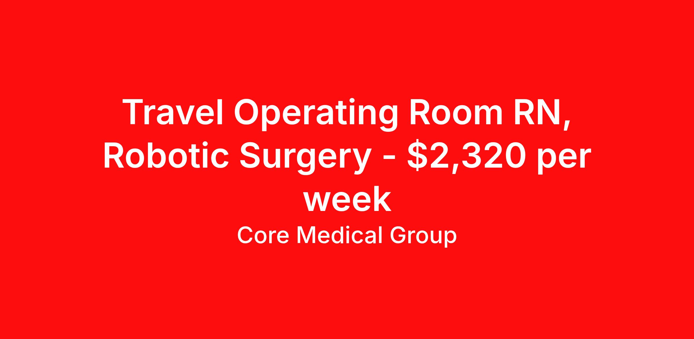Core Medical Group is seeking a travel nurse RN OR - Operating Room for a travel nursing job in Cleveland, Ohio. Job Description & Requirements Specialty: OR - Operating Room Discipline: RN Start Date: 04/06/2026 Duration: 13 weeks 36 hours per week Shift: 12 hours Employment Type: Travel Client in OH seeking Registered Nurse: Operating Room for the following shift(s): Eves We are looking for a healthcare professional who is ready to provide exceptional patient care in this contract/travel role. Contract/travel assignments are typically 13 weeks, with potential to extend. Help us continue our mission to connect people, improve lives, and give back to the community by joining the CoreMedical Group team. When you work with CoreMedical Group, we put you first and treat you like family, supporting you every step of the way. CoreMedical Group is one of the largest healthcare staffing agencies in the country, with travel and contract positions located across the United States. Our recruiters will help you find the perfect job, whether it's across the country or across the street. In addition to dedicated, personalized support from your recruiter, when you work with CoreMedical Group you'll receive: Access to an extensive benefits package, including day 1 health, dental, and vision insurance, employer paid life insurance, a health reimbursement account, and more! Weekly paychecks with competitive pay packages Matching 401(k) benefits to help you save for retirement Licensure assistance and reimbursement to set you up for success on your contract Travel reimbursement and dedicated housing support while on assignment Referral cash bonuses when you connect us with other clinicians CoreMedical Group also offers you a free, all-inclusive vacation each year as our way of saying "thank you" for your hard work. Join other healthcare professionals on the annual Club CoreMed retreat and you'll see why our contract and travel professionals come back to us year after year! Your career is too valuable to tackle on your own. Let CoreMedical Group help you with your healthcare journey! *Estimate of weekly payments is intended for informational purposes and includes hourly wages, as well as reimbursements for meal & incidental expenses, and housing expenses incurred on behalf of the Company. Any benefits (medical/dental/vision) are in addition to the weekly pay. Please speak with your Recruiter for additional details. Estimated payments are subject to change until formal offer of assignment is made and accepted. Core Medical Group Job ID 1358270. Pay package is based on 12 hour shifts and 36 hours per week (subject to confirmation) with tax-free stipend amount to be determined. Posted job title: RN About Core Medical Group CoreMedical Group is one of the largest healthcare staffing agencies in the country. We have jobs nationwide in travel nursing, travel allied health, interim, locum tenens, and permanent placements! Join the staffing agency with Club CoreMed, the best perk in the industry - an all inclusive paid trip to a tropical resort! Benefits Weekly pay Holiday Pay Guaranteed Hours Continuing Education 401k retirement plan Pet insurance Company provided housing options Sick pay Wellness and fitness programs Mileage reimbursement Referral bonus Employee assistance programs Medical benefits Dental benefits Vision benefits Benefits start day 1 License and certification reimbursement Life insurance Discount program