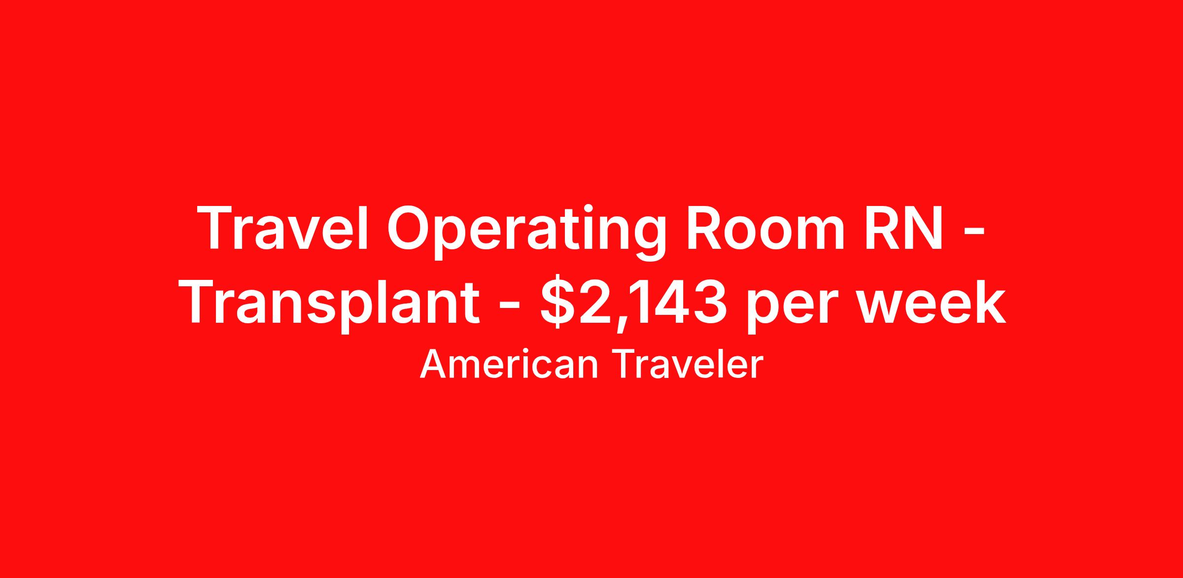 American Traveler is seeking a travel nurse RN OR - Operating Room for a travel nursing job in Weston, Florida. Job Description & Requirements Specialty: OR - Operating Room Discipline: RN Start Date: 03/23/2026 Duration: 13 weeks 36 hours per week Shift: 12 hours, days Employment Type: Travel Assignment Overview Shift: Days, 3x12hrs Hours: 36 hrs/wk Start Date: Mar 23, 2026 Length: 13 weeks Openings: 1 Description American Traveler is seeking an experienced Operating Room RN with strong transplant and proficiency in Misonix/CUSA for a teaching hospital position. Details Work in the hospital operating room with primary focus on liver, heart, lung, and kidney transplants Care for patients receiving new organs, requiring experience with organ implantation Proficiency with Misonix/CUSA equipment is required Charting is performed using Epic Shifts are day/evening (11:00-23:30), 3x12 hours per week On-call required: 1 shift per week and two 12-hour weekend shifts per month Floating within scope to meet hospital needs may be required Free parking is available in any unrestricted space Scrub color is ceil blue Requirements Active FL or compact RN license (pending license considered) Current BLS and ACLS certifications required at time of consideration NIHSS certification must be obtained prior to start Minimum of 2 years direct operating room experience in liver and other major organ transplants Demonstrated proficiency with Misonix/CUSA Documented experience with transplant implantation procedures Negative 10-panel drug screen with nicotine (cotinine) testing required All RTO must be declared at time of consideration Additional Information Primary responsibilities include direct patient care in the operating room with a focus on organ transplantation First-time travelers are accepted This is a smoke-free facility and all travelers must be nicotine free Time-sensitive onboarding modules must be prioritized upon confirmation Position is in a teaching hospital environment Assignments at any Cleveland Clinic location are limited to 18 consecutive months with a 6-month gap required before returning American Traveler Job ID P-670158. Pay package is based on 12 hour shifts and 36 hours per week (subject to confirmation) with tax-free stipend amount to be determined. Posted job title: Travel RN - Operating Room About American Traveler With over 25 years of experience, American Traveler has established a reputation for outstanding customer service. Our team ensures a smooth, worry-free experience for those starting on or expanding their travel nursing and allied careers. With thousands of travel nursing and allied jobs nationwide, our attentive and approachable recruiters find positions that align perfectly with your career aspirations and personal requirements. American Traveler offers exceptional benefits, including premium medical, dental, vision and life insurance beginning day one of your assignment, generous 401(k) match, substantial housing stipends, and more. Additionally, with 24/7 support and access to our in-house clinicians, you are assured confidence and comfort throughout your assignment. With our team behind you, you can relax and enjoy a rewarding travel career.
