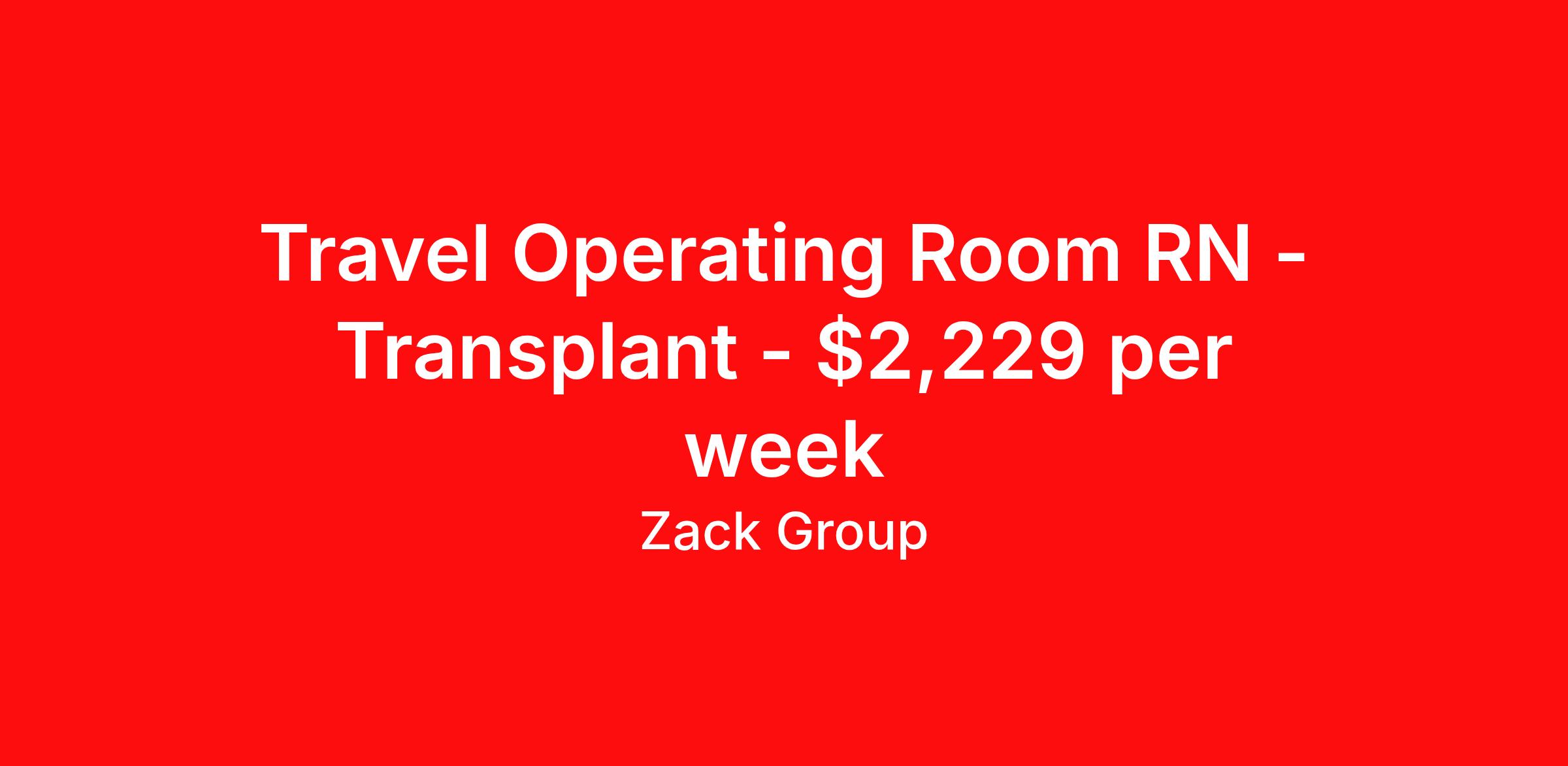 Zack Group is seeking a travel nurse RN OR - Operating Room for a travel nursing job in Weston, Florida. Job Description & Requirements Specialty: OR - Operating Room Discipline: RN Start Date: 04/20/2026 Duration: 13 weeks 36 hours per week Shift: 12 hours, days Employment Type: Travel Zack Group is currently seeking OR RN’s for positions in Weston, Florida. The ideal candidate will possess a current state or equivalent compact license. This is a 3x12 Days, 07:00:00-19:00:00, 12.00-3 position in the OR. Must have an active License in hand and have at least 2 years of recent OR experience as a RN . Requirements • Current Resume • Active License as an OR • Current BLS and/or ACLS and/or Specialty Certifications for OR • 2 current leadership references • Must be able to pass background/urine drug screening Compensation and Benefits We offer: • Highly competitive pay rates • Meals & Housing – Highest non-taxed available • Day 1 Health Benefits package • Weekly Pay • Teladoc, 401k and HRA/HSA • Refer a friend and earn extra cash! At Zack Group, we have your future in mind. It’s our priority! Please call or text us Today! Our Healthcare recruiters are standing by! Opt In: By providing your phone number and engaging with Lynn Care, LLC (also known as Zack Group), its affiliates, and contracted partners—including via text message, phone call, AI-generated call, AI-generated text, or email—you consent to receive communications regarding job opportunities. Message frequency may vary based on your engagement. By texting Zack Group or any associated entity, you agree to our Privacy Policy and Terms of Use ( You can reply STOP to cancel and HELP for help) Zack Group Job ID 35808741. Pay package is based on 12 hour shifts and 36.0 hours per week (subject to confirmation) with tax-free stipend amount to be determined. Posted job title: RN:OR,07:00:00-19:00:00 About Zack Group Zack Group has been active in the medical staffing sector for over 25 years, providing a wide range of services to top-tier healthcare facilities, including PRN/Per Diem, contract and permanent placement. Through its Traveling Nurse division, Zack Group places certified nursing professionals with healthcare facilities across the United States. Headquartered in Overland Park, KS, Zack Group has additional representation in Topeka and Wichita, Kansas, along with Tulsa, Oklahoma. Our local office partners with facilities throughout the Kansas, Missouri, and Oklahoma region while our travel office handles the whole country. Benefits 401k retirement plan Medical benefits Dental benefits Vision benefits