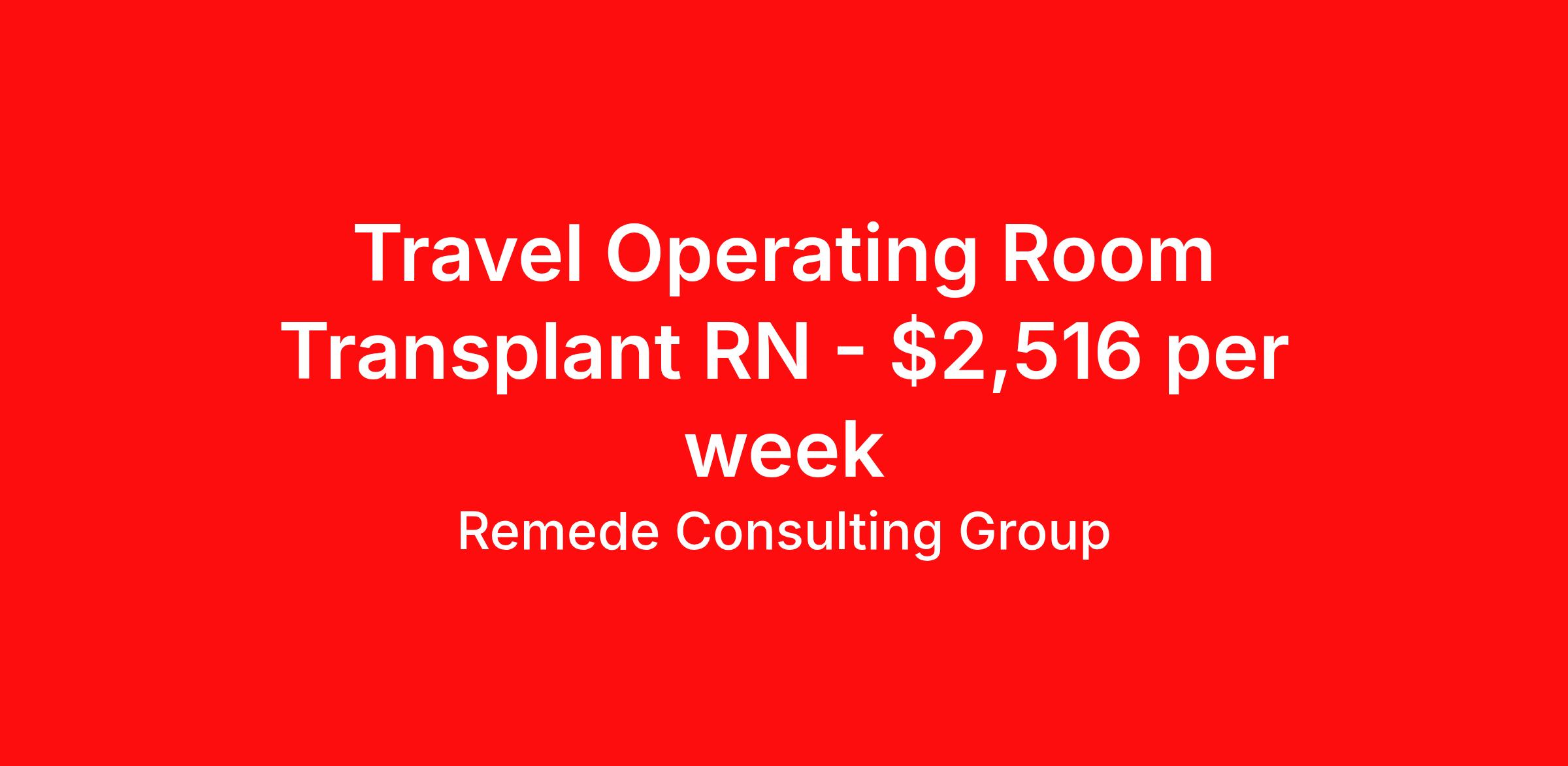 Remede Consulting Group is seeking a travel nurse RN OR - Operating Room for a travel nursing job in Weston, Florida. Job Description & Requirements Specialty: OR - Operating Room Discipline: RN Start Date: ASAP Duration: 13 weeks 40 hours per week Shift: 10 hours, days Employment Type: Travel Years of experience REQ: 2 years of direct LIVER/TRANSPLANT OR RN experience required First-timers accepted: (Y/N) Y Certs REQ: ACLS, BLS (must have at time of submittal), NIHSS (must obtain prior to start) MUST HAVE STRONG LIVER, HEART, LUNG & KIDNEY TRANSPLANT EXPERIENCE REFLECTED ON SKILLS CHECKLIST. MUST BE PROFICIENT IN MISONIX/CUSA. CANDIDATES MUST HAVE EXPERIENCE PUTTING ORGANS BACK IN THE NEW PATIENT, NOT JUST HARVESTING.Charting: EPIC Remede Consulting Group Job ID NOV2025-CC374. Pay package is based on 10 hour shifts and 40 hours per week (subject to confirmation) with tax-free stipend amount to be determined. About Remede Consulting Group We Believe in the Power of People We believe that people who care can transform the world. And healthcare professionals like you are doing just that. At. Remede, our mission is to empower your facility to provide, safe, high-quality care to those who need it most.If you are a professional ready to make your next big move, Remede is your trusted partner & loyal advocate. Remede Puts the “Care” in Career As a dedocated healthcare professional who brings a wealth of knowledge, expertise and credentials, you deserve to work with a partner who recognizes and values your expertise. That’s’s why we connect you with top facilities that demonstrates a culture of appreciation and reward you for your incredible commitment to your patients. We have plenty of opportunities for the taking – start your journey with Remede today. With the Right People Amazing Things Happen Building genuine, long lasting relationships with healthcare professionals is at the core of everything we do. We take the time to understand your unique needs and design customized solutions work for you. Benefits License and certification reimbursement Life insurance Referral bonus Weekly pay