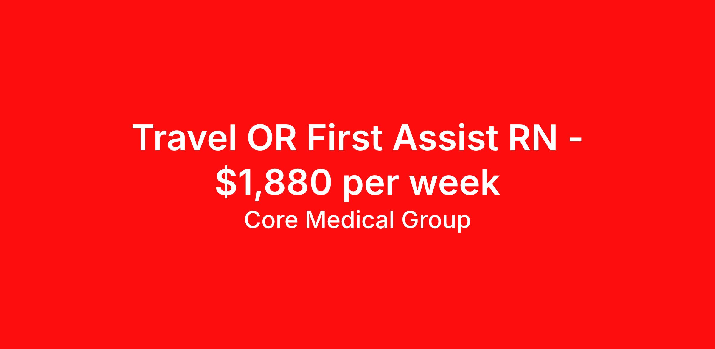 Core Medical Group is seeking a travel nurse RN First Assist for a travel nursing job in St. Louis, Missouri. Job Description & Requirements Specialty: First Assist Discipline: RN Start Date: 03/24/2026 Duration: 13 weeks 36 hours per week Shift: 12 hours Employment Type: Travel Core Medical Group Job ID 1325602. Pay package is based on 12 hour shifts and 36 hours per week (subject to confirmation) with tax-free stipend amount to be determined. Posted job title: RN About Core Medical Group CoreMedical Group is one of the largest healthcare staffing agencies in the country. We have jobs nationwide in travel nursing, travel allied health, interim, locum tenens, and permanent placements! Join the staffing agency with Club CoreMed, the best perk in the industry - an all inclusive paid trip to a tropical resort! Benefits Weekly pay Holiday Pay Guaranteed Hours Continuing Education 401k retirement plan Pet insurance Company provided housing options Sick pay Wellness and fitness programs Mileage reimbursement Referral bonus Employee assistance programs Medical benefits Dental benefits Vision benefits Benefits start day 1 License and certification reimbursement Life insurance Discount program