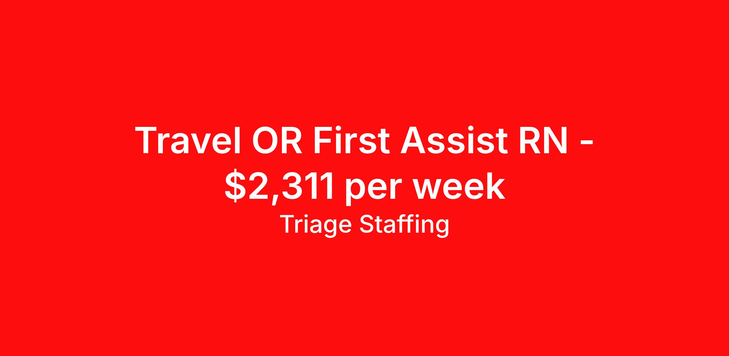 Triage Staffing is seeking a travel nurse RN First Assist for a travel nursing job in Saint Louis, Missouri. Job Description & Requirements Specialty: First Assist Discipline: RN Start Date: ASAP Duration: 13 weeks 36 hours per week Shift: 12 hours, days Employment Type: Travel Travel Nursing: Registered Nurse First Assistant Saint Louis Location: Saint Louis Start Date: 10/27/2025 Shift Details: 12H Days 36 hours per week Length: 13 WEEKS Apply for specific facility details.RNFA Triage Staffing Job ID RE99QQEN. Posted job title: Nursing: Registered Nurse First Assistant About Triage Staffing At Triage, we prefer to be real . Real about expectations—both ours and yours. Real about how a decision you make today could affect your tomorrows. Real about how compensation actually works. Real about how great—or grating—your next supervisor may be. Being real allows everyone at Triage to be ready . Ready to serve you with real honesty. So if that gig near the ocean is really no day at the beach, or that third shift comes with a second-class rate, we tell you. So you can be ready, too. We staff all five major divisions of acute care—nursing, lab, radiology, cardiopulmonary and rehab therapy, offering: - Competitive, custom pay packages - One point of contact for both travelers and facilities (per division) - A reliable recruiter who's got your back throughout your entire assignment - In-house compliance and accounting specialists - A clinical liaison team available 24/7 to offer medical and professional support and career development - A mentoring program that is run and managed by actual clinicians—yeah, you read that right - And more (because of course there’s more) Are we the biggest? No. Are we the best? That’s rather subjective, but we’re trying to be. Will we work like hell to get you as close to your idea of heaven as possible? Yes. Yes, we will. Benefits: Day One comprehensive, nationwide insurance plans for health, vision and dental and life—including a HSA option Day One 401(k) program with employer-matching contributions once eligible Facility cancelling protection—your time is money on and off-the-clock Guaranteed hours Weekly paychecks via direct deposit Earned vacation bonuses for time worked Paid holidays Employee assistance program (EAP)—your mental health is important, too Continuing education, certification and licensing reimbursement Workers comp—because accidents happen Top-rated professional liability insurance Company provided housing options Referral bonus—$750 in your pocket after they’ve completed a 13-week assignment