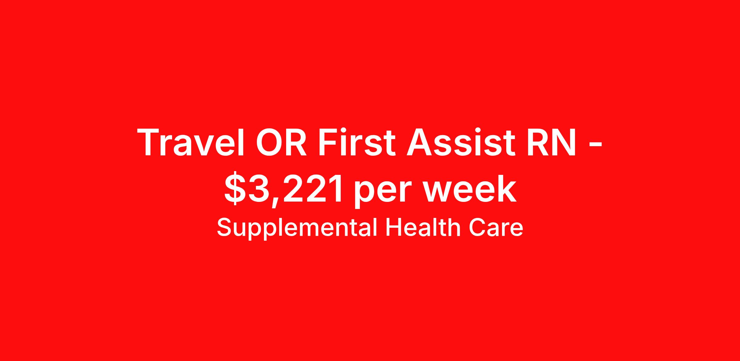 Supplemental Health Care is seeking a travel nurse RN First Assist for a travel nursing job in Madera, California. Job Description & Requirements Specialty: First Assist Discipline: RN Start Date: ASAP Duration: 13 weeks 40 hours per week Shift: 10 hours, days Employment Type: Travel Job Description: Supplemental Health Care is connecting First Assist, OR Registered Nurses with top-tier hospital contracts in Madera, California. Travel or stay local, either way, we’ll guide you to an opportunity that matches your goals, offering excellent pay, benefits, and support. Qualifications: Current California Registered Nurse License / Certification American Heart Association BLS 1 to 2 years of recent First Assist, OR experience First Assist, OR Registered Nurse Contract Details: $2,992 - $3,221 per week* Weekly pay 13-week full-time contract with possibility to extend AM shifts available 40 hours per week *Estimated weekly payment may include both taxable wages and tax-free reimbursements for meals, housing, and incidentals. Please speak with a recruiter for details. What We Offer: Full medical, dental, vision, life, and even pet insurance! Round the clock support. No matter where you are or what time it is, Supplemental Health Care is standing by. SHC's Share the Care referral program is the most dynamic, profitable referral program in the industry. 401(k) Retirement Savings Program with a wide range of investment options. Discounted and free online access to CEU courses through Supplemental University. Apply now to launch your next First Assist, OR Registered Nurse assignment, or ask our team about other exciting Registered Nurse opportunities. Supplemental Health Care is an Equal Opportunity Employer. All candidates, including veterans and those with disabilities, are encouraged to apply. SHC will consider for employment qualified applicants with criminal histories in a manner consistent with the requirements of applicable local, state, or federal law. To learn more, visit www.shccares.com/eeo Supplemental Health Care Job ID 1471758. Pay package is based on 10 hour shifts and 40 hours per week (subject to confirmation) with tax-free stipend amount to be determined. Posted job title: First Assist, OR Registered Nurse About Supplemental Health Care At Supplemental Health Care, a simple belief in the power of caring guides a unique commitment to world-class service in healthcare staffing. For 40 years, we’ve supported talented professionals pursuing their life calling in hospitals, schools, home health, corrections, behavioral health, and other settings. At SHC, we inspire vital connections and enrich lives and inspire better outcomes. As recipients of the Best in Staffing Awards for both Client and Talent, Supplemental Health Care is proud to be among only 2% of staffing companies singled out for the distinction based on the real feedback of our employees and the clients we serve. SHC has also earned The Joint Commission’s Gold Seal of Approval and is named among the Largest Health Care Staffing companies in the United States by Staffing Industry Analysts. We are also thrilled to recognize our very own SLP, Dr. Kelly Byrd as the American Staffing Association 2024 National Staffing Employee of the Year and Health Care Sector All-Star. We’re honored to connect Dr. Byrd to employment, share her incredible story, and support her family literacy nonprofit. For everyone that we serve, SHC is the place where caring hearts thrive. Benefits Referral bonus Benefits start day 1 401k retirement plan Continuing Education Discount program Health savings account