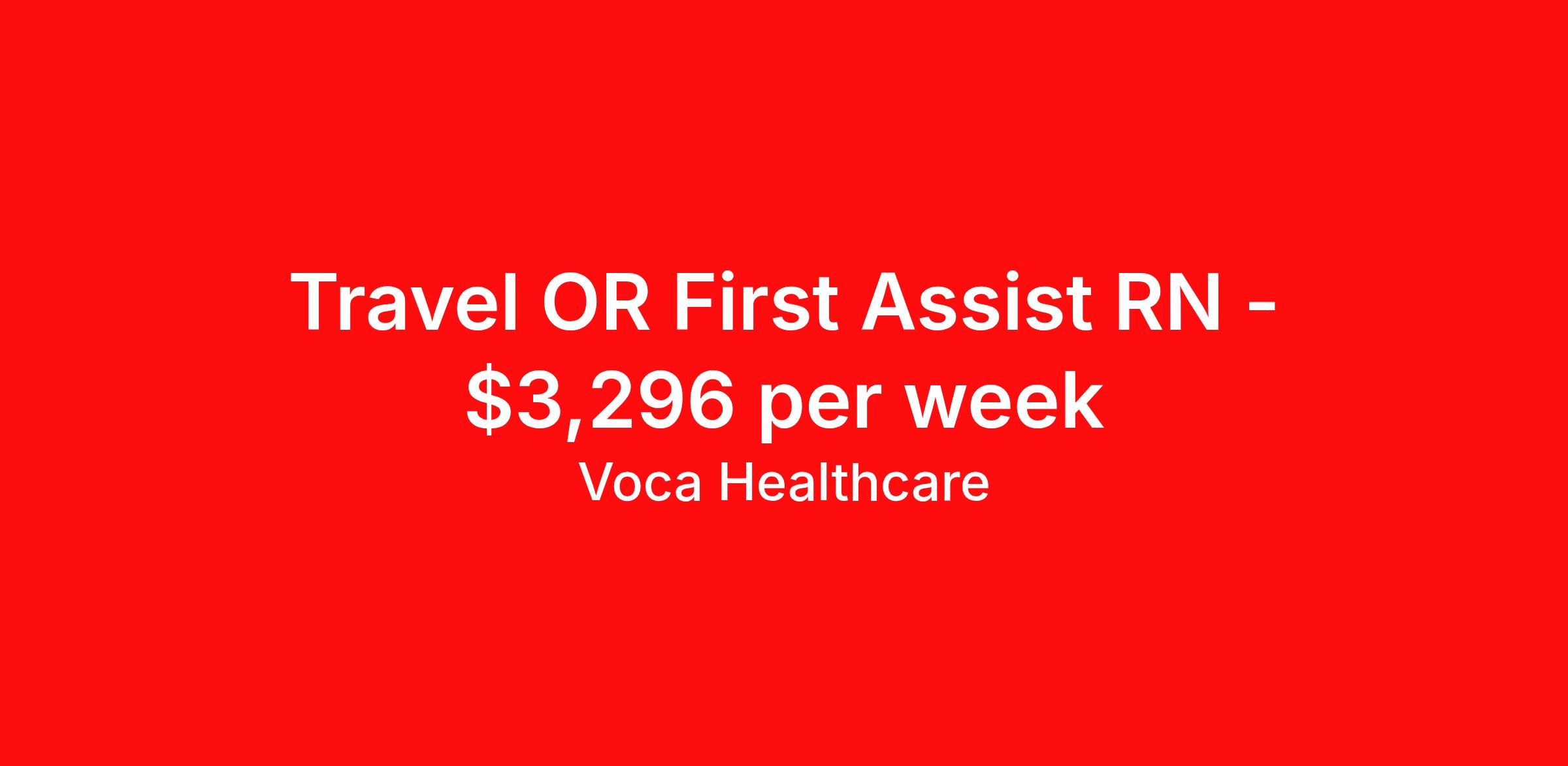 Voca Healthcare is seeking a travel nurse RN First Assist for a travel nursing job in Pittsfield, Massachusetts. Job Description & Requirements Specialty: First Assist Discipline: RN Start Date: 04/13/2026 Duration: 13 weeks 40 hours per week Shift: 8 hours, days Employment Type: Travel Benefits available on 1st of the month after start: Holiday pay Weekly pay Retention bonus 401k retirement plan Medical benefits Dental benefits Vision benefits Referral bonus Are you an experienced First Assist RN looking for your next exciting travel assignment, or are you ready to start your travel healthcare career? At Voca, we offer an unmatched experience for healthcare professionals with a travel-first culture that prioritizes your needs and supports your career growth. We understand that every traveler is unique, which is why we provide personalized support from our experienced team of recruiters who are dedicated to matching you with the right assignments. Join Voca today, where you will enjoy a rewarding career and a full suite of benefits designed to ensure your success and well-being. As a First Assist RN with Voca, you’ll have the opportunity to work in dynamic healthcare settings, gaining valuable experience while receiving competitive compensation and support every step of the way. Qualifications : -Minimum of 2 years of recent experience as a First Assist RN preferred, but we are open to exceptional candidates with a strong passion. -Valid certification and/or licensure in the state of practice, if applicable. -Demonstrated ability to maintain a high level of professionalism and composure, especially during stressful and fast-paced moments in the healthcare setting. -Valid Driver’s License and the ability to travel between assignment locations. -Ability to pass a background check and drug screen to meet healthcare industry standards. Why Choose Voca? -Comprehensive Benefits Package: We offer Health, Dental, and Vision Insurance to ensure that you and your loved ones are well taken care of. -Life and Disability Insurance for added peace of mind. -401(k) options to help you save for your future with employer matching. -Certification and Licensure Reimbursement to support your professional development. -Generous Referral Bonus Program – earn rewards for referring your qualified peers to join the Voca team. -Weekly Direct Deposit ensures timely access to your earnings. At Voca, You Are Our Priority : -Travel-First Culture: We understand that travel assignments offer unique challenges, so we ensure a flexible and supportive work environment that focuses on your success. -Personalized Support: Work with a dedicated recruiter who will be your advocate throughout your journey, helping you navigate each assignment and providing personalized guidance to ensure your goals are met. -Strong Relationships: Voca’s culture fosters long-term relationships with our travelers. -We care about your career, your needs, and your future. Whether you're a seasoned First Assist RN or ready to take the next step in your travel healthcare career, Voca is the perfect place for you to grow, learn, and thrive. Apply today to connect with one of our talented recruiters and begin your next adventure! Apply Now to get started on your next travel assignment with Voca – where your career and well-being come first! Voca Healthcare Job ID 17834527. Pay package is based on 8 hour shifts and 40.0 hours per week (subject to confirmation) with tax-free stipend amount to be determined. Posted job title: RN:RNFA,08:00:00-16:00:00 About Voca Healthcare As a Voca Traveler, you will gain new clinical skills, visit amazing places and meet awesome healthcare professionals. As a travel health professional, your experience and dedication to patient care is in high demand throughout the United States. Whether you are a veteran traveler looking for your next opportunity, or you are looking to travel for the first time, Voca is here to support you. Voca’s experienced and dedicated travel team works in concert with you every step of the way. Our long-standing partnerships with some of the most respected and recognized healthcare organizations in the country allow us to identify career opportunities to help you increase your knowledge and experience while working with some of the best physicians and healthcare professionals in the world. At Voca, we strongly believe a better career results in a happier you. We are here to help you find a position that is professionally and personally rewarding. Benefits Holiday Pay 401k retirement plan Medical benefits Dental benefits Vision benefits Guaranteed Hours