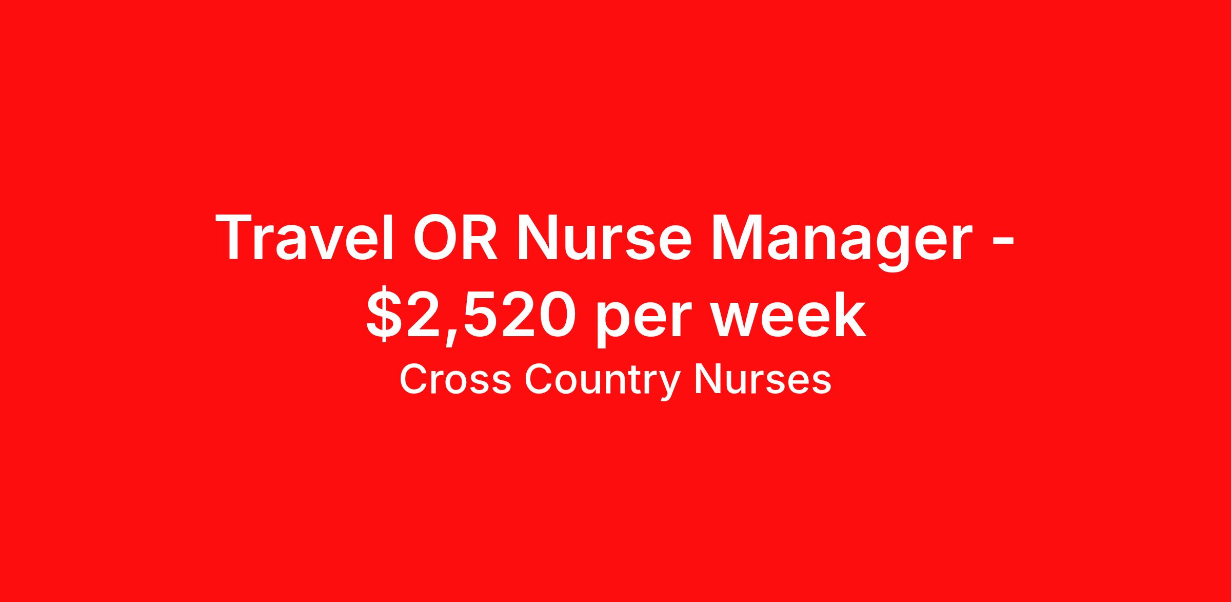 Cross Country Nurses is seeking a travel nurse RN Manager, OR - Operating Room for a travel nursing job in Rockford, Illinois. Job Description & Requirements Specialty: OR - Operating Room Discipline: RN Start Date: 04/06/2026 Duration: 13 weeks 40 hours per week Shift: 8 hours, nights Employment Type: Travel Job Description As a registered nurse (RN), you will provide care for patients dealing with illness or injury. Depending on your role, you'll work at a hospital, outpatient center, private practice, home health, telemedicine, nursing facility, clinic or other facility. You'll perform tasks like assessing patients, developing care plans, administering medication, providing treatment, assisting with surgery, changing bandages, monitoring vitals and maintaining records. You'll also provide continued support and education to patients, promoting their overall health and ensuring they have the tools to recover and prevent further health issues. Minimum Requirements At least 1 year of recent acute care experience in specialty Active RN license Benefits The benefits of taking a travel nursing job with Cross Country include: Private housing or generous housing allowance Comprehensive health insurance with prescription coverage Dependent health insurance with prescription coverage Competitive salaries Referral bonuses Travel reimbursement 401(k) retirement plan Direct deposit/free checking Unlimited free CE credits Cross Country Job ID 1236698. Pay package is based on 8 hour shifts and 40 hours per week (subject to confirmation) with tax-free stipend amount to be determined. Posted job title: Registered Nurse / Nurse Manager OR / Surgical Services About Cross Country Nurses You care for others — we’re here to care for you. At Cross Country, we know travel nursing is about more than just the job. It’s about building a career that supports your lifestyle, your values, and your impact. We offer competitive pay, full benefits, and 24/7 support from a team that truly understands what it means to be on the front lines. Wherever your journey takes you, we’re with you every step of the way. Let’s build your best life — one assignment at a time. Benefits 401k retirement plan Referral bonus