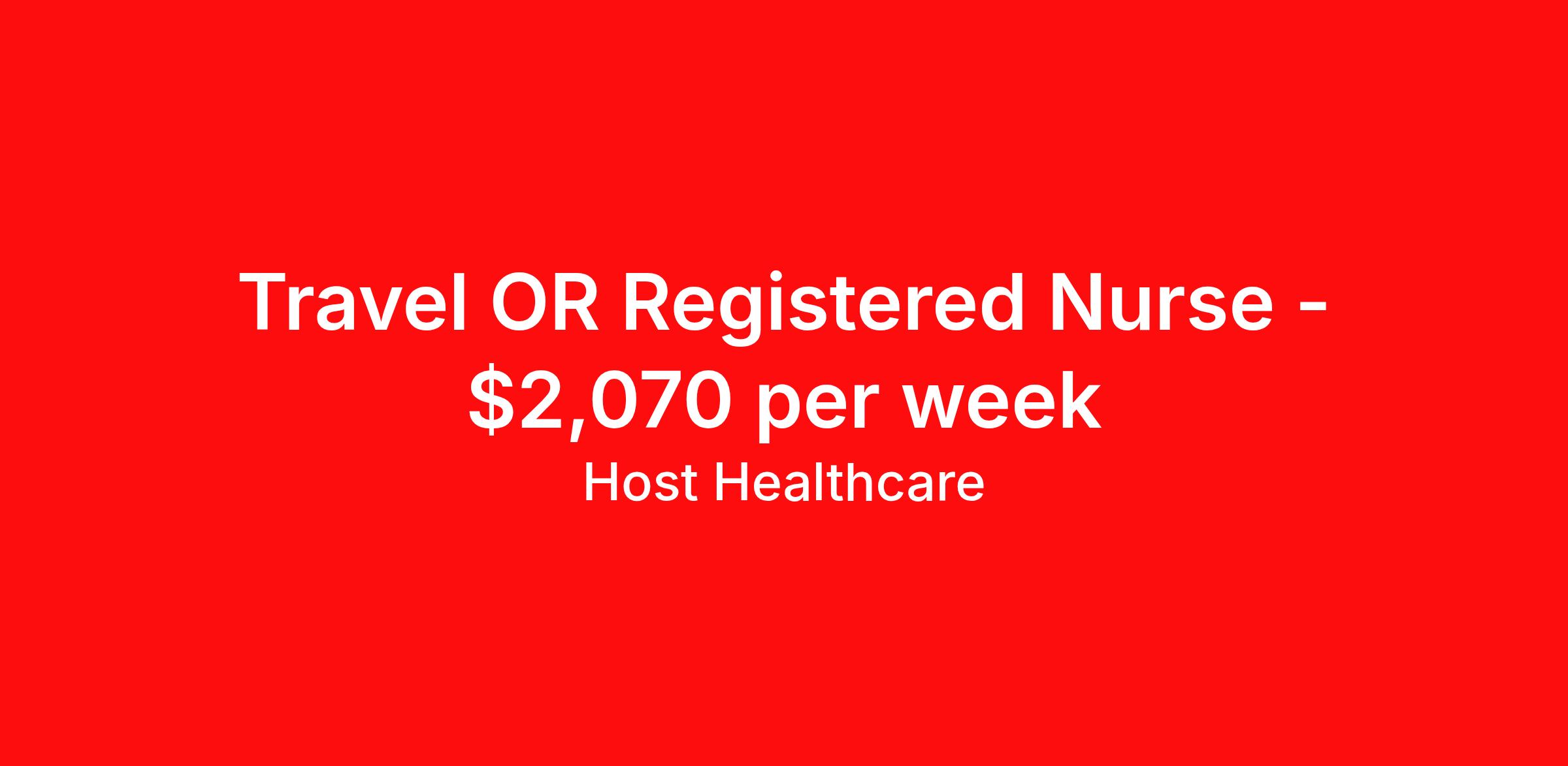 Host Healthcare is seeking a travel nurse RN OR - Operating Room for a travel nursing job in Sioux City, Iowa. Job Description & Requirements Specialty: OR - Operating Room Discipline: RN Start Date: 04/13/2026 Duration: 13 weeks 40 hours per week Shift: 8 hours Employment Type: Travel Host Healthcare Job ID a1fVX000002yYbxYAE. Pay package is based on 8 hour shifts and 40 hours per week (subject to confirmation) with tax-free stipend amount to be determined. Posted job title: RN - Operating Room About Host Healthcare At Host Healthcare, we provide a truly comfortable experience as you explore your travel nursing, therapy, or allied career. We make your travel healthcare journey easy by taking care of all the details, so you don’t have to. We are on a mission to help others live better and we do this by helping the healers of the world be as comfortable as possible. With access to tens of thousands of travel nursing, therapy, and allied jobs in all 50 states, our responsive and friendly recruiters find your dream position based on what’s important to you. During your assignment, get access to premium benefits, including Day 1 medical that continues up to 30 days between assignments, 401K matching, travel reimbursements, dedicated housing support, and more. We also offer 24/7 support from our team and access to our on-staff clinicians so you can feel comfortable and confident throughout your entire assignment. Travel comfortably with Host Healthcare. Benefits Referral bonus School loan reimbursement Vision benefits Wellness and fitness programs Company provided housing options License and certification reimbursement Life insurance Medical benefits Mileage reimbursement Pet insurance Discount program Employee assistance programs Guaranteed Hours Health savings account Holiday Pay 401k retirement plan Continuing Education Dental benefits